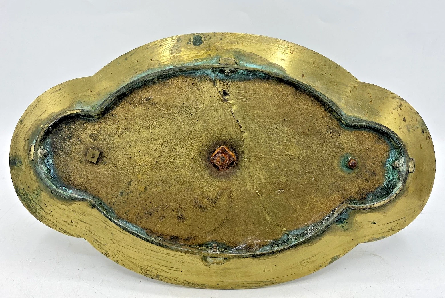 - The Base: The tray is a tri-lobed or “shaped” oval with a wide, decorative border featuring a repeating anthemion (honeysuckle) pattern. The underside shows a rough, sand-cast texture and a central nut-and-bolt assembly typical of 19th-century manufacturing.