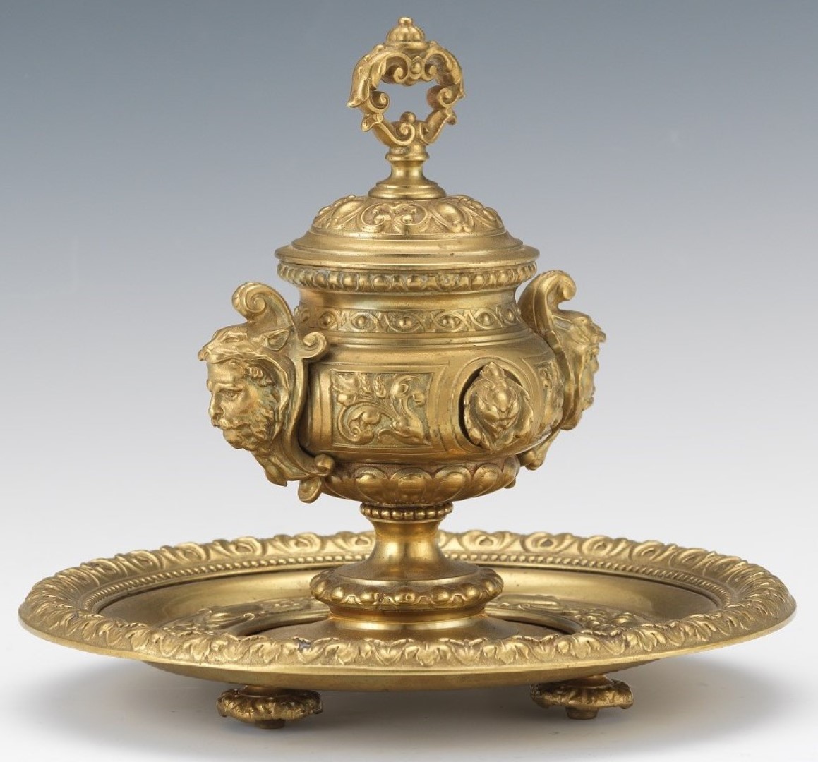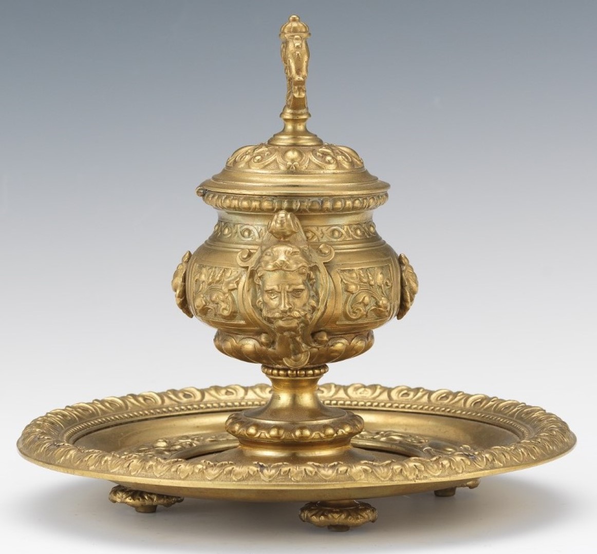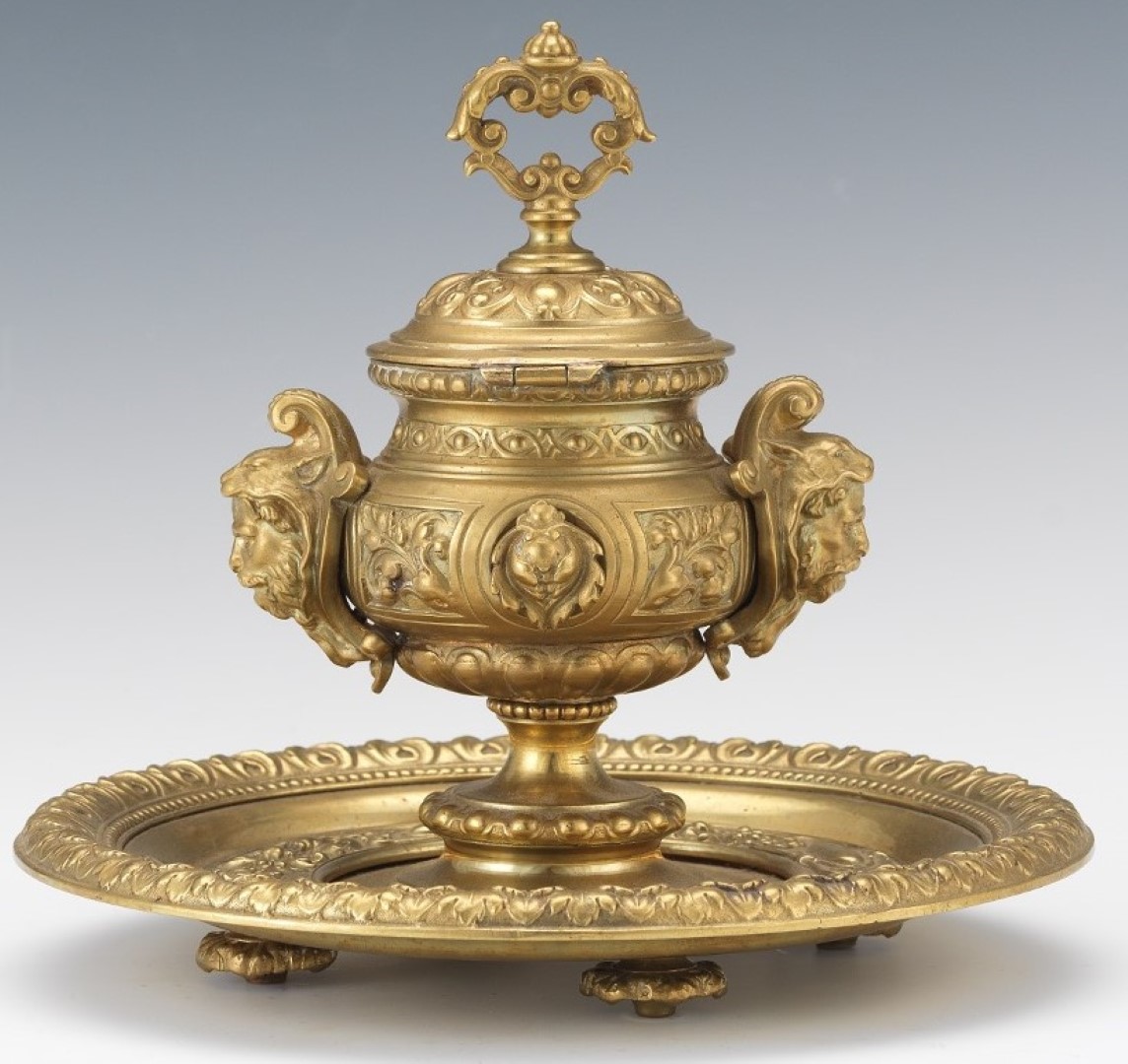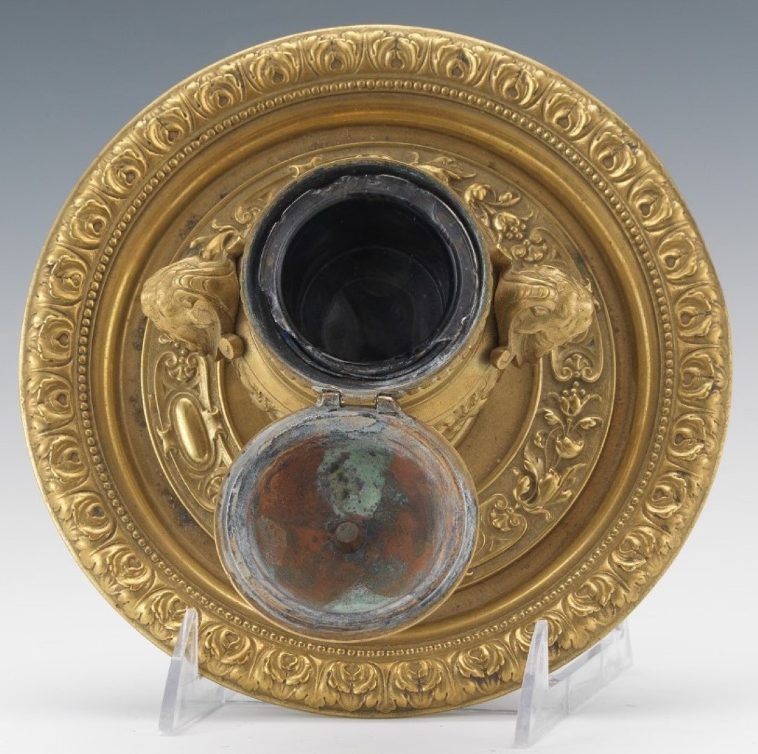 Urn form brass inkwell with hinged lid and glass insert. Decorated in the Baroque style with double handles stylized as classical heroes. The urn is mounted atop a stepped saucer base with an bead and acanthus design around the rim.