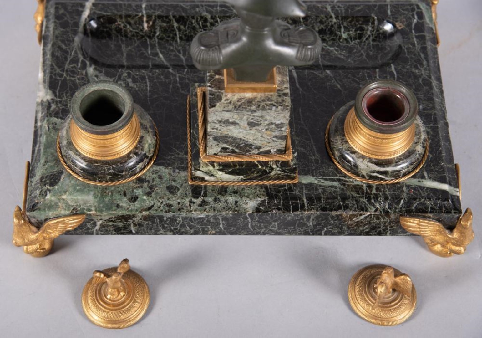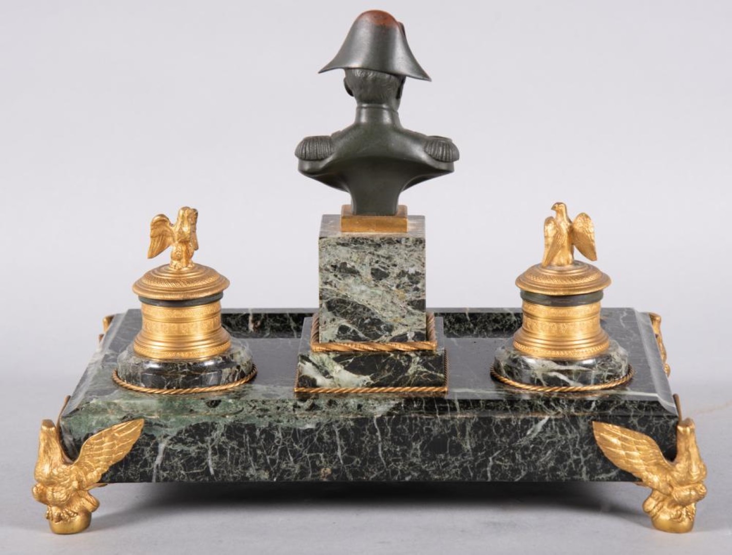 Green marble inkstand with bronze mounts. The base is held by four Napoleonic eagles to each corner, the inkwells with gilt metal appliques and eagle finials, with a central columnar pedestal and bust of Napoleon.