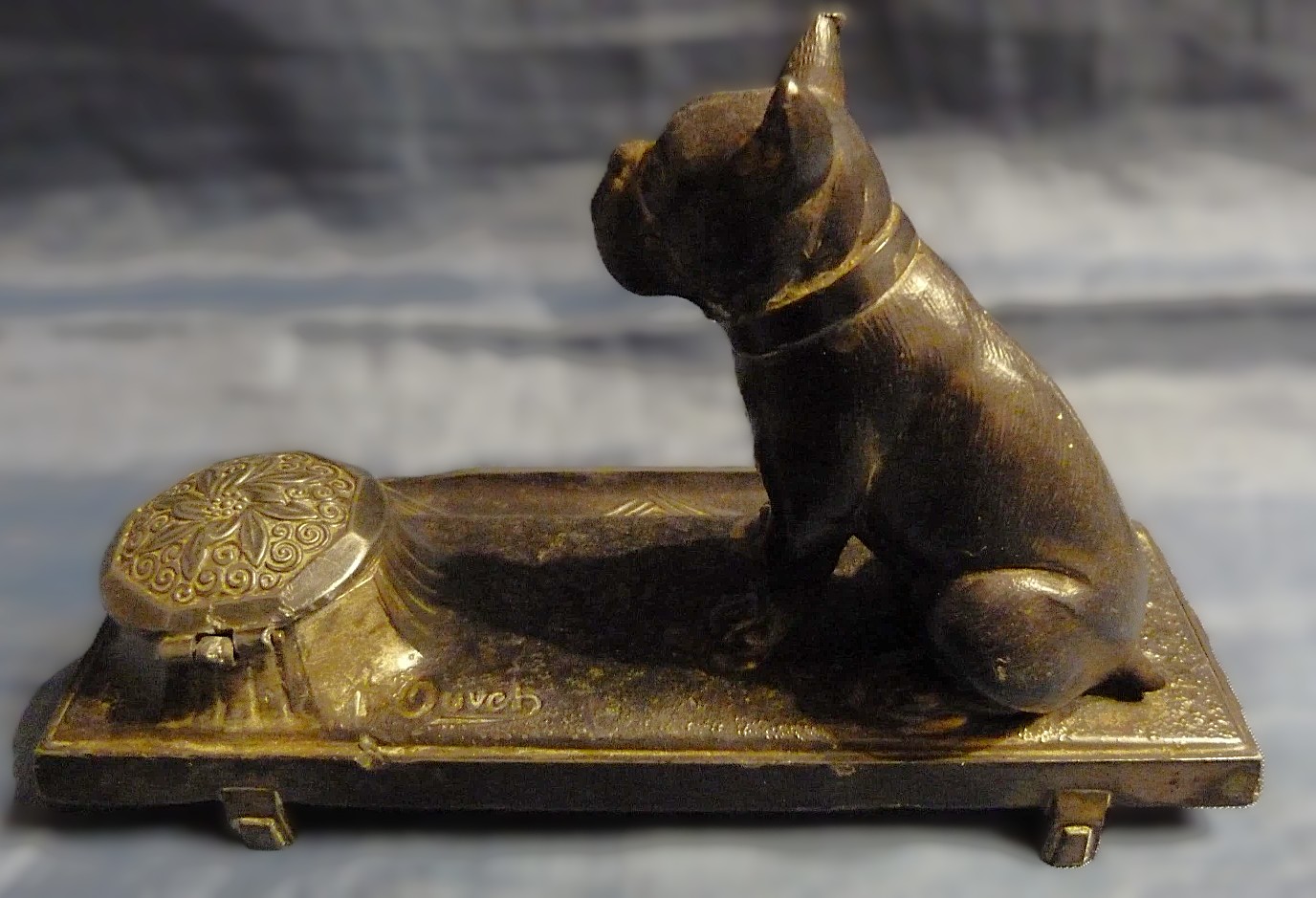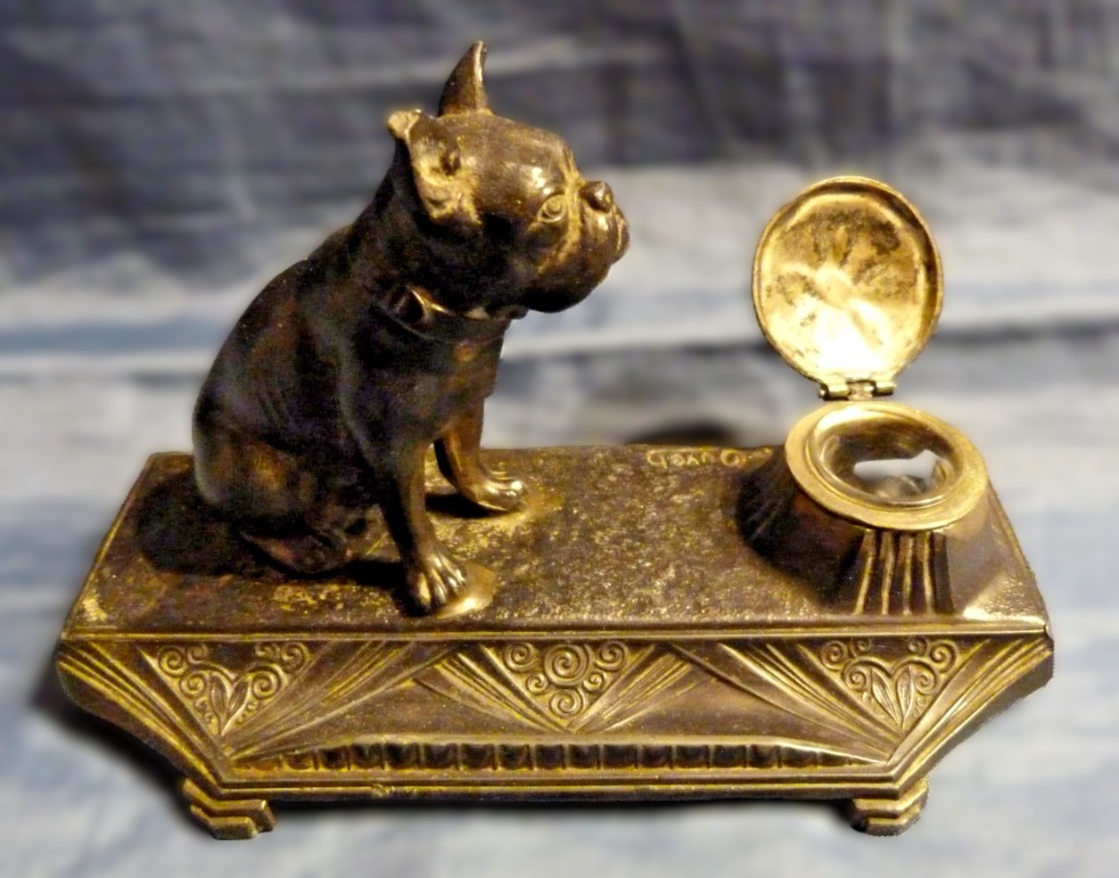 - Design Elements: The base features striking Art Deco geometric patterns—stepped edges, stylized fans, and scroll motifs—which perfectly complement the figural dog. The inkwell lid has a floral repoussé design, and it has its original glass insert.