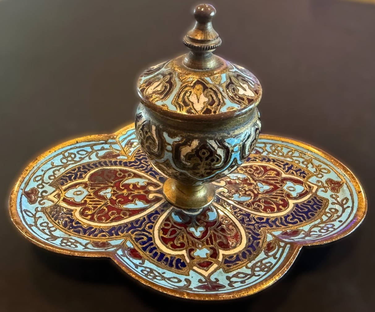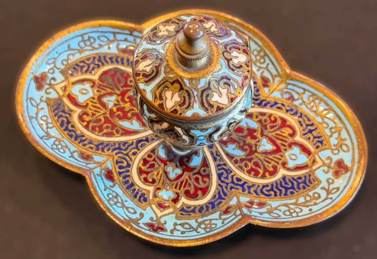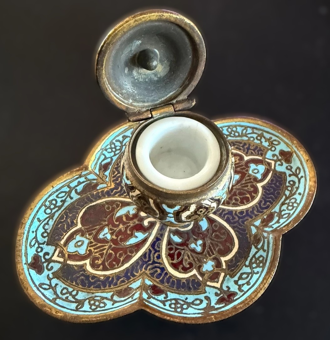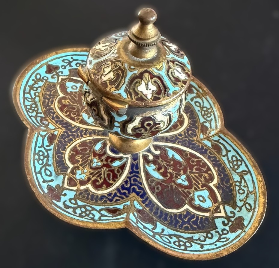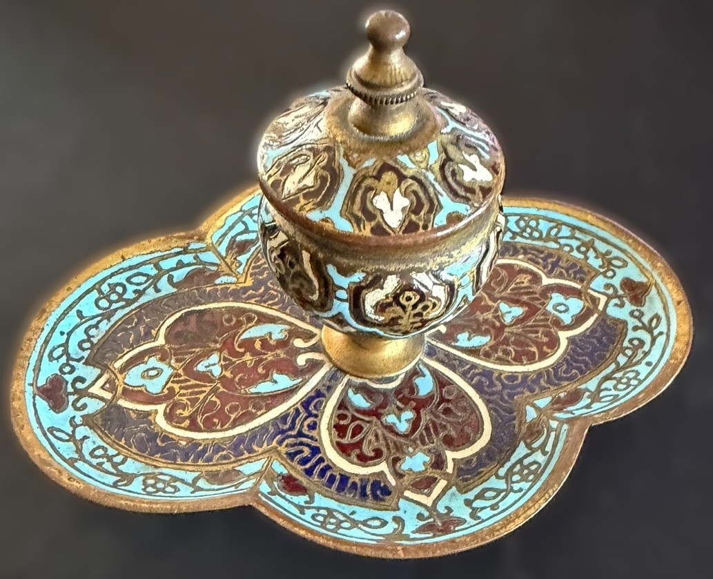 • Design Motifs: The patterns are a blend of arabesque and floral motifs, typical of the “Orientalist” and “Japonisme” trends popular in France at the time. The base features stylized leaf designs within the lobes, while the ink pot itself is adorned with repeating geometric and foliate bands.