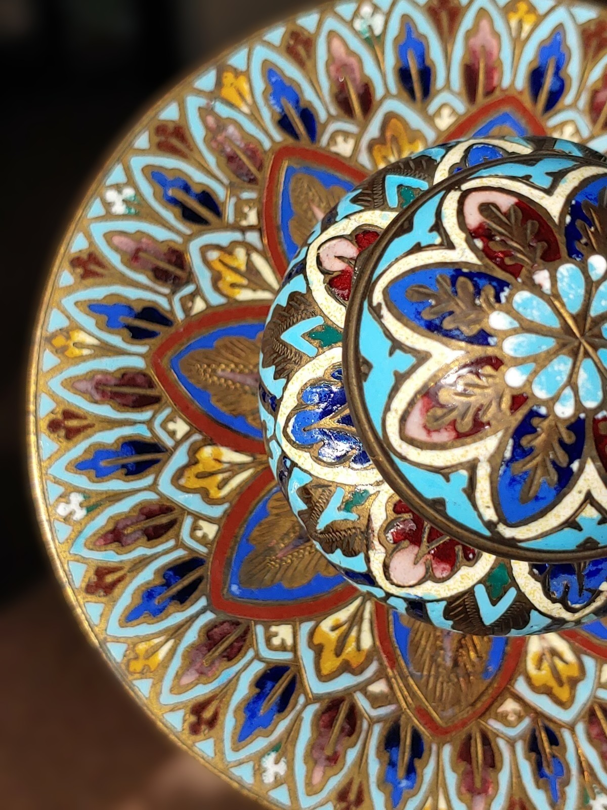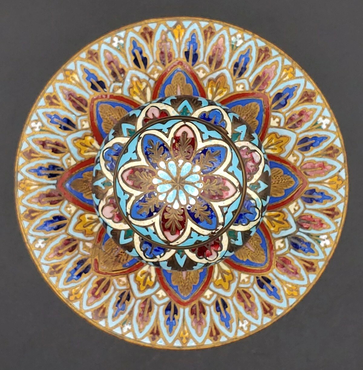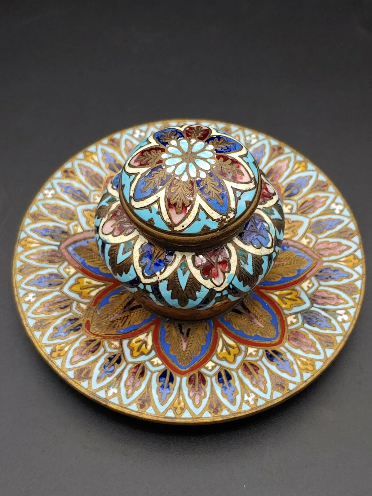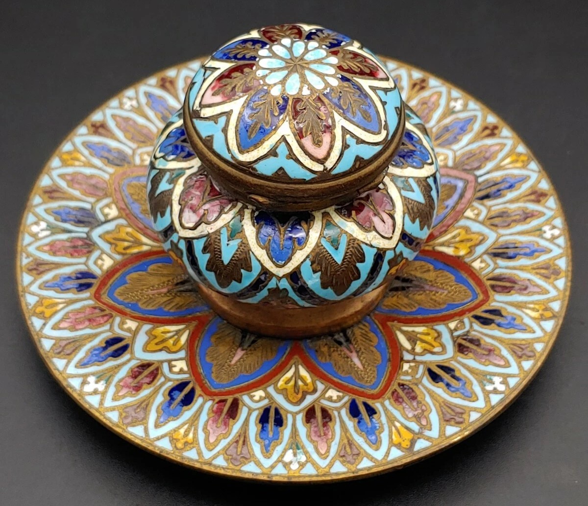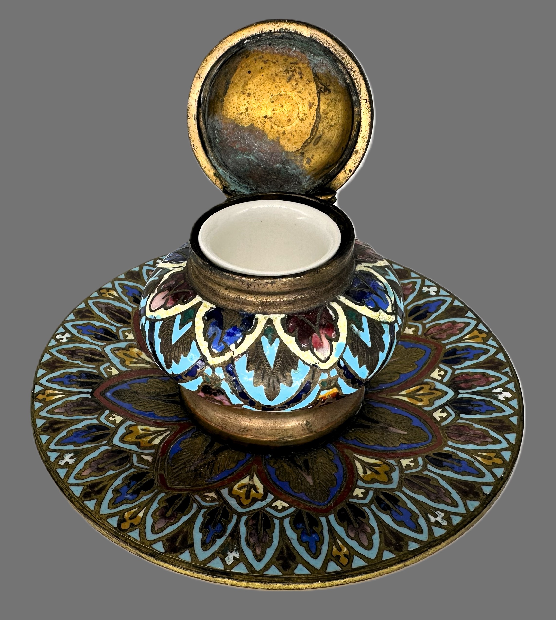 This inkwell lacks the wire partitions characteristic of cloisonné, and the enamel is flush with the metal surface—hallmarks of champlevé. The dense, symmetrical floral motifs and the color palette are consistent with late 19th-century French production.
