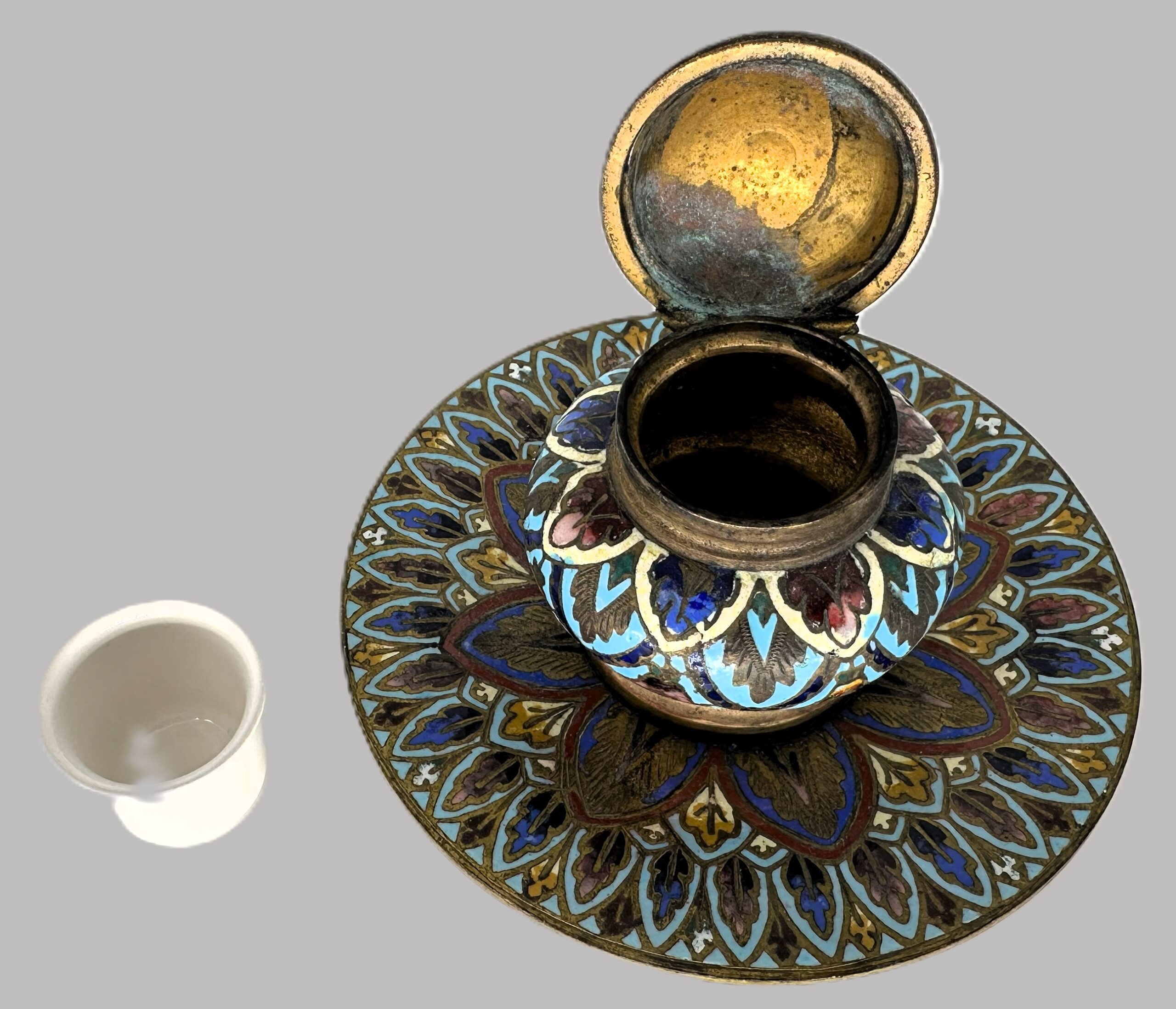 This ornate inkwell is an example of champlevé enameling, a technique in which depressions are carved or cast into a metal surface—typically bronze or brass—and then filled with vitreous enamel, fired to fuse, and polished to a smooth finish. The result is a richly colored, durable surface where the uncarved metal remains visible, forming elegant outlines and frames for the enamel designs.