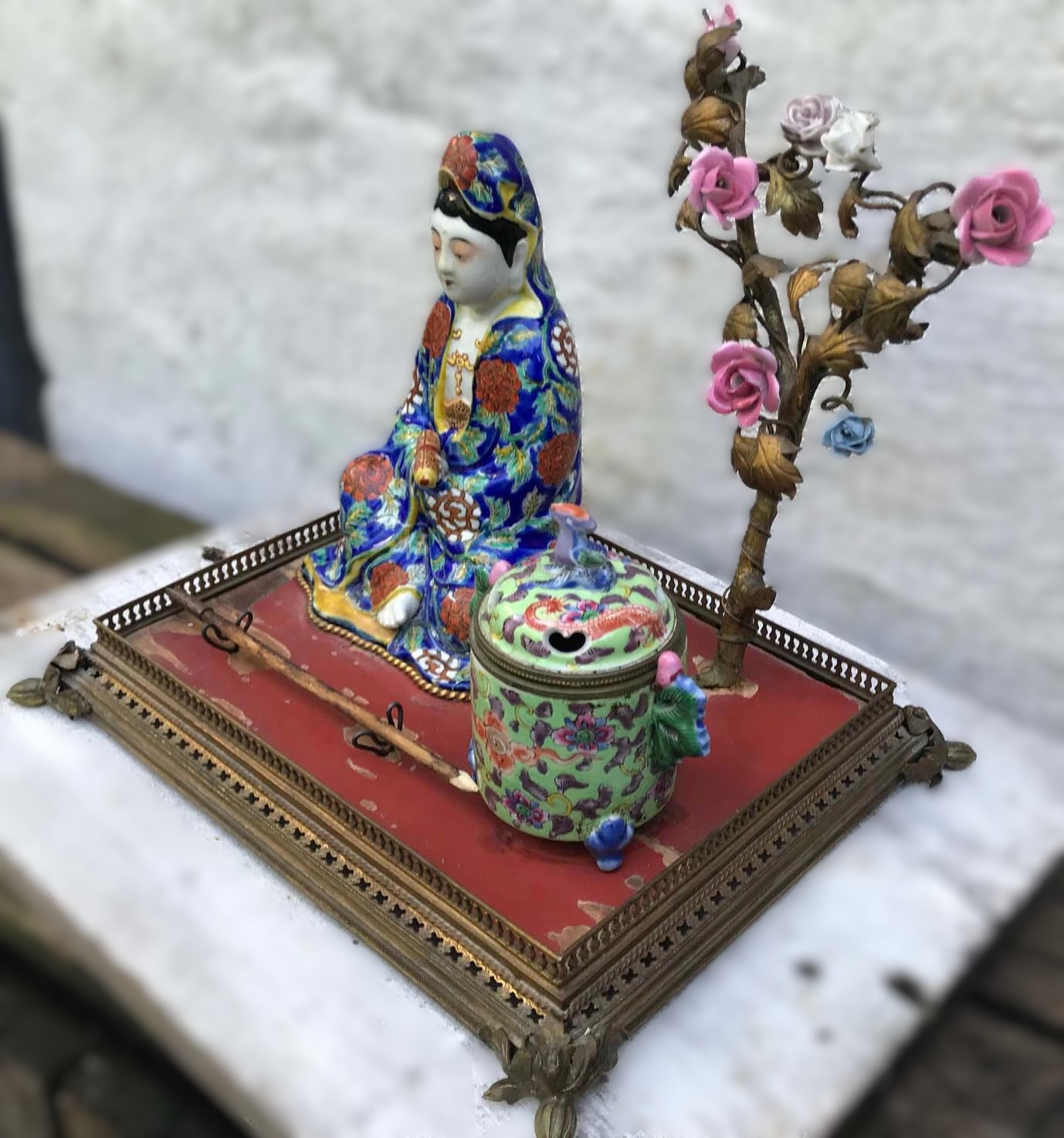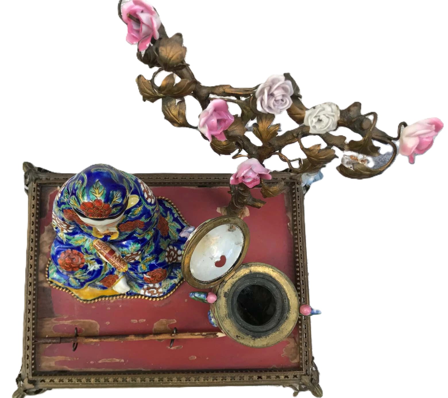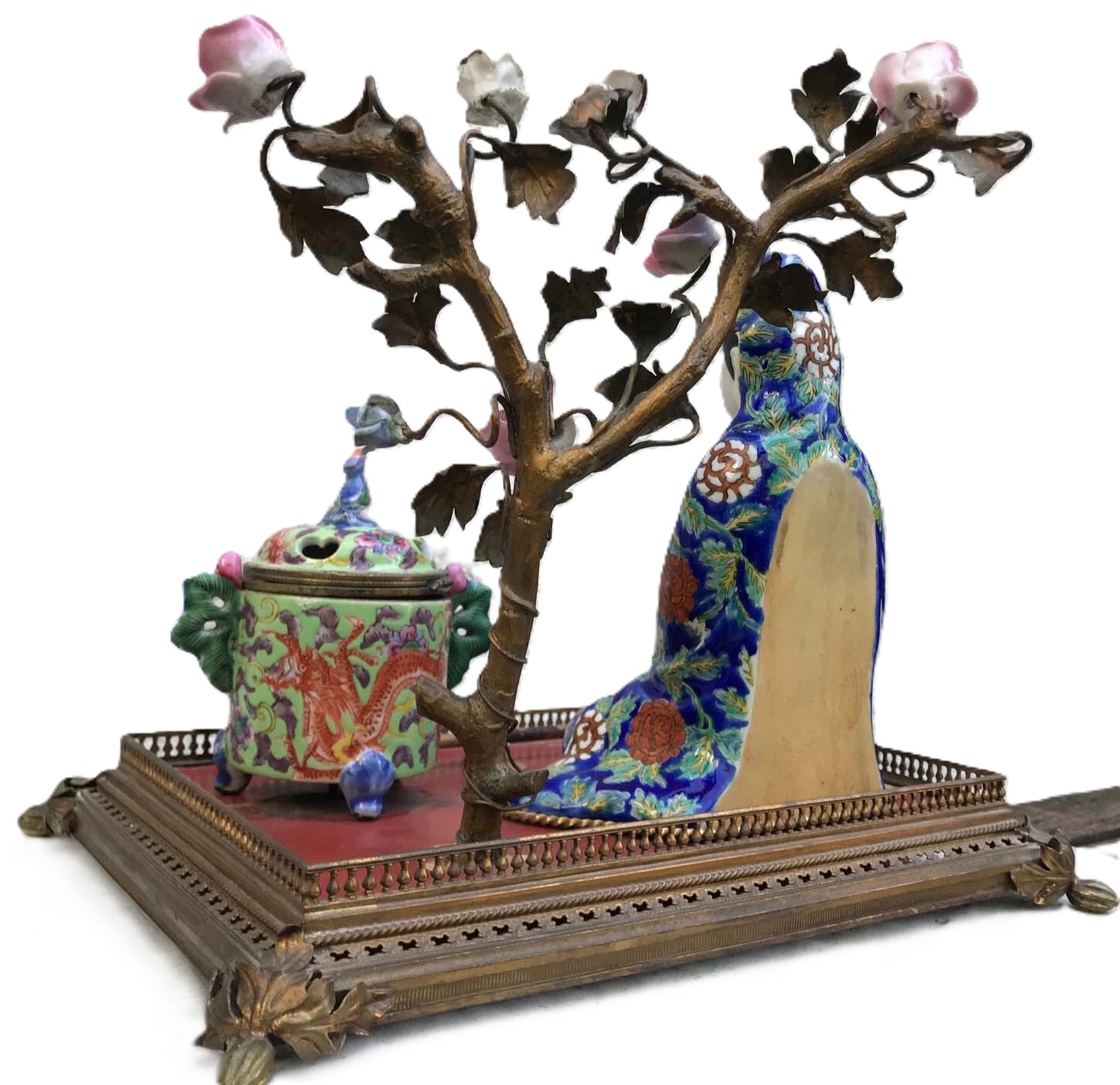 - Covered Inkwell: On the right side of the base is a cylindrical covered inkwell made of porcelain. The inkwell is decorated with a vibrant and detailed design featuring floral motifs in shades of pink, green, and other colors, outlined in gold. The lid of the inkwell is domed, topped with a finial resembling a rat.