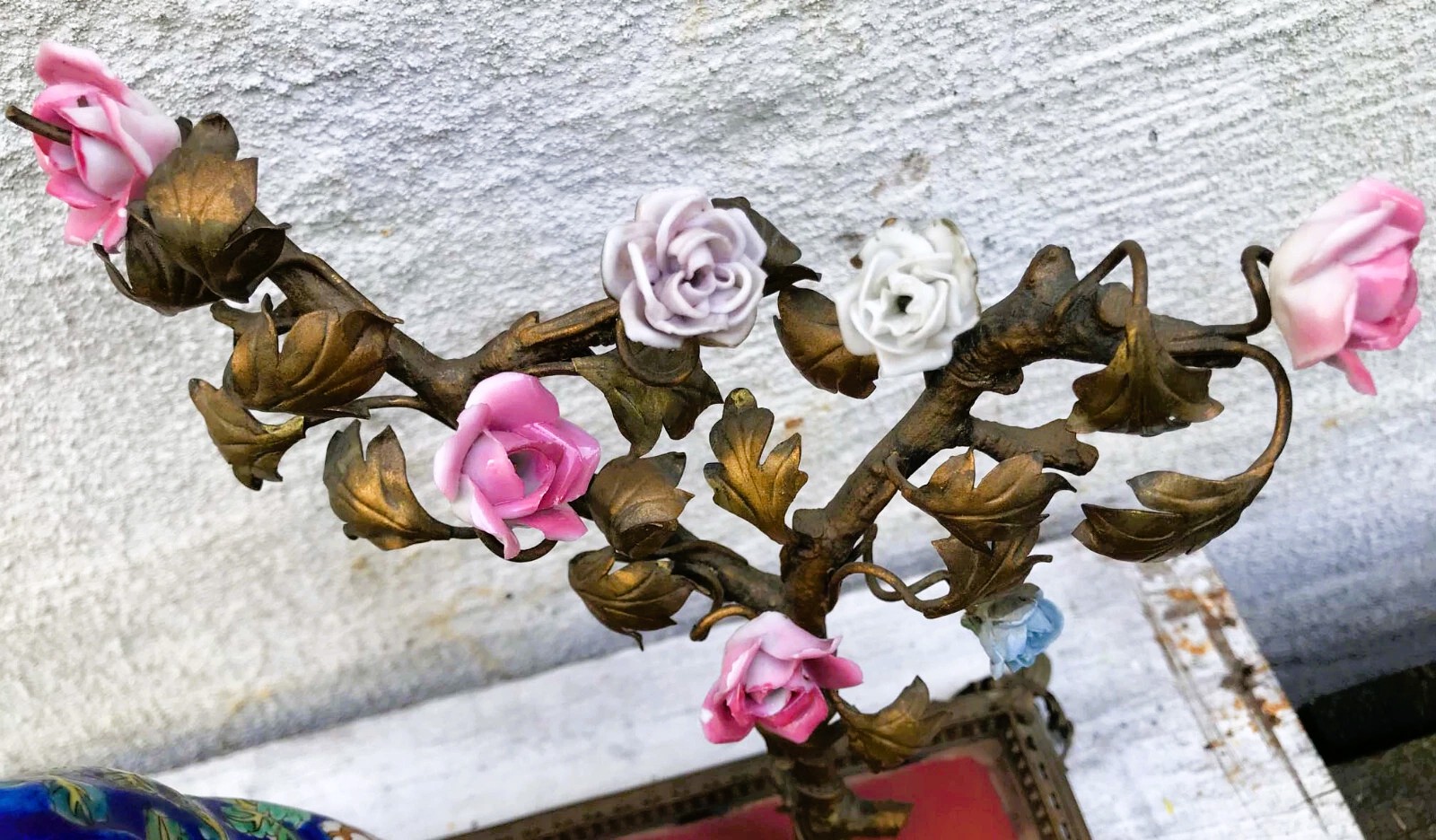 - Metal Tree with Porcelain Flowers: In the background, rising from the base, is a stylized tree or branch made of bronze. Attached to the branches are delicate, porcelain flowers in various colors, including pink, white, and blue.