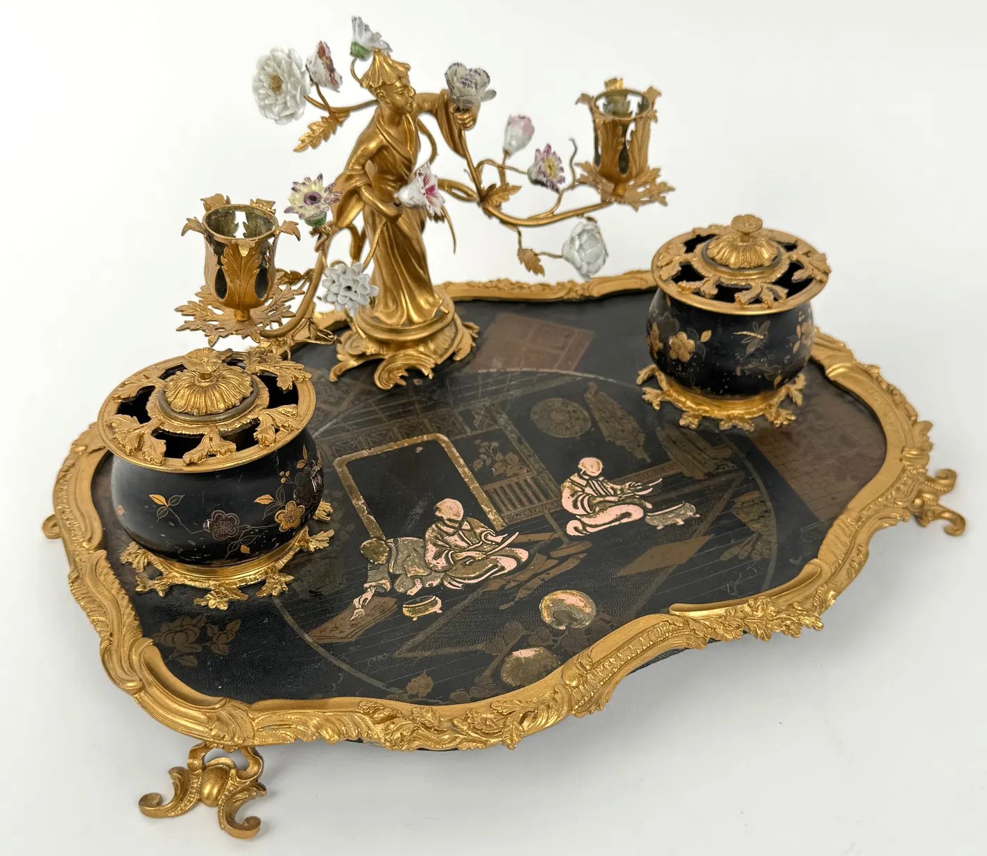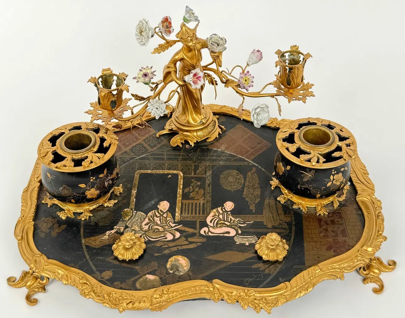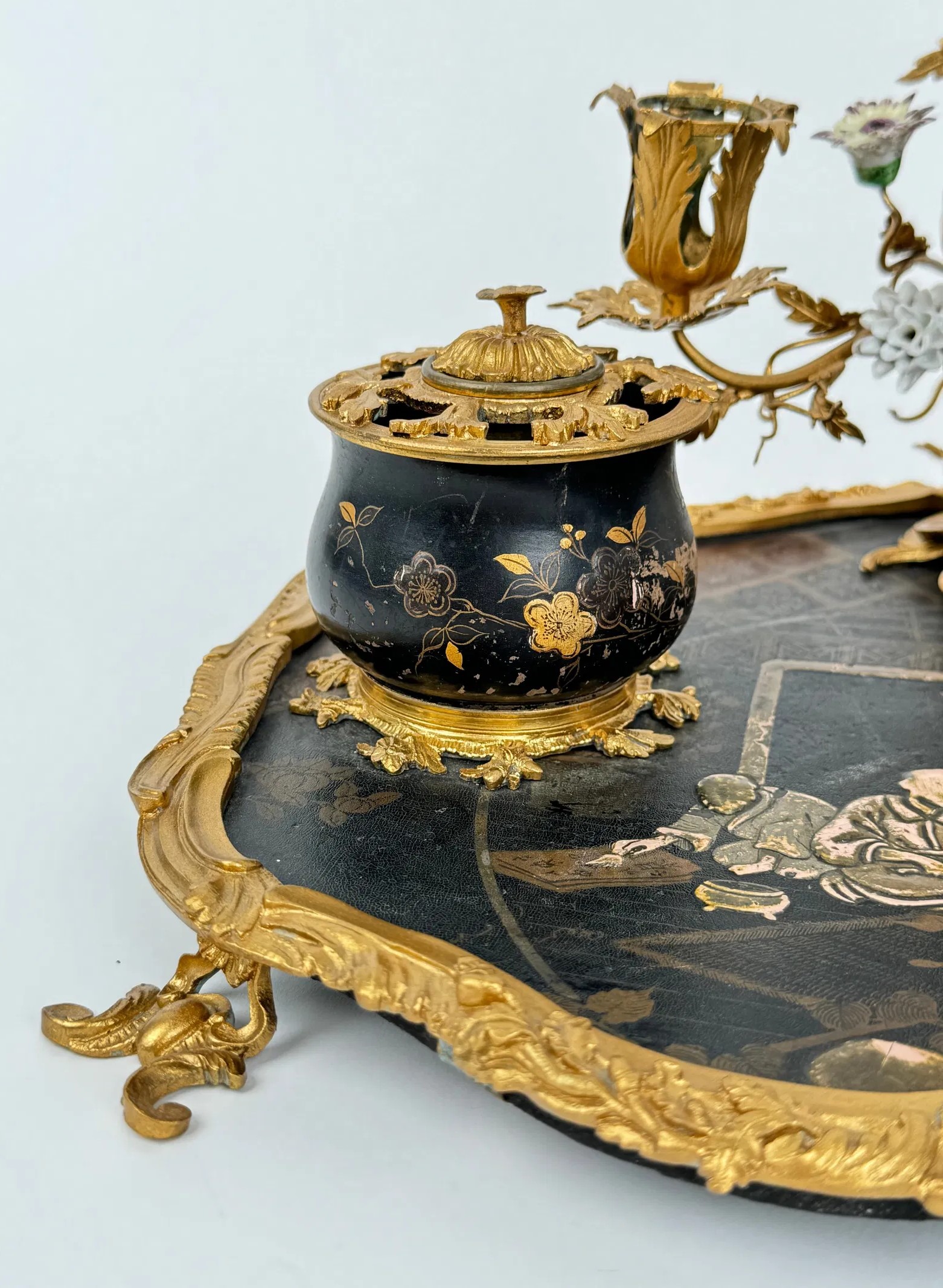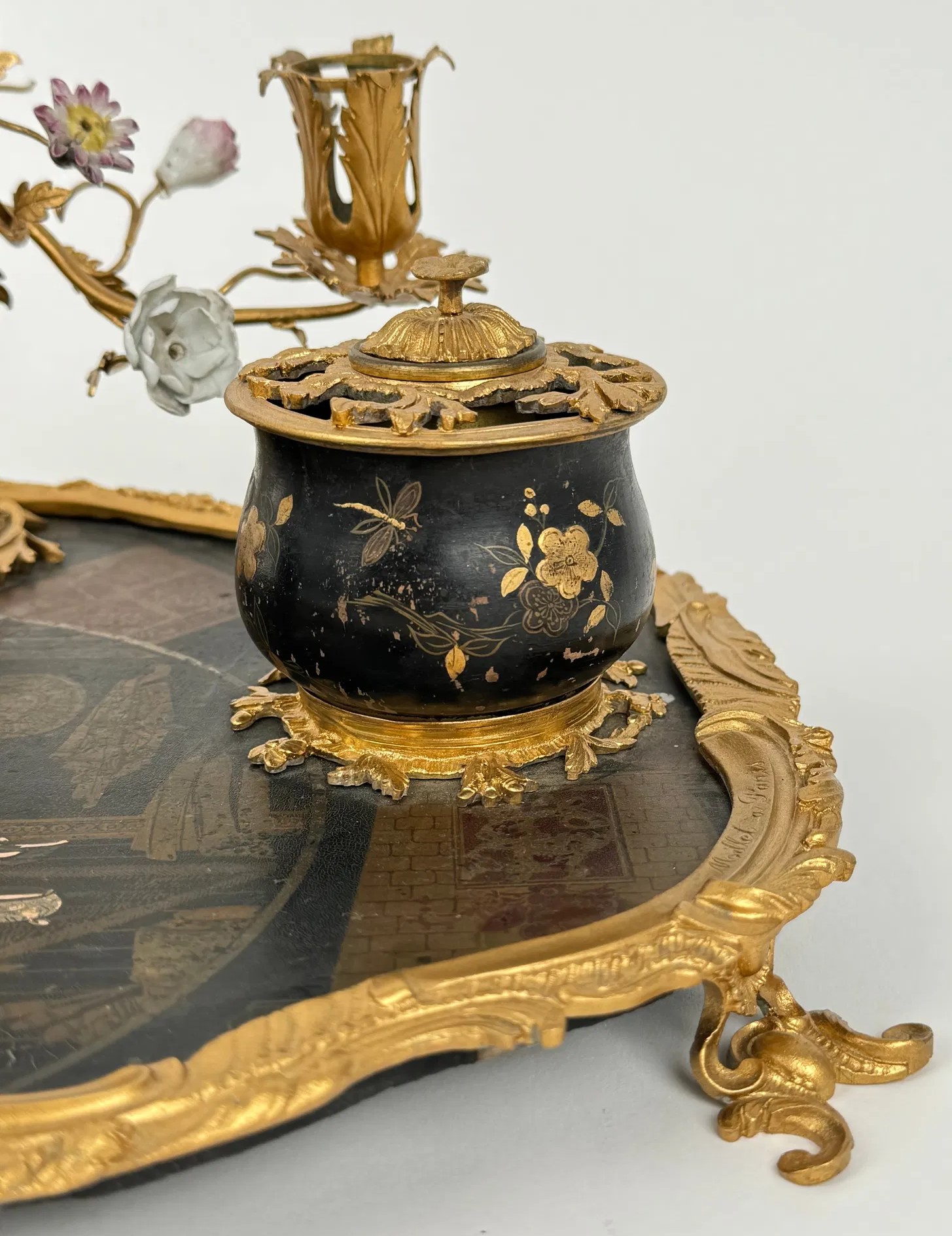 This 19th century French Chinoiserie inkstand, crafted by Maison Millet, features gilt bronze branches with two candleholders integrated into the design all held by a central figure of a man dressed in a flowing robe and hat. The branches extending from the man are adorned with colorful porcelain flowers in shades of white, purple, yellow, and blue. The two inkwells are black with gold floral patterns and have decorative lids.