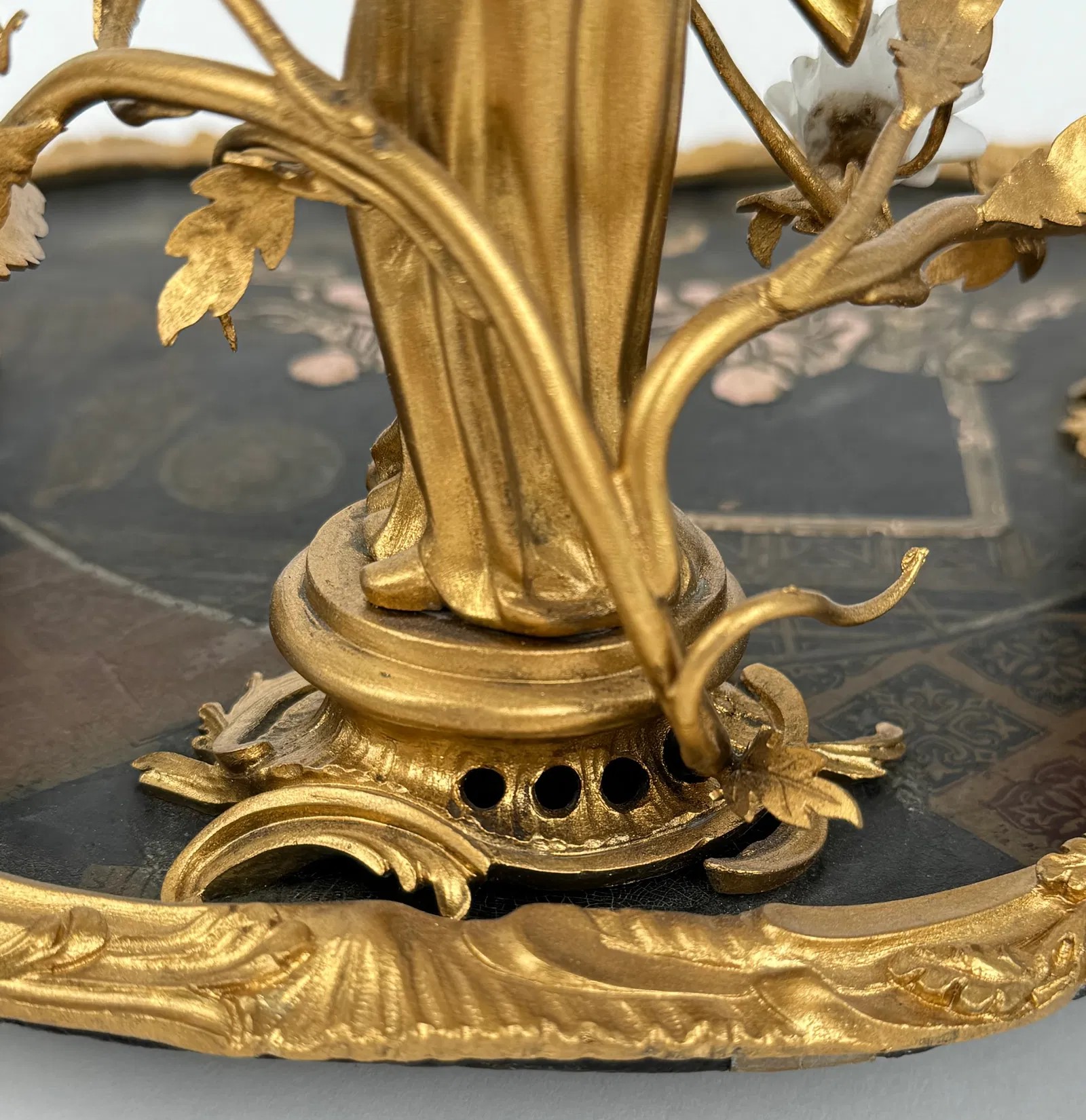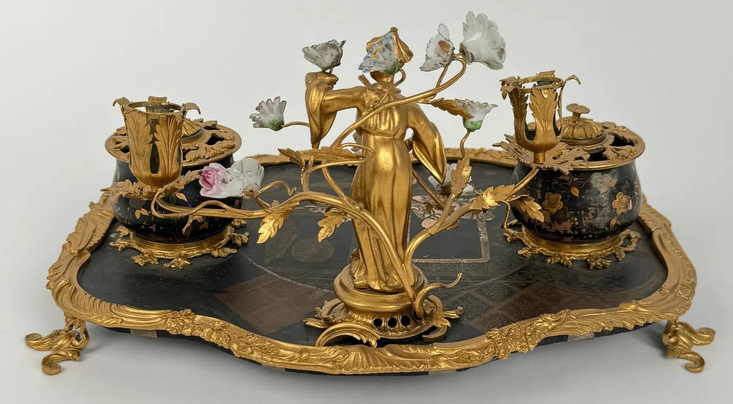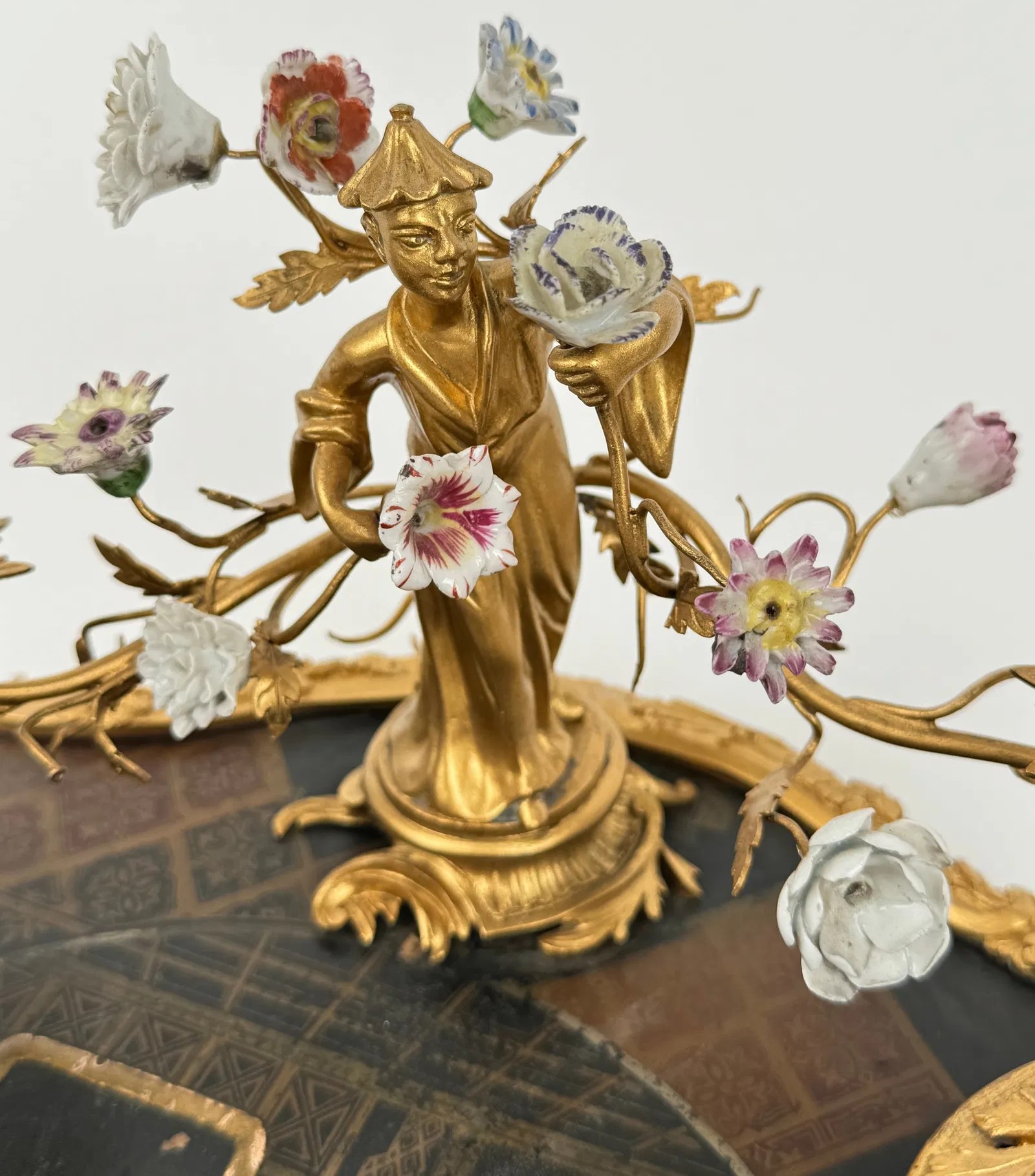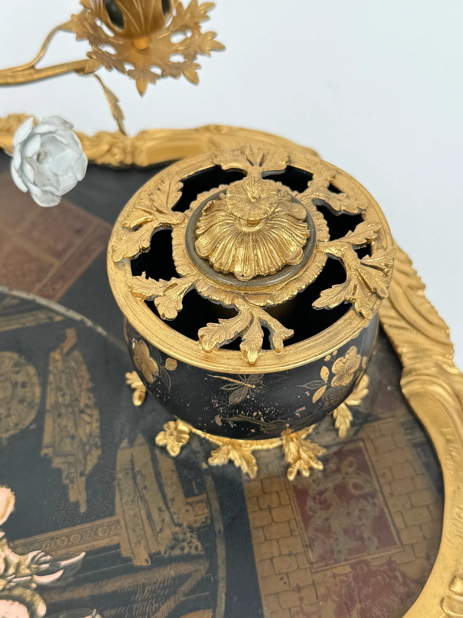 This 19th century French Chinoiserie inkstand, crafted by Maison Millet, features gilt bronze branches with two candleholders integrated into the design all held by a central figure of a man dressed in a flowing robe and hat. The branches extending from the man are adorned with colorful porcelain flowers in shades of white, purple, yellow, and blue. The two inkwells are black with gold floral patterns and have decorative lids.