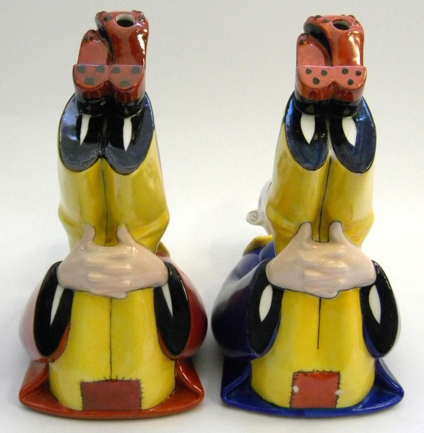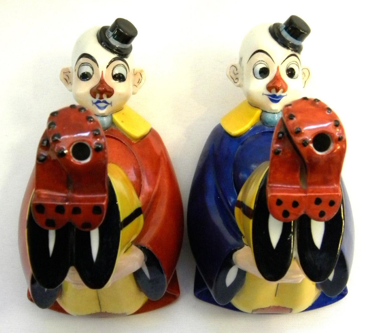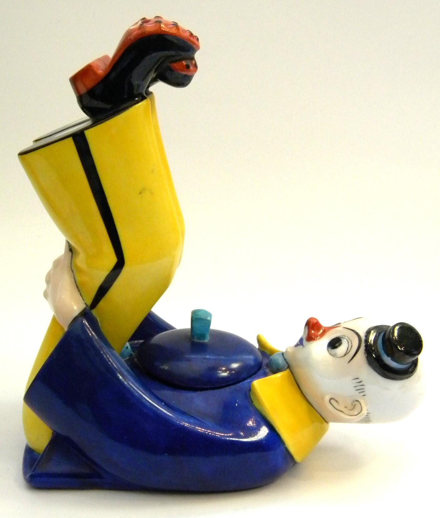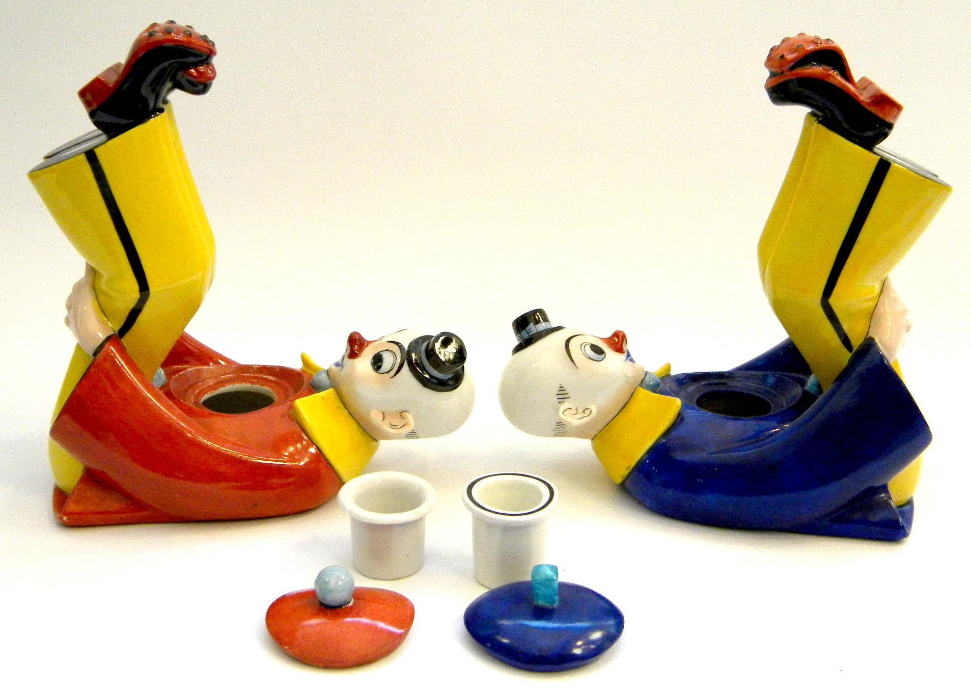 A clown on his back with his feet up in the air. The inkwell is in his chest and has a separate lid. A hole in the sole of his shoe holds a pen. Signed on the bottom “Becquera” and marked “Aladin – Made in France”. Two examples shown.