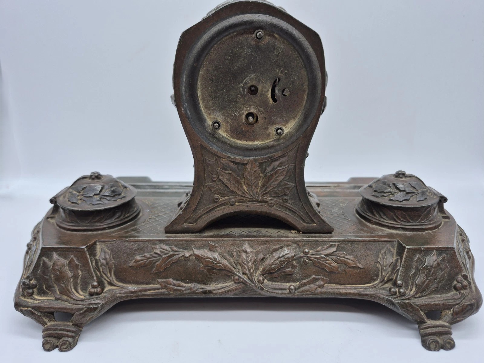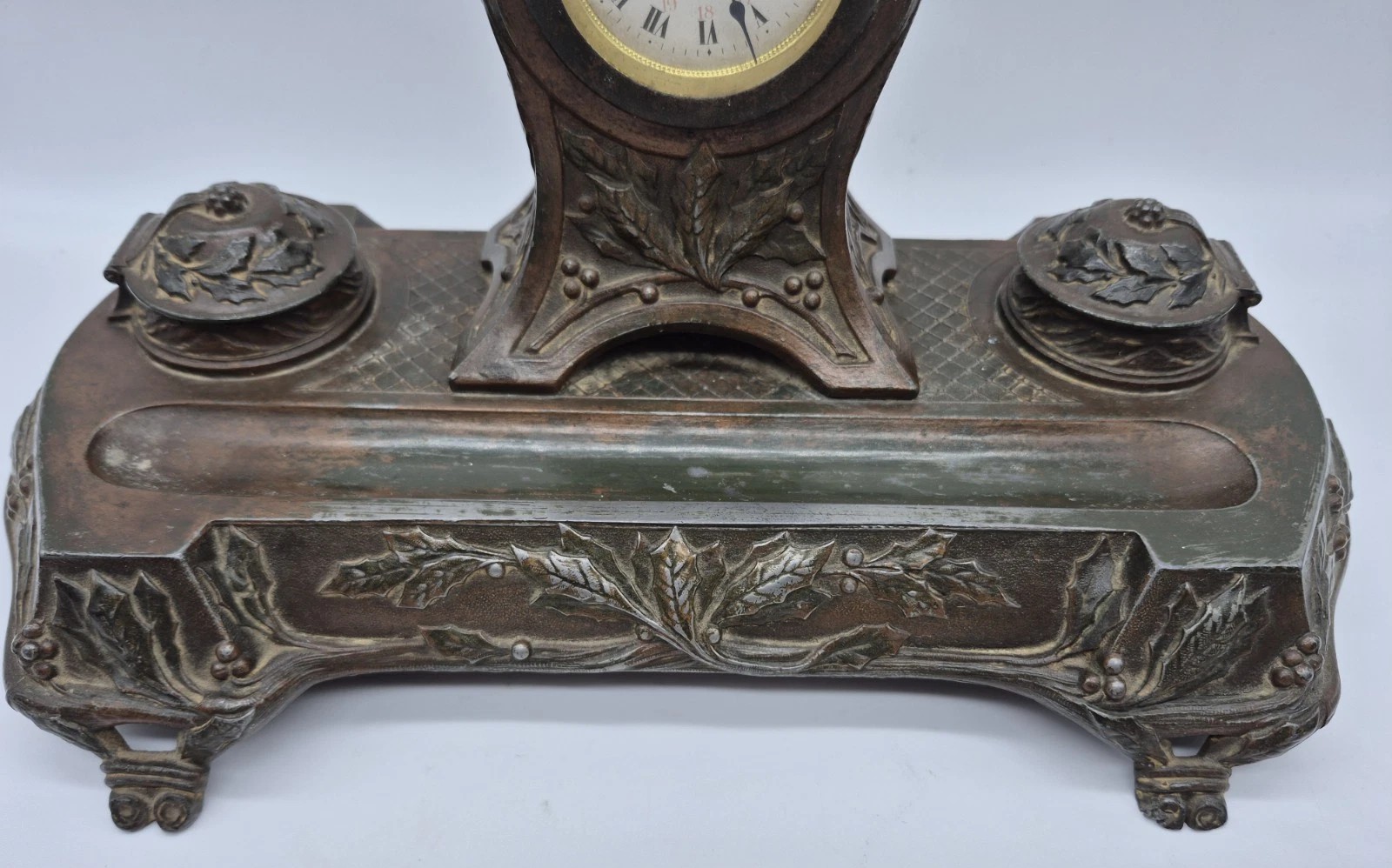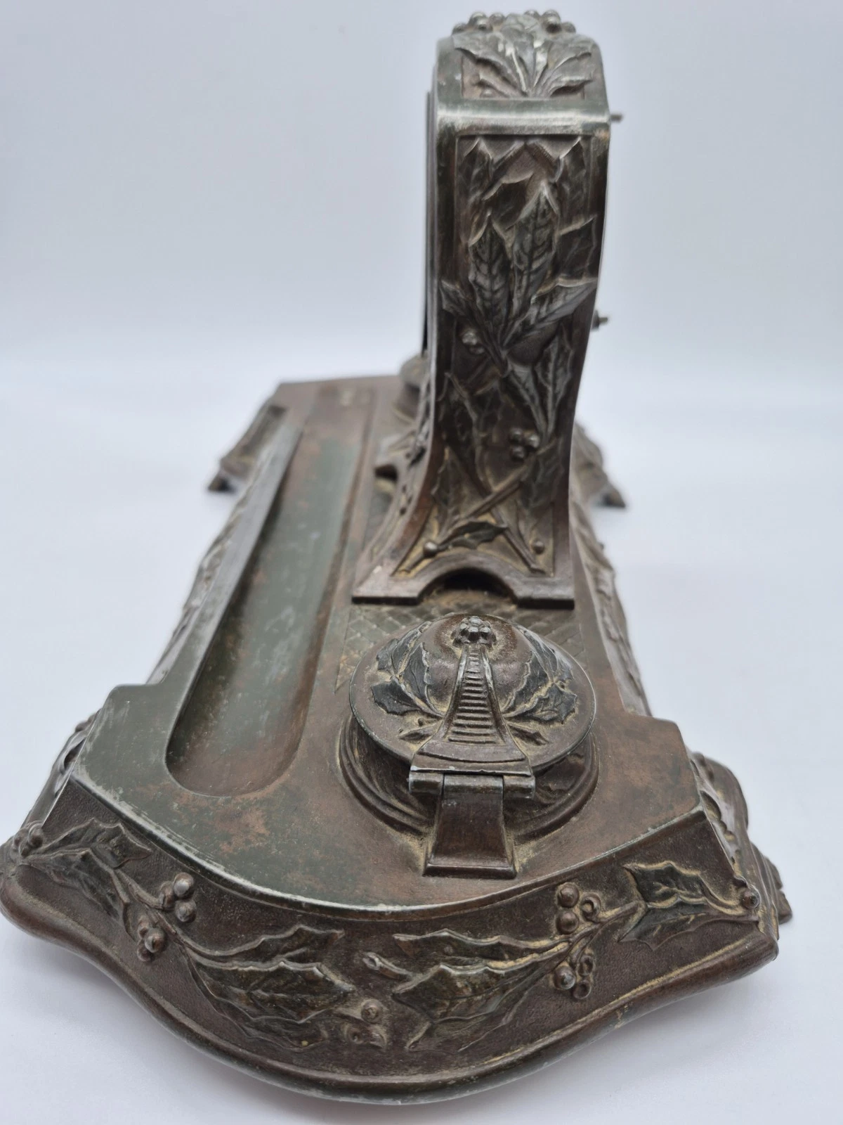 - Inkwells: Flanking the clock are two integrated inkwells. The glass or ceramic inserts are missing. Each well is covered by a hinged lid that is embossed with a motif of holly leaves and berries. The lids are topped with small, clustered berry finials.