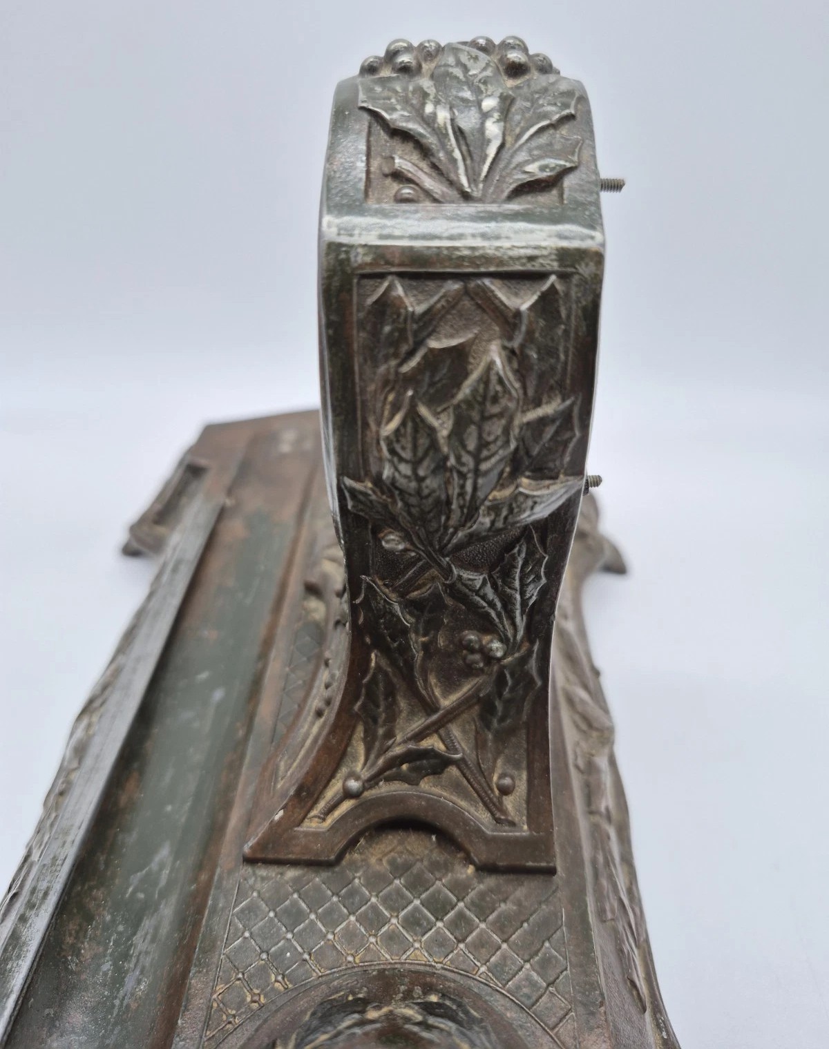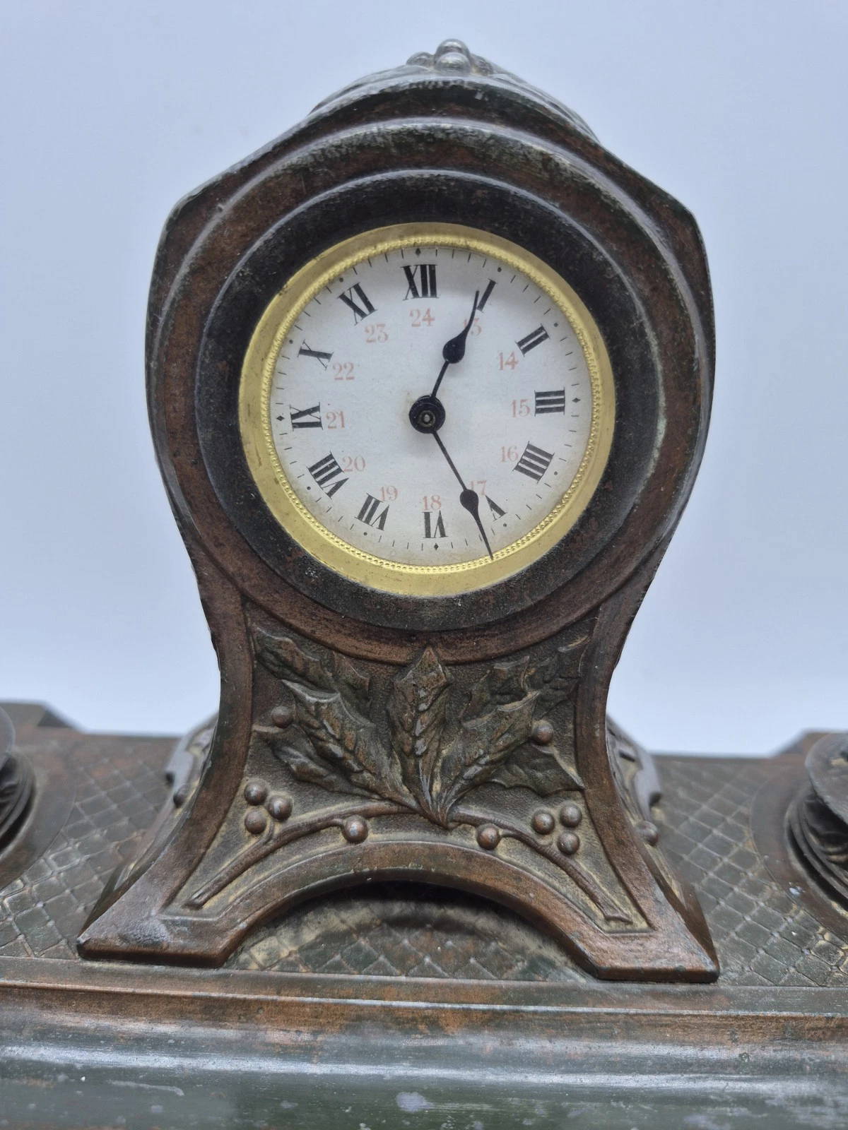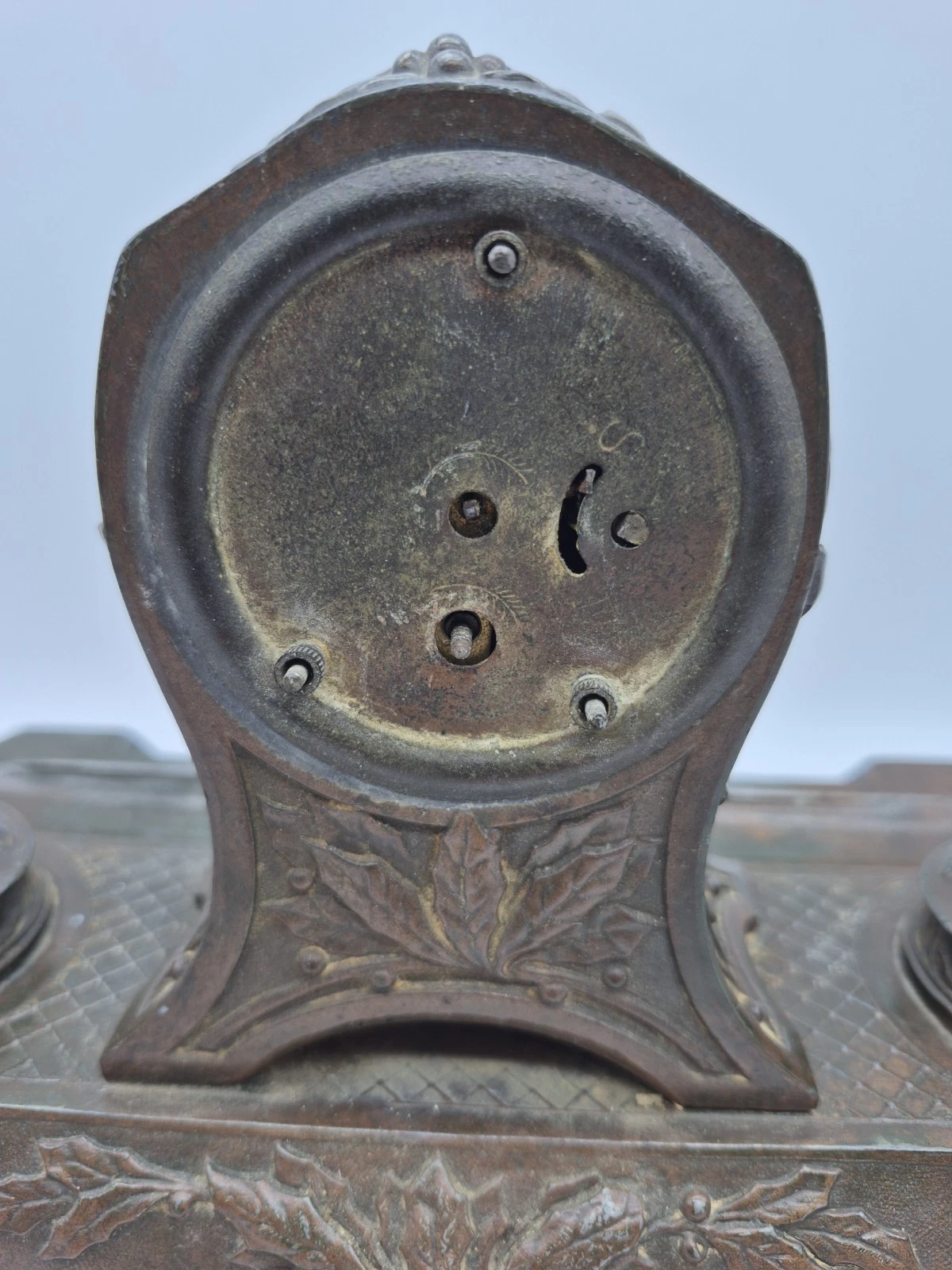 - Inkwells: Flanking the clock are two integrated inkwells. The glass or ceramic inserts are missing. Each well is covered by a hinged lid that is embossed with a motif of holly leaves and berries. The lids are topped with small, clustered berry finials.