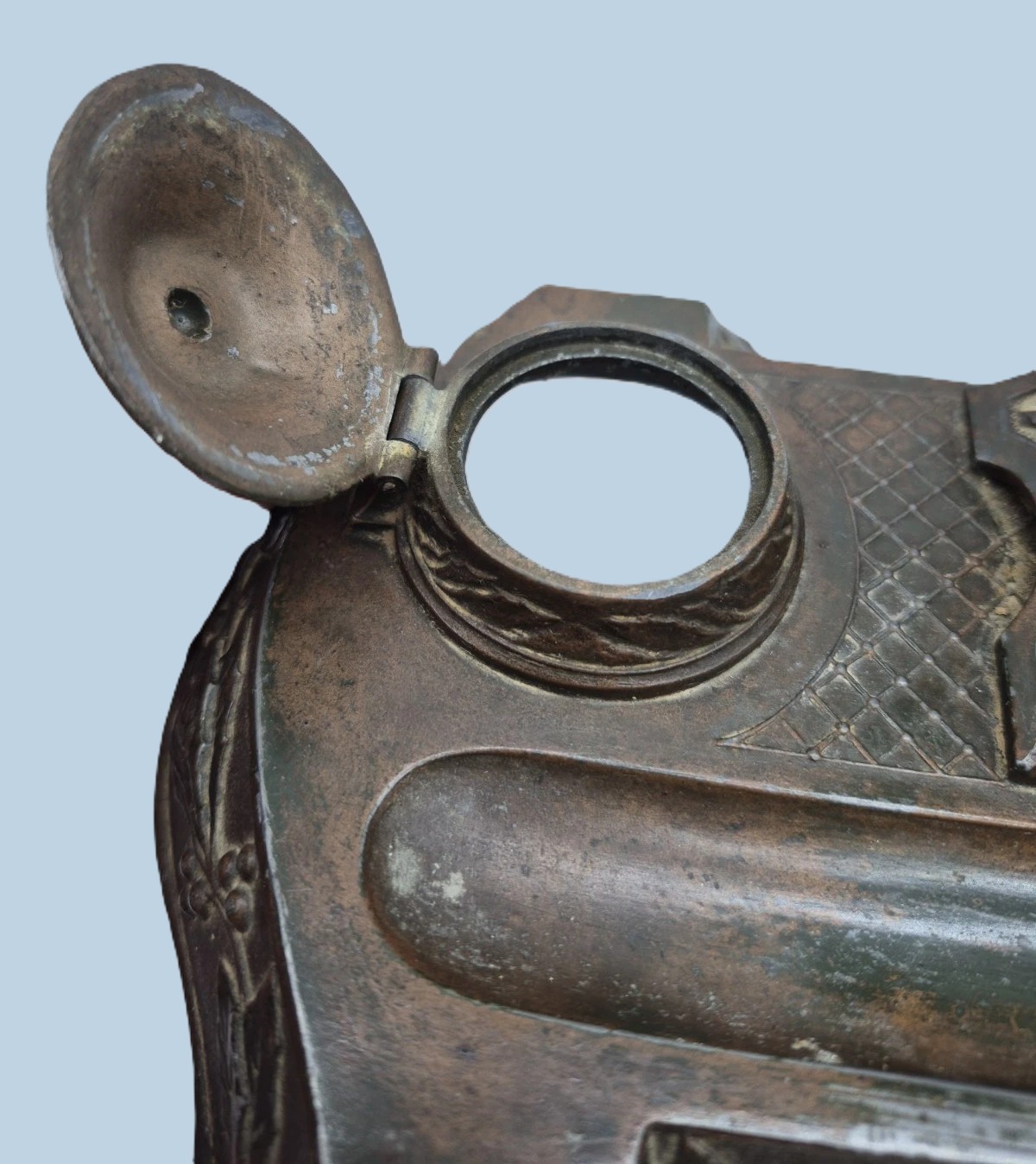 - Base and Ornamentation: Pen Channel: A long, shallow rectangular groove runs across the front of the base to provide a resting place for a dip pen.
