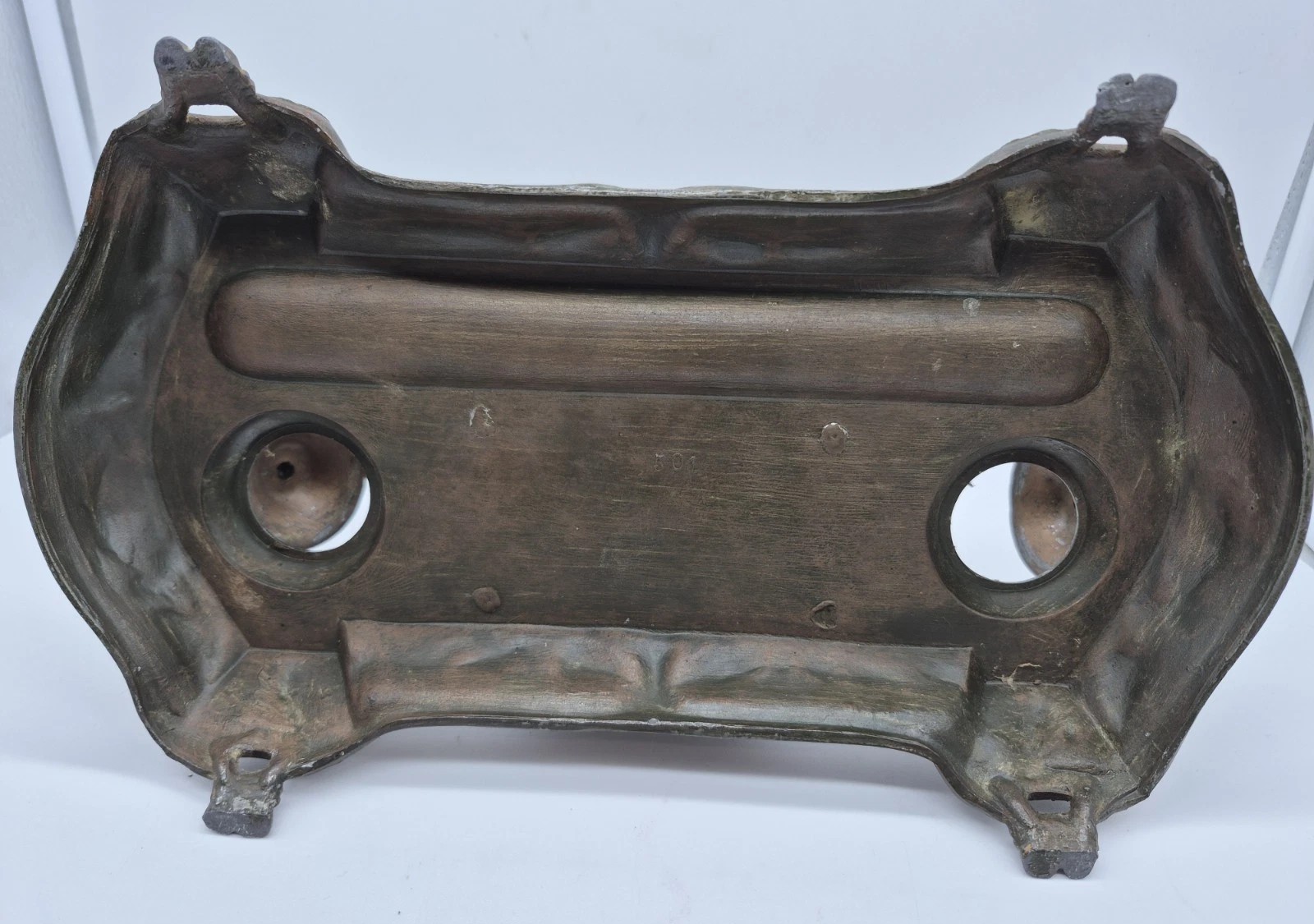 - The Underside: The bottom reveals the hollow cast nature of the spelter and shows a small stamped numeral (“501”), likely a model or factory production number.