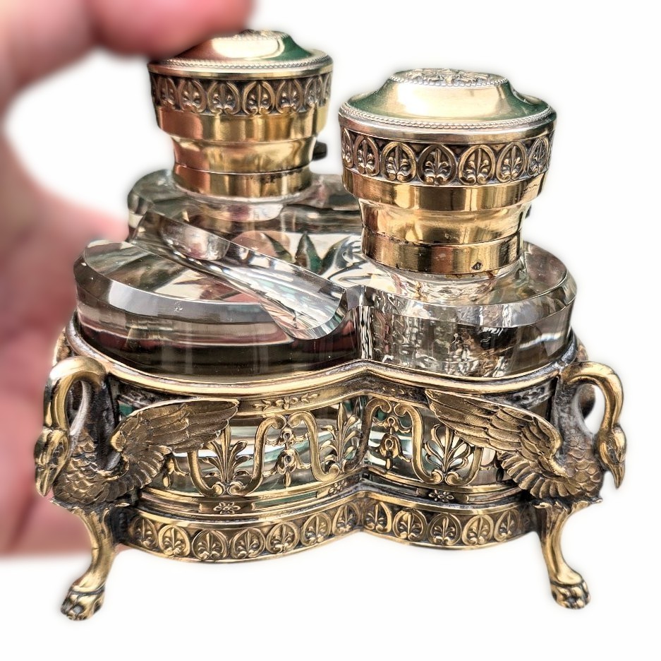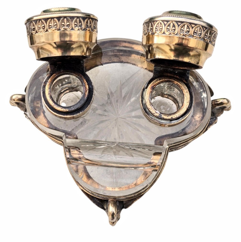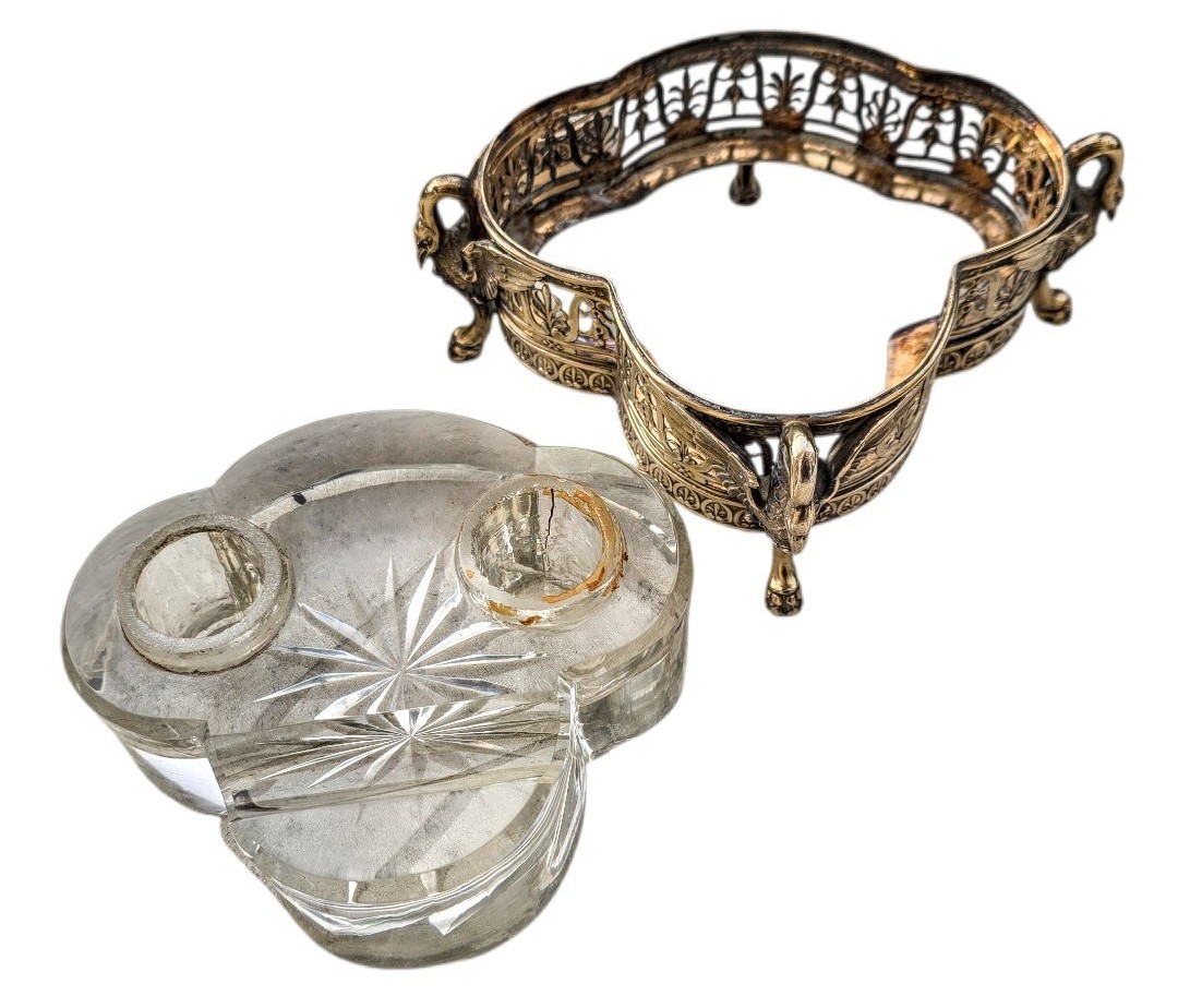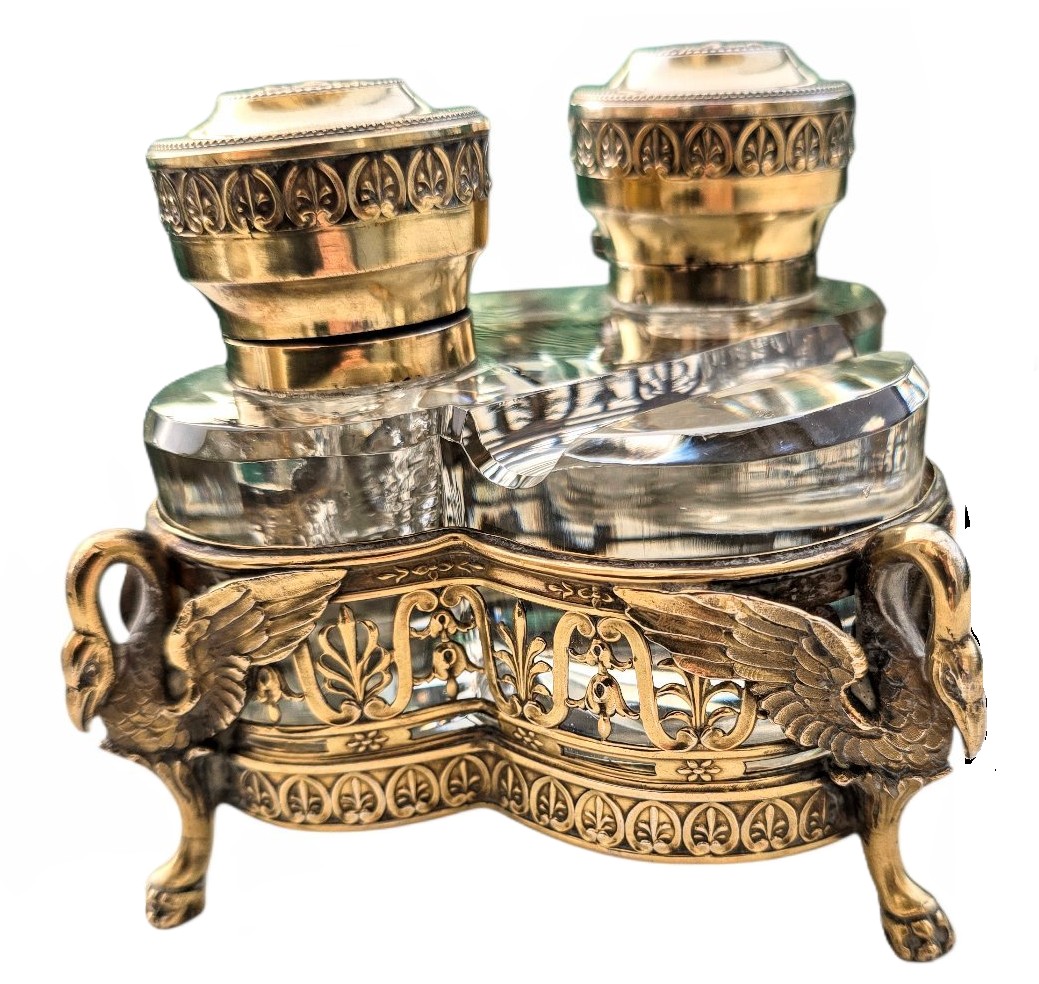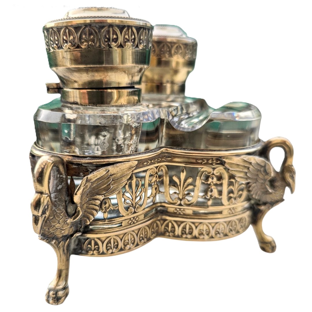This French inkstand, Empire-style design, is characterized by its heavy use of classical motifs. The most striking features are the three figural supports, which appear to be swans (common in Napoleonic-era French design). Their arched necks form the handles, and their powerful, outspread wings wrap around the filigree frame, transitioning into “monopodia” legs that end in detailed paw feet.