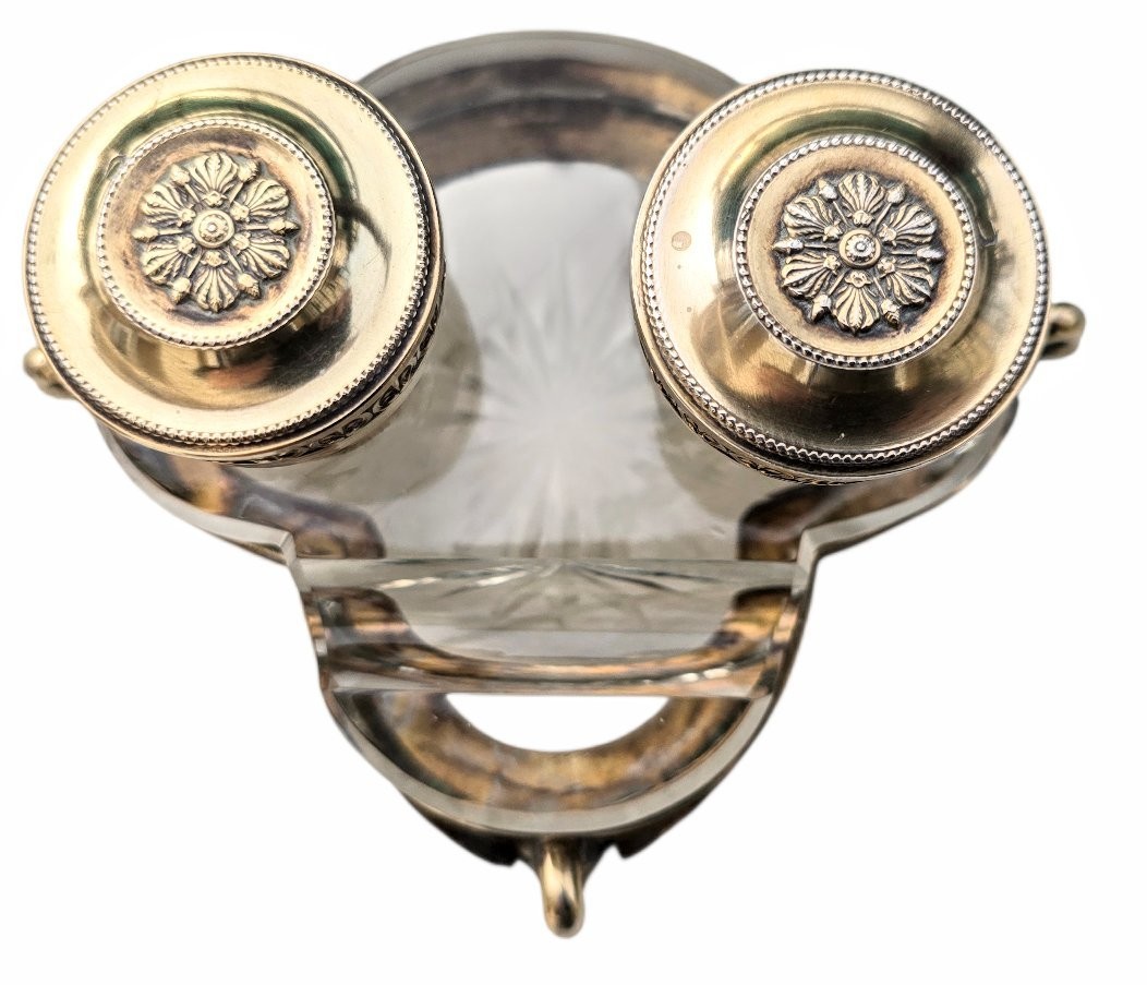 This process was exceptionally popular in France (where it is known as argent doré). It gives the piece the warm, regal glow of solid gold while maintaining the weight and value of silver. Given the intricate “open framework” design, this set was likely intended for a high-status desk.