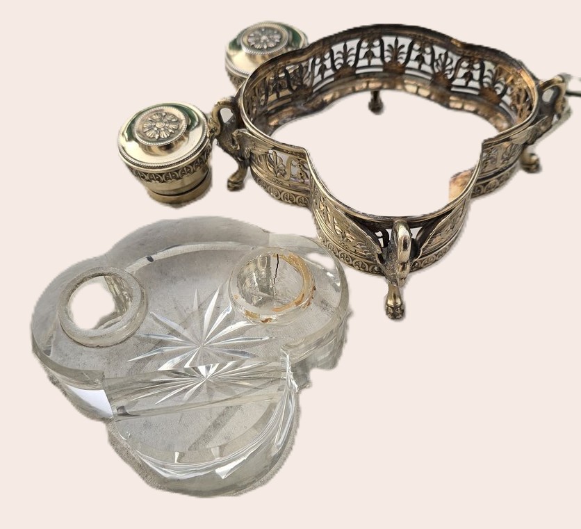 French Empire Revival Vermeil Silver & Trefoil Crystal Inkstand