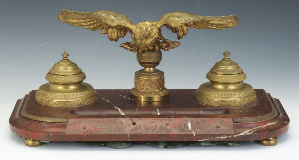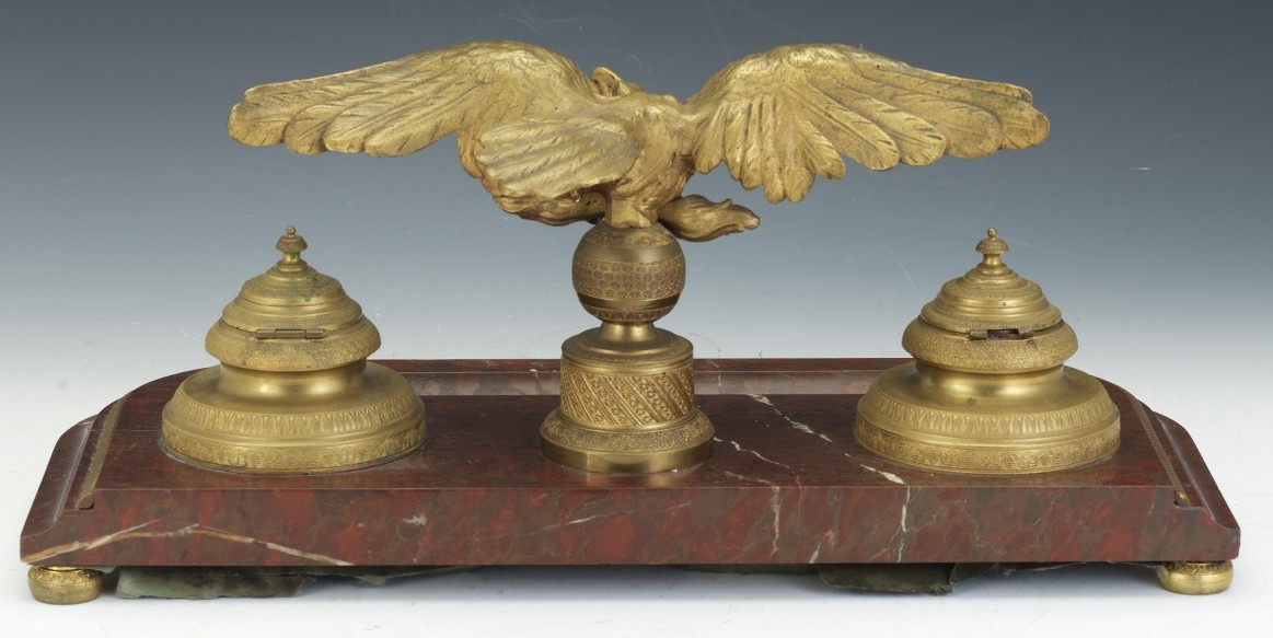 At the center of the inkstand is an ormolu bronze baluster pedestal, which rises to support the main figural element: a majestic eagle with its wings spread wide. The eagle, a powerful symbol of Empire and authority, holds a bundle of stylized flames or lightning bolts in its talons. The eagle’s pose and its position atop the pedestal give the piece a commanding presence.