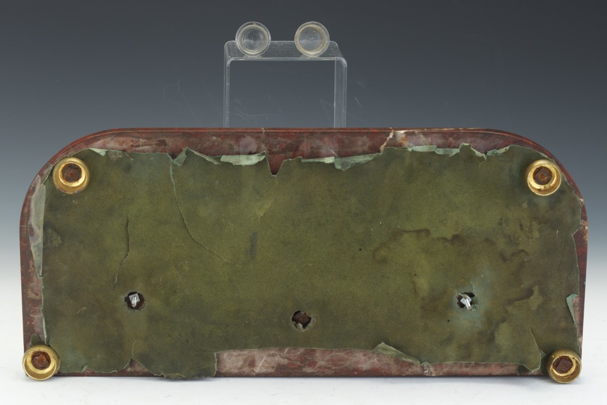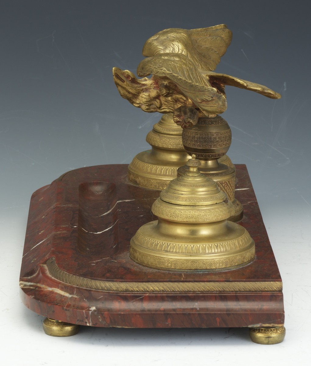 This inkstand is an example of the French Empire style, known for its opulence and classical inspiration. It combines a rouge marble base with ormolu bronze accents. The marble, with its rich reddish hue and fine veining, is shaped into a substantial base that rests on four ornate bun feet. It features a central, carved slot in the front, designed to hold pens.