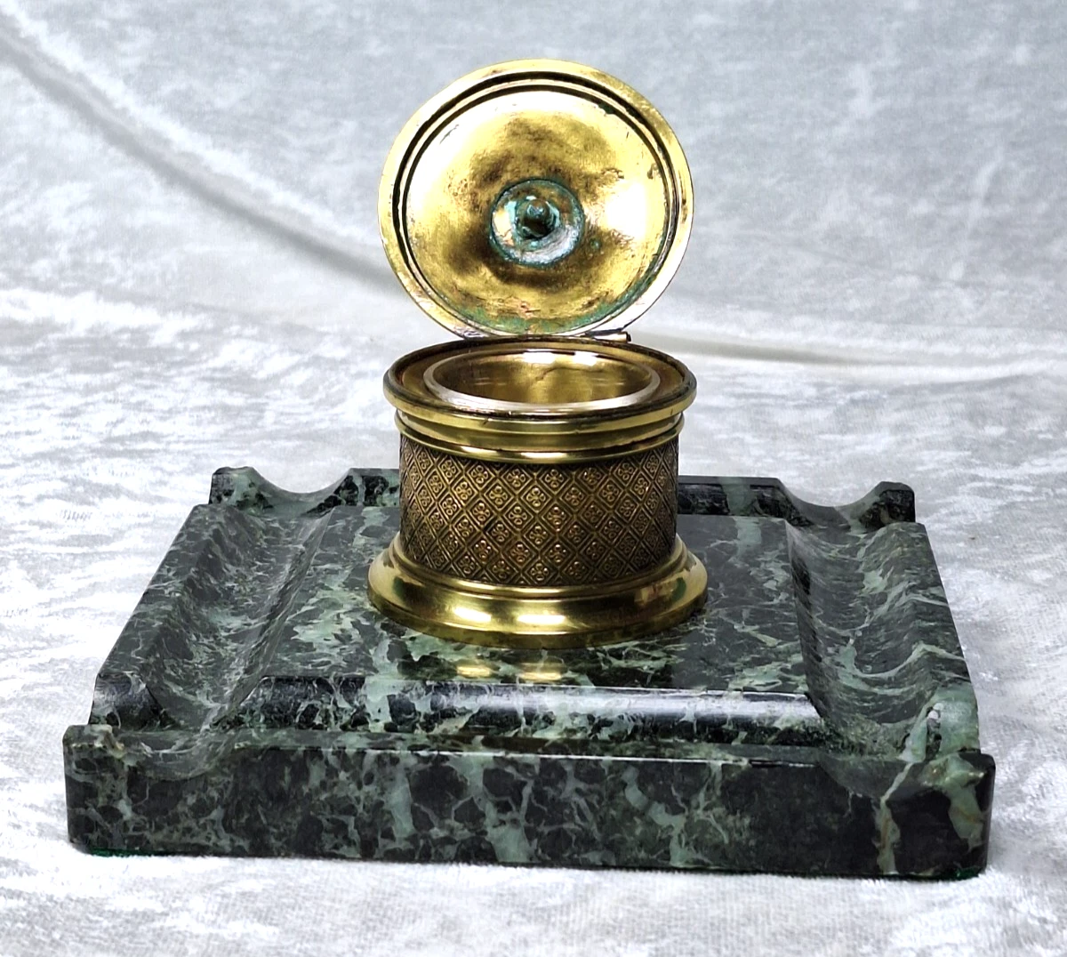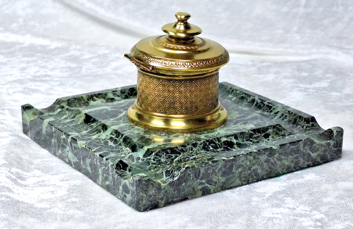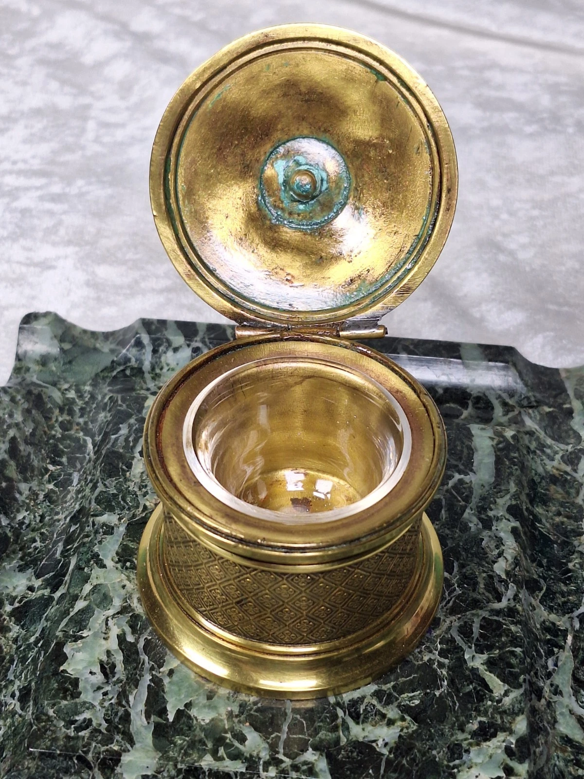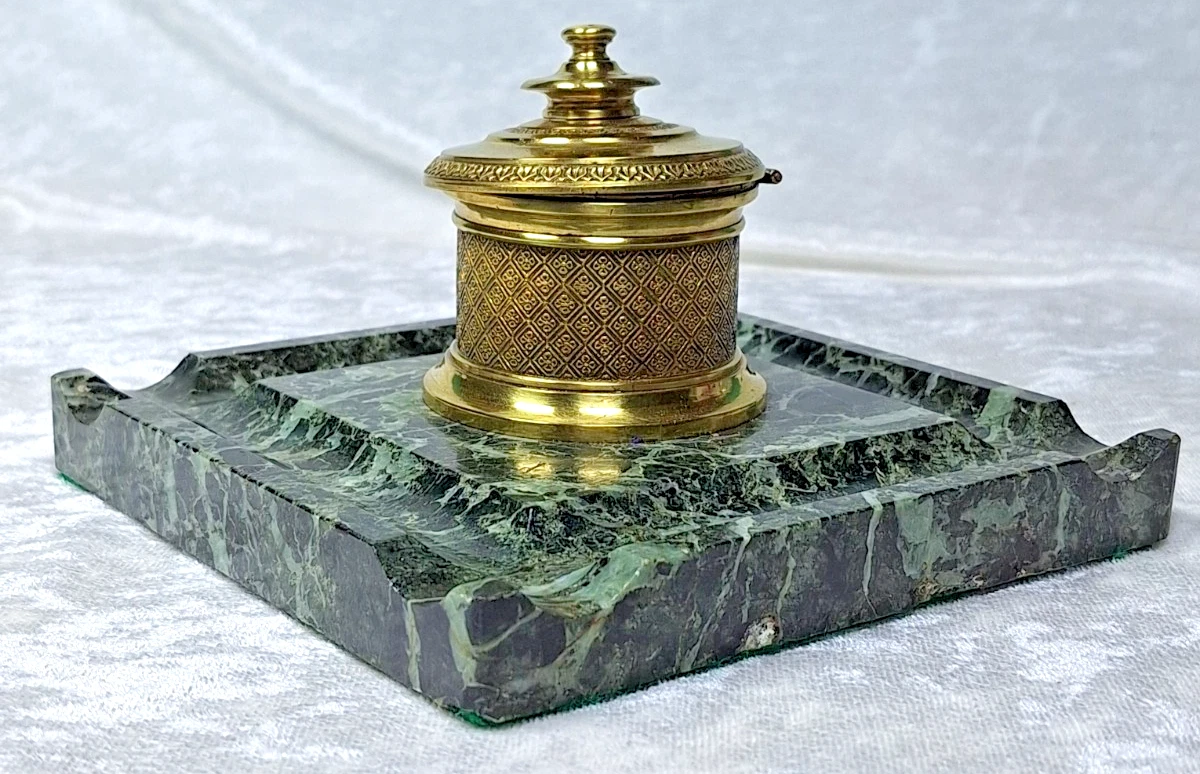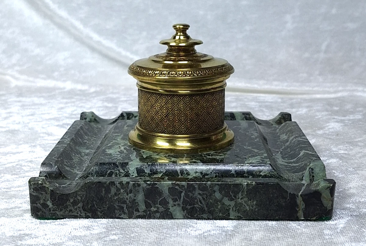 - Structure: The central brass inkwell is set into the marble block. The pen channels on all four sides ensure the inkstand is fully accessible and visually symmetrical from every angle.