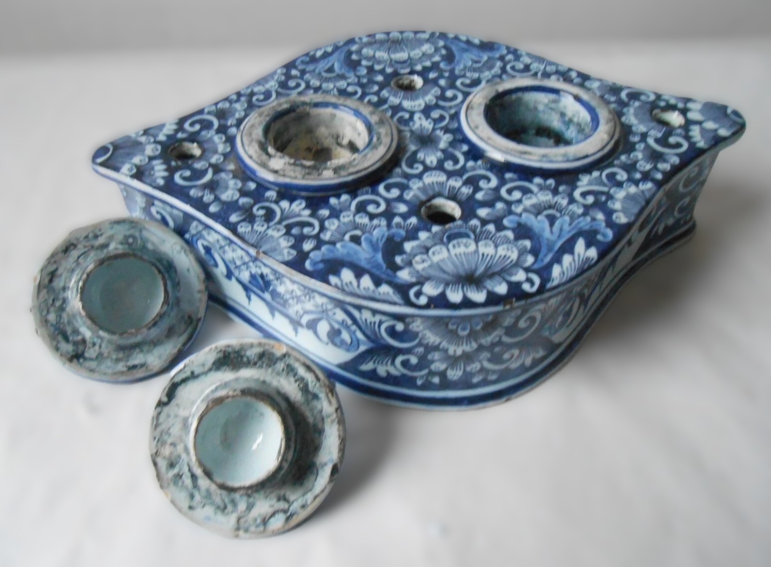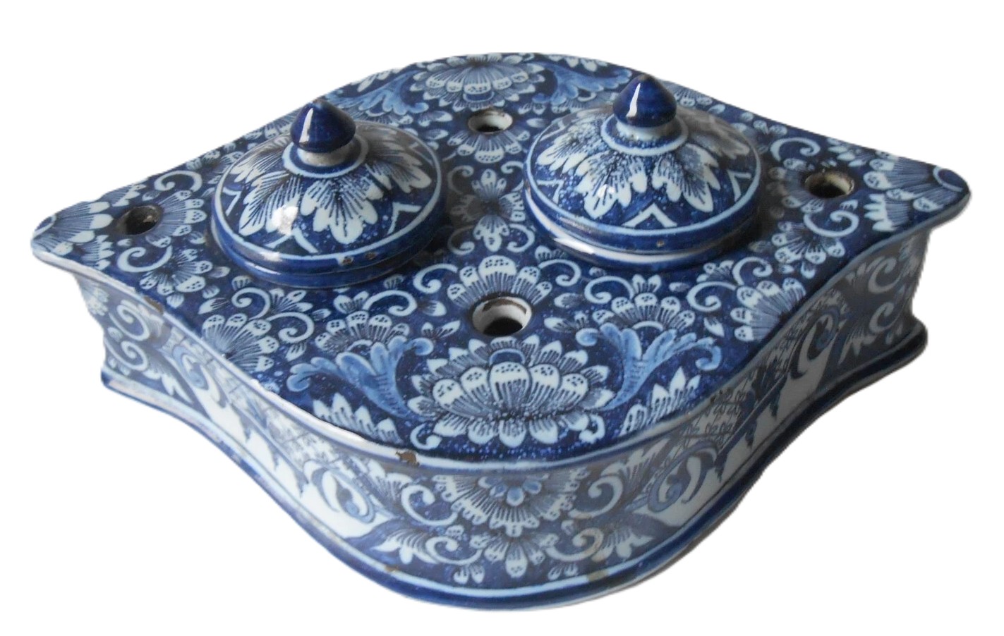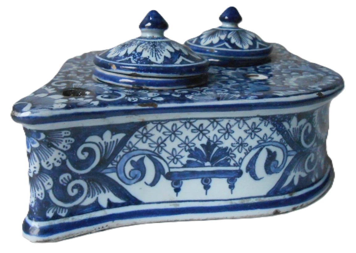 This ceramic faience inkstand is a beautiful example of heart-shaped (“en forme de cœur”) writing desk accessories, a popular form for gift-giving and decorative desk sets in the 18th and 19th centuries.