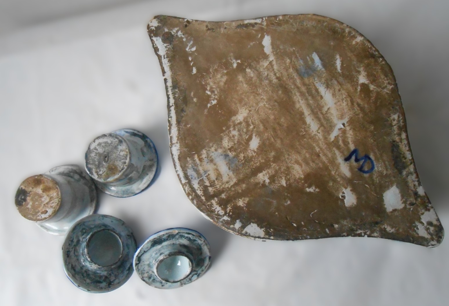 2. The “MD” Mark: The blue initials “MD” on the unglazed base likely refer to the Mousset & Delannoy factory (or a similar partnership like Masse-Delannoy) in Desvres. While many factories used monograms, this simple blue signature on a rustic, unglazed base is a hallmark of Desvres production.