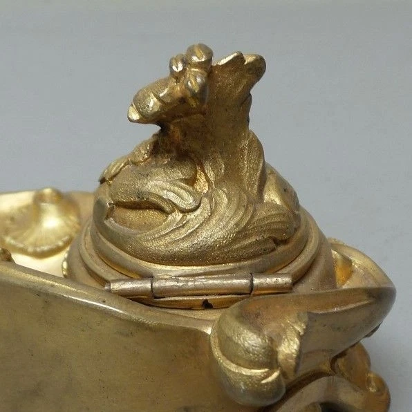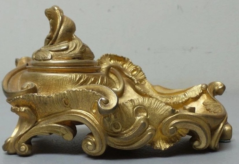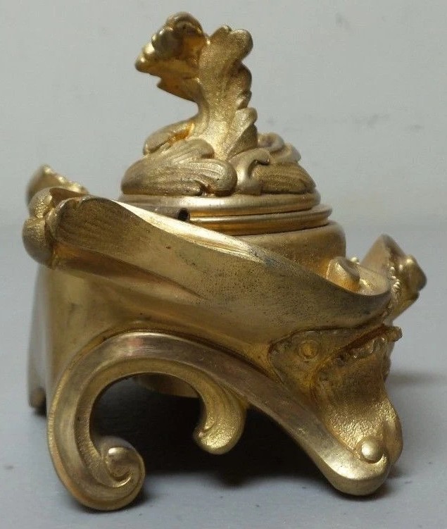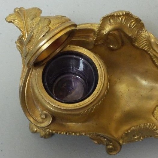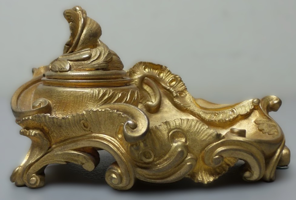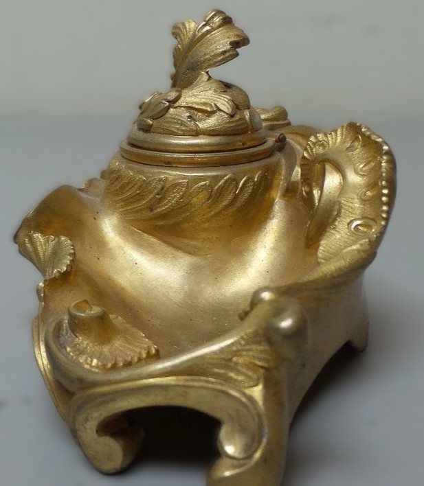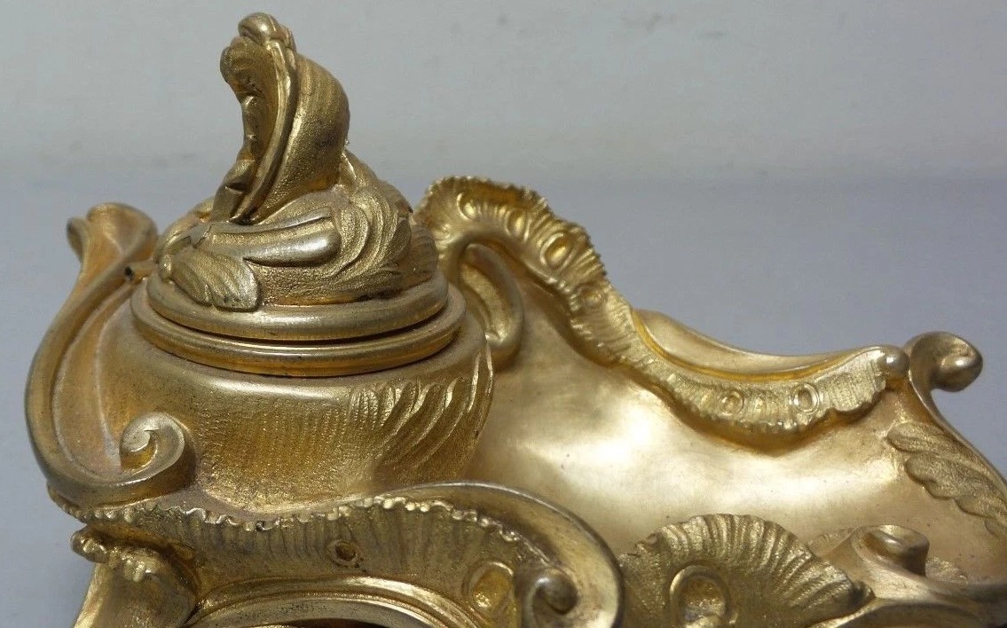 - Inkwell Receptacle: On the left side, there’s a prominent, circular inkwell receptacle with a hinged lid. The lid has a sculpted, stylized plant form, possibly a calla lily or a similar natural motif, with swirling leaves and a bud-like protrusion at its peak.