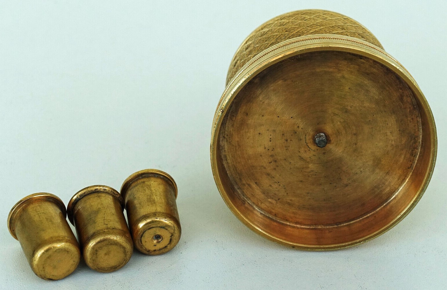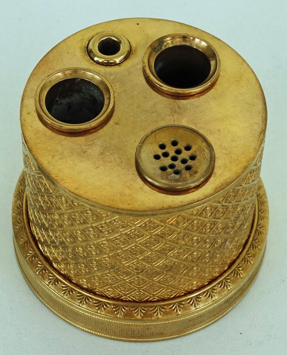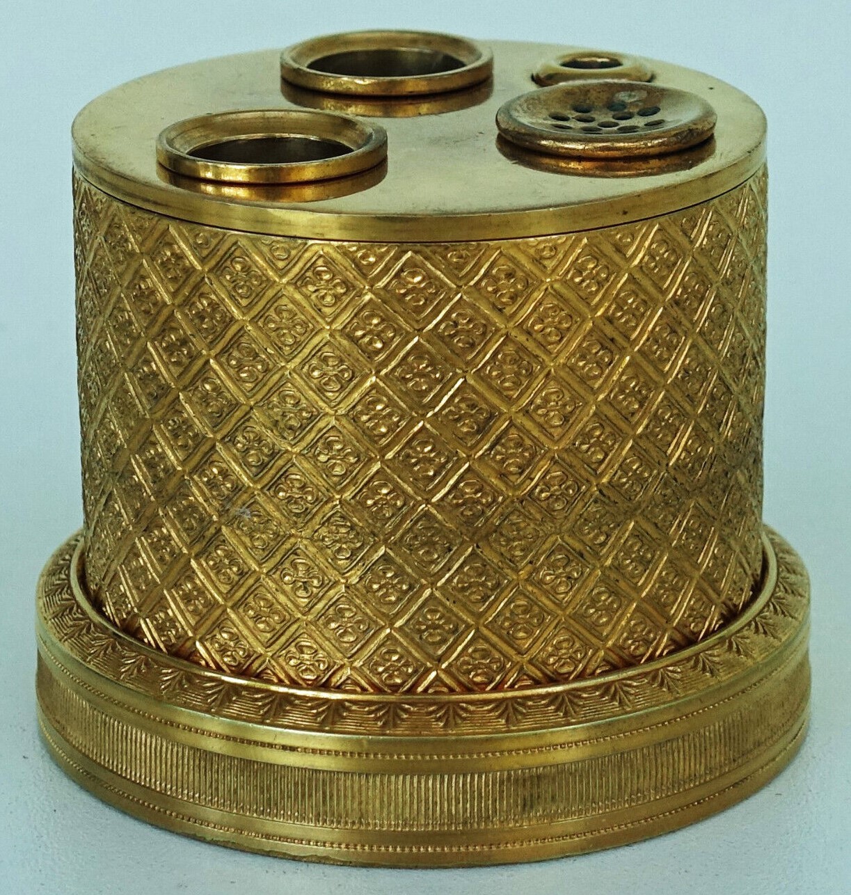 This gilded bronze inkwell features a cylindrical shape with a textured cross-hatched diamond pattern on its surface. The base is decorated with a frieze of palmettes. It has two inkwell cups, a small pen tube and a sander.