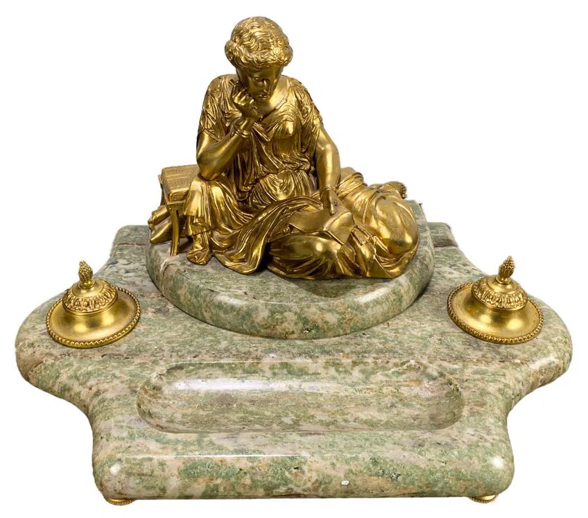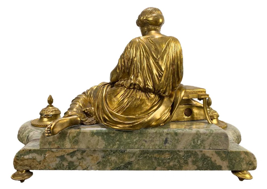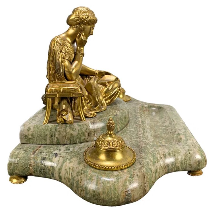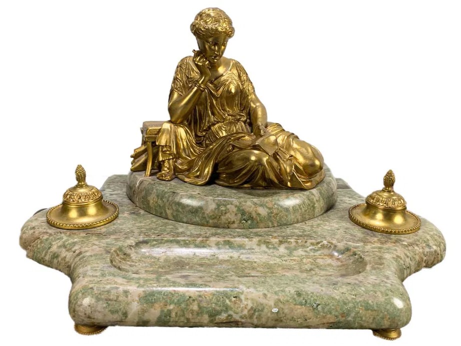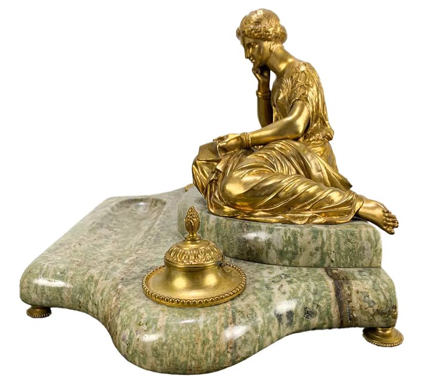 This marble and gilt bronze inkstand features a central female figure seated on a raised platform, crafted from gilt bronze. She is depicted in a contemplative pose, with one hand resting on her chin and the other on her lap, and dressed in flowing robes. The base of the inkstand is made of green marble with a star-shaped design, and it includes two lidded inkwells, also made of gilt bronze, positioned symmetrically on either side of the woman. The inkwells have ornate lids with finial tops.
