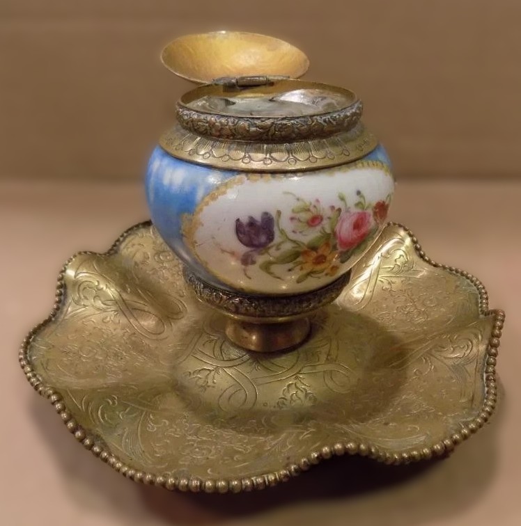 This inkwell is an example of luxury desk ware that blends ornate metalwork with hand-painted porcelain, produced in France during the mid-to-late 19th century (circa 1860–1880).