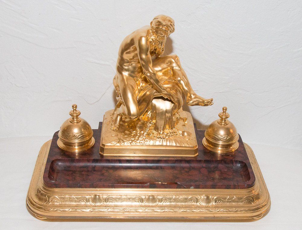 - The “Collas” Method: Barbedienne was famous for using the Collas machine (a pantograph), which allowed him to take famous large-scale museum sculptures (like those by Caffieri or Michelangelo) and mathematically reduce them to smaller sizes for use as clock toppers, bronzes, or inkstands like this one.