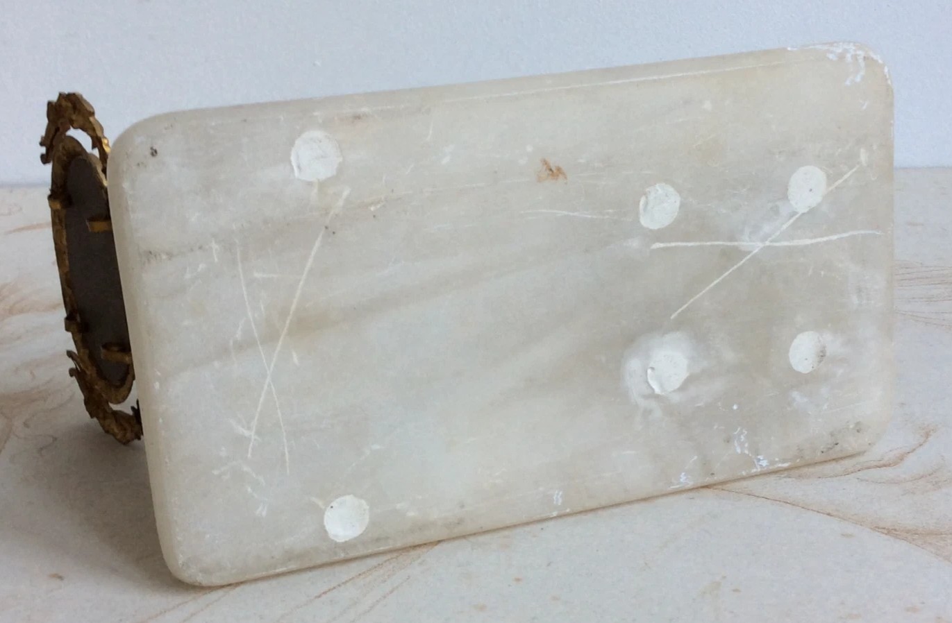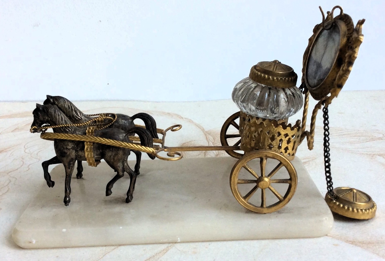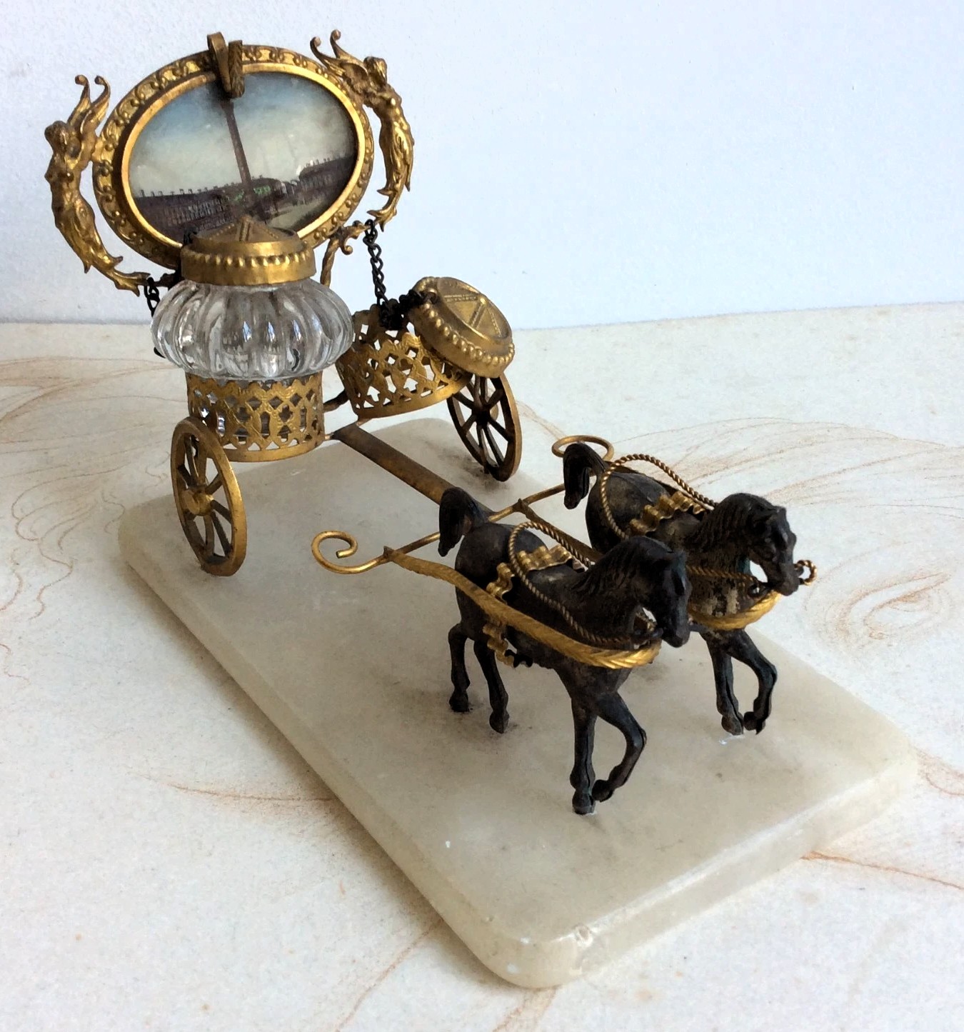 This is a French Grand Tour-era inkstand from the mid-19th century, designed as a horse-drawn carriage. It’s composed of a brass mount set on a rectangular alabaster base. The carriage is designed to hold two inkwells, but one is missing.