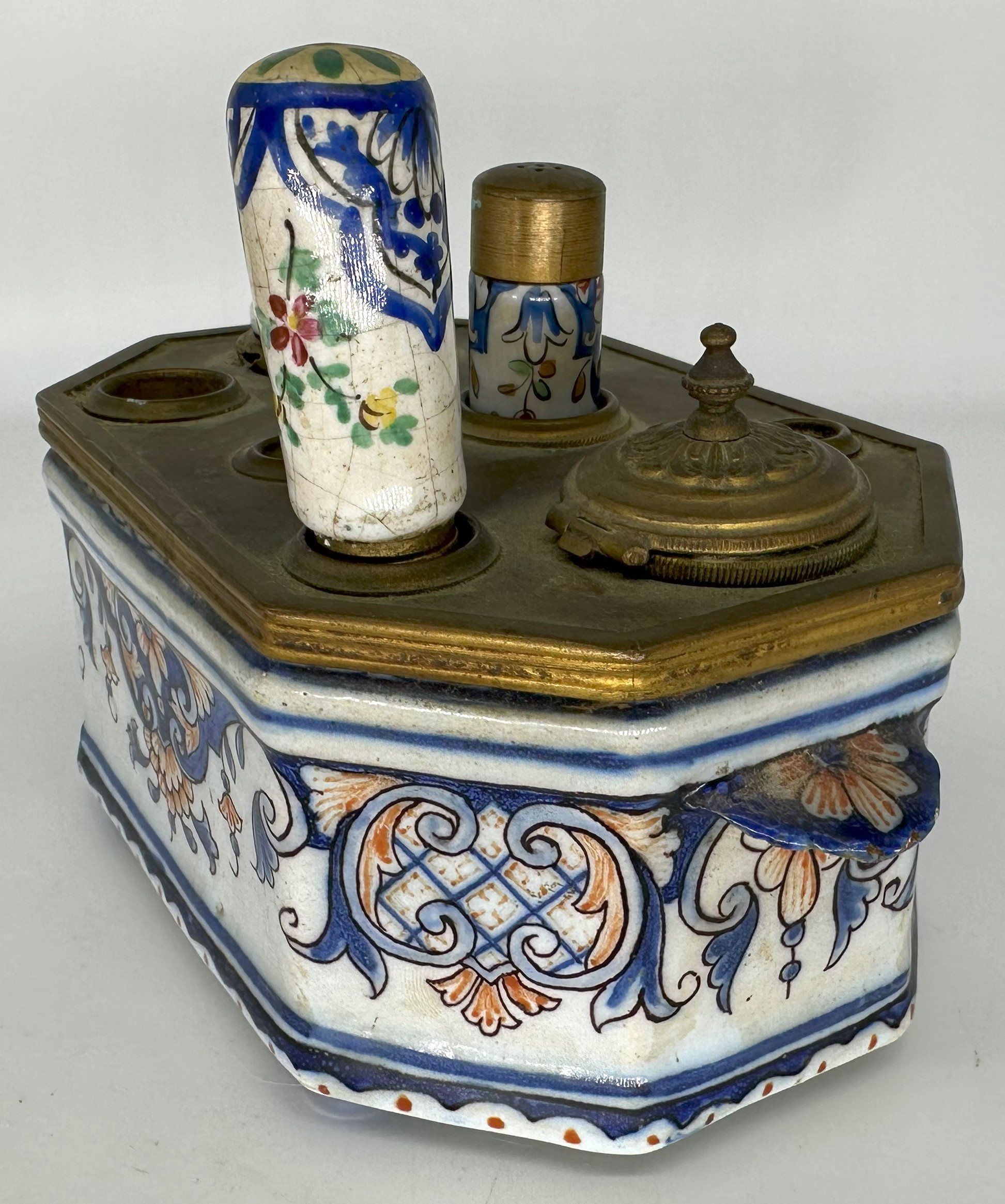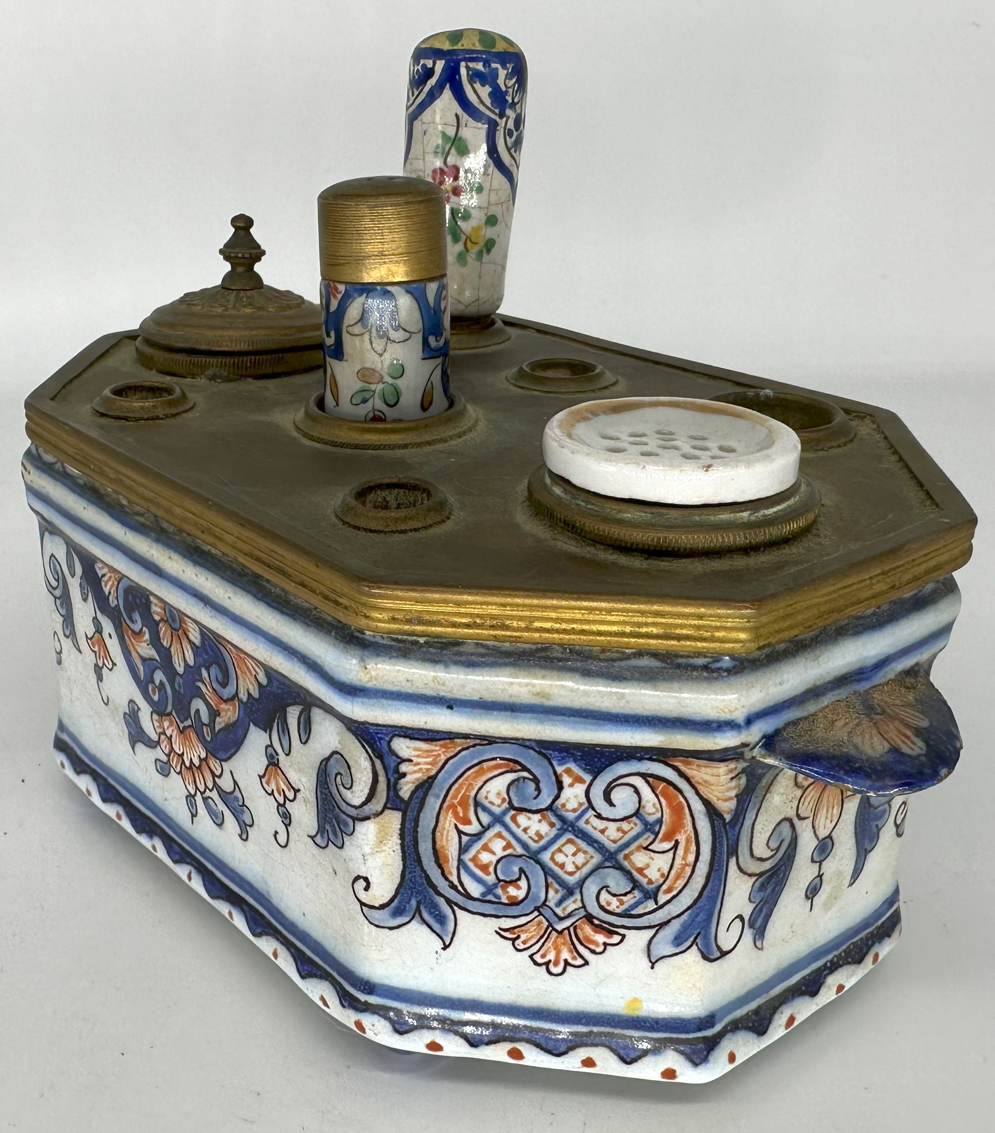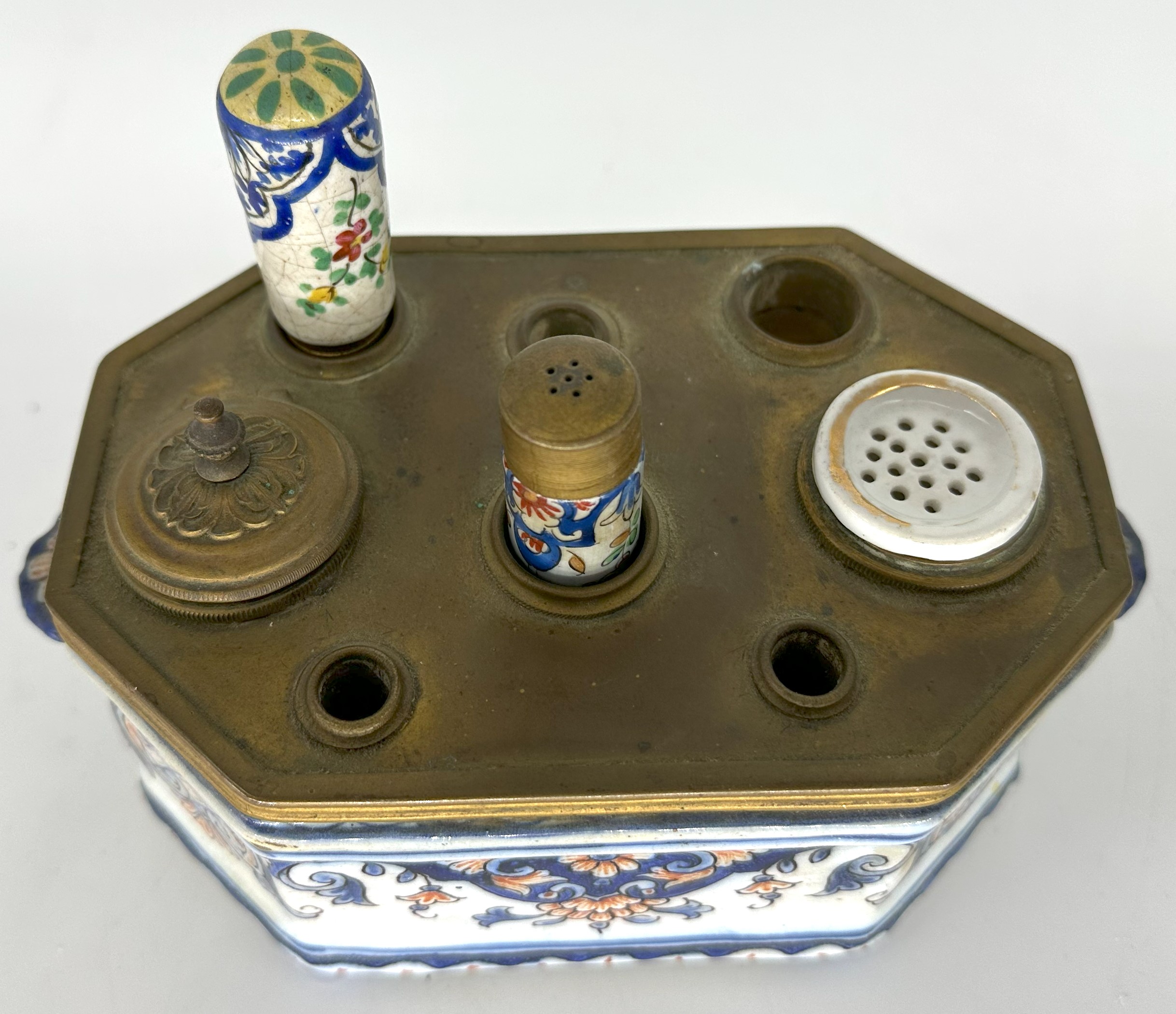 The rectangular base is hand painted with intricate blue, orange, and white floral motifs. The bronze top houses an inkwell, sander, and two wax sealers. Unidentified mark on the base, numbered 5006, marked “France”.