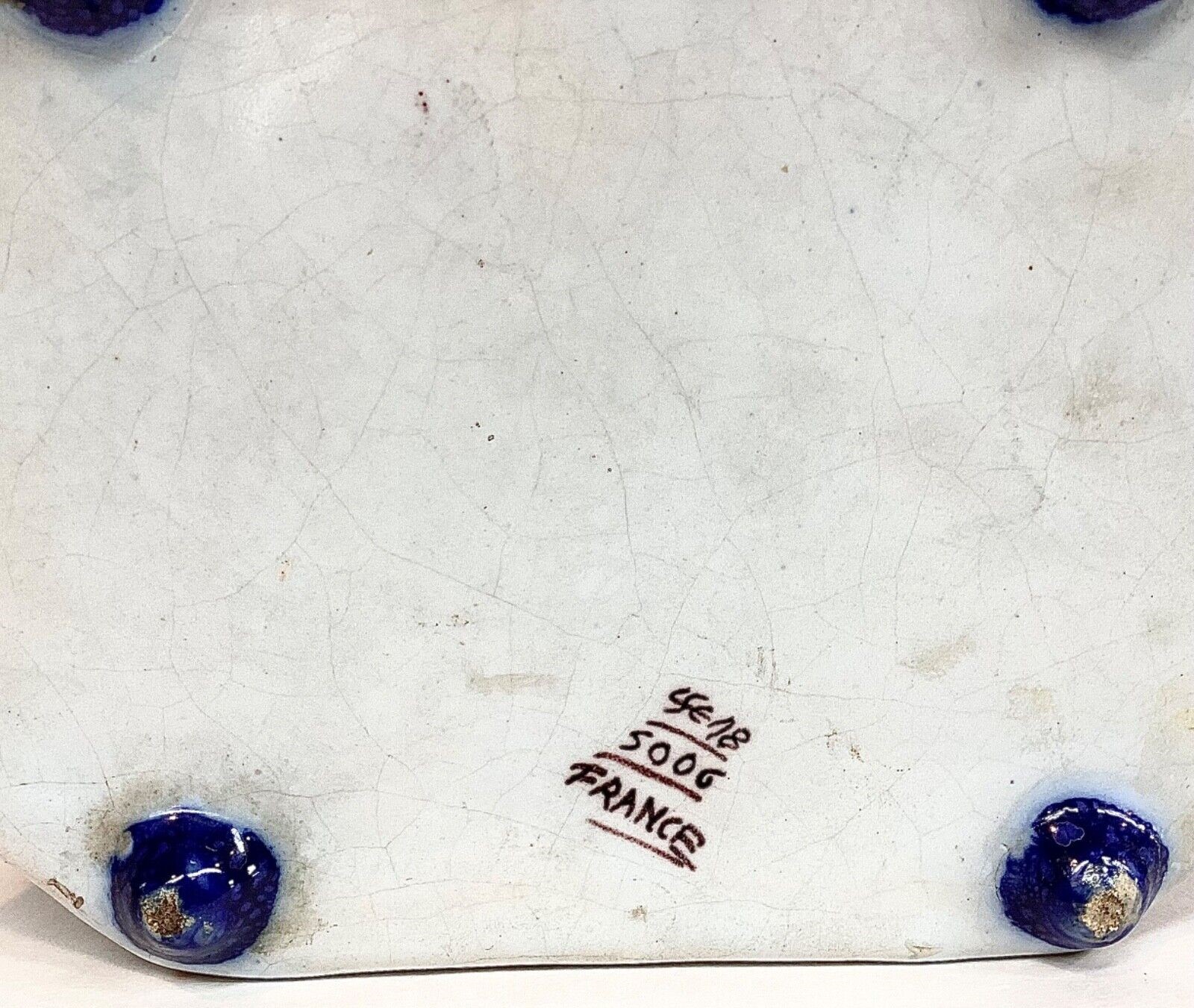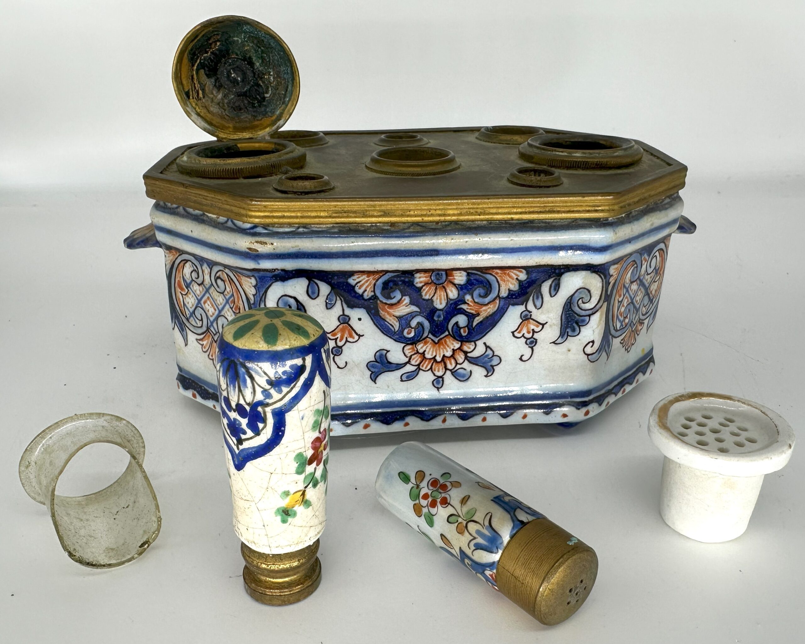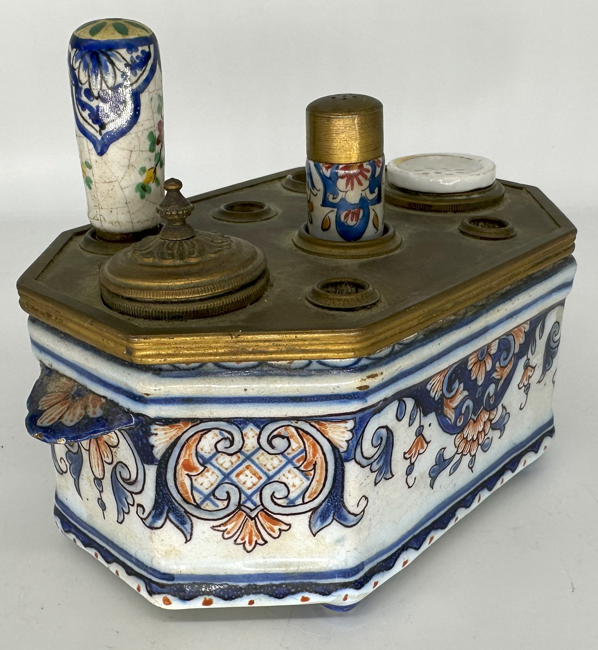 The rectangular base is hand painted with intricate blue, orange, and white floral motifs. The bronze top houses an inkwell, sander, and two wax sealers. Unidentified mark on the base, numbered 5006, marked “France”.