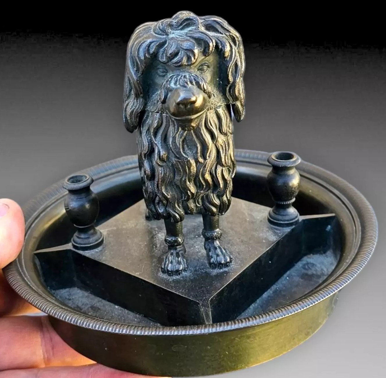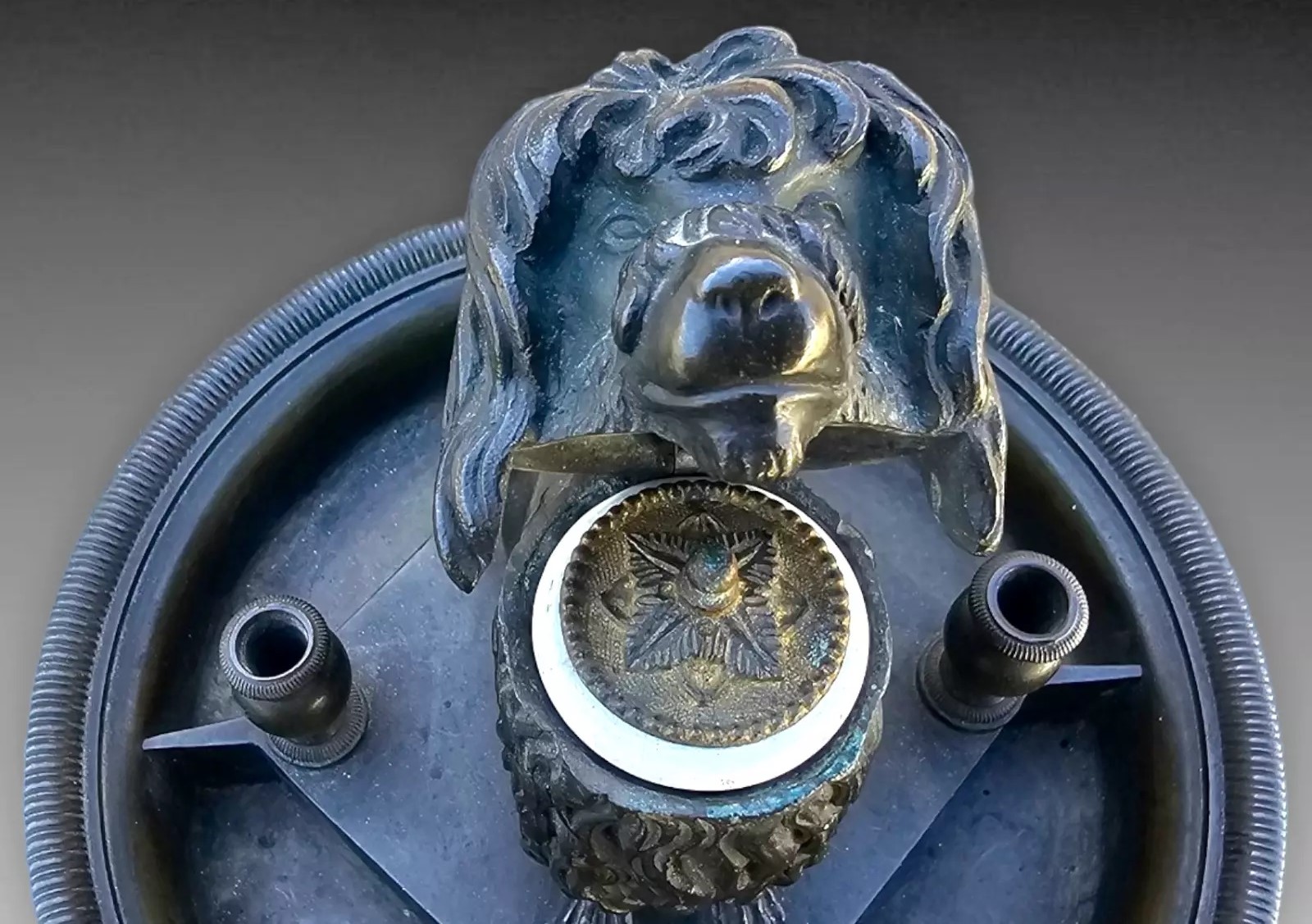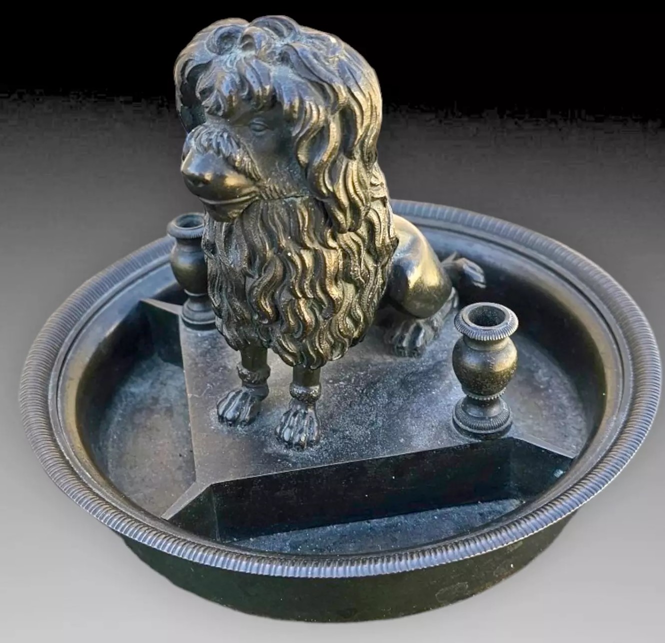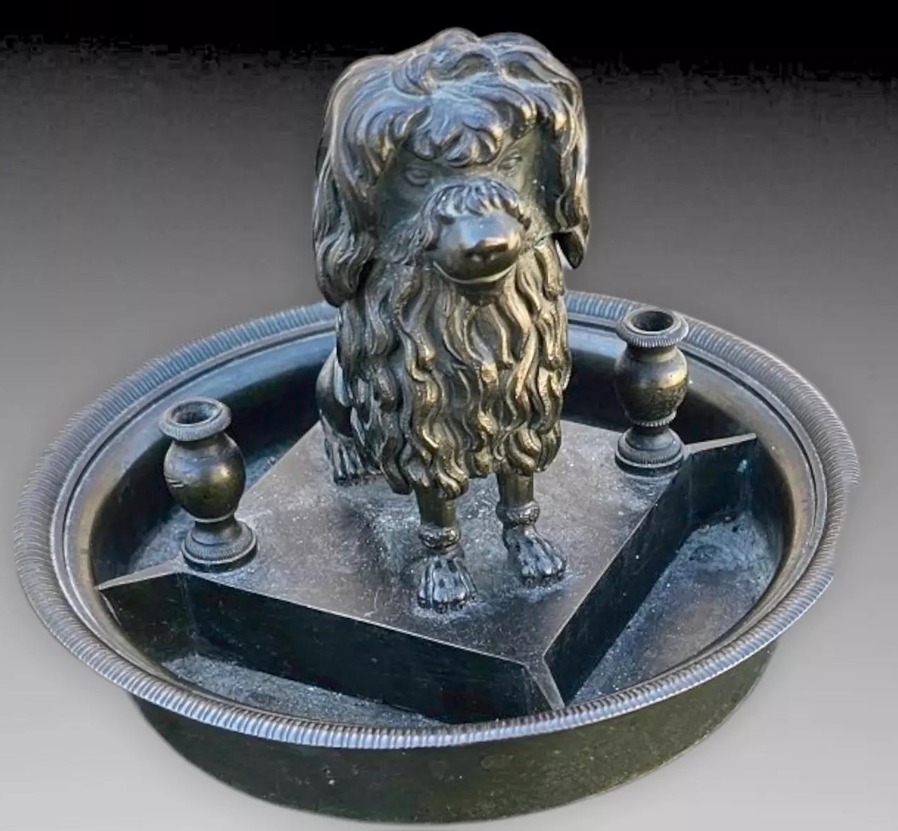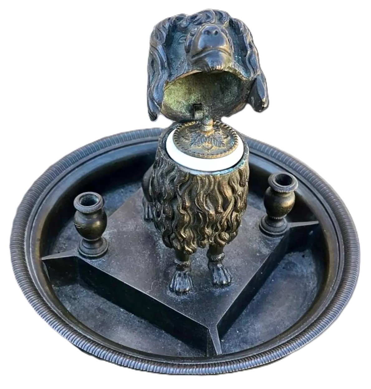 This inkwell features a French poodle, with meticulous attention to detail in capturing the dog’s curly fur and expressive face. The poodle’s head serves as a hinged lid, which, when opened, reveals another hinged cover. This secondary cover provides access to the porcelain insert where ink is stored. The inkwell is set on a circular base, which includes two pen holders.