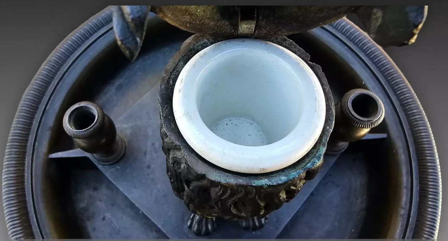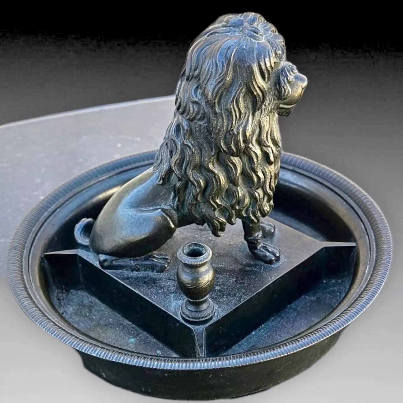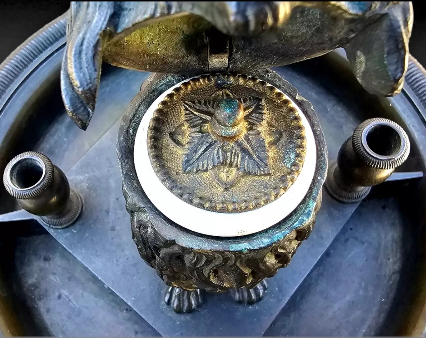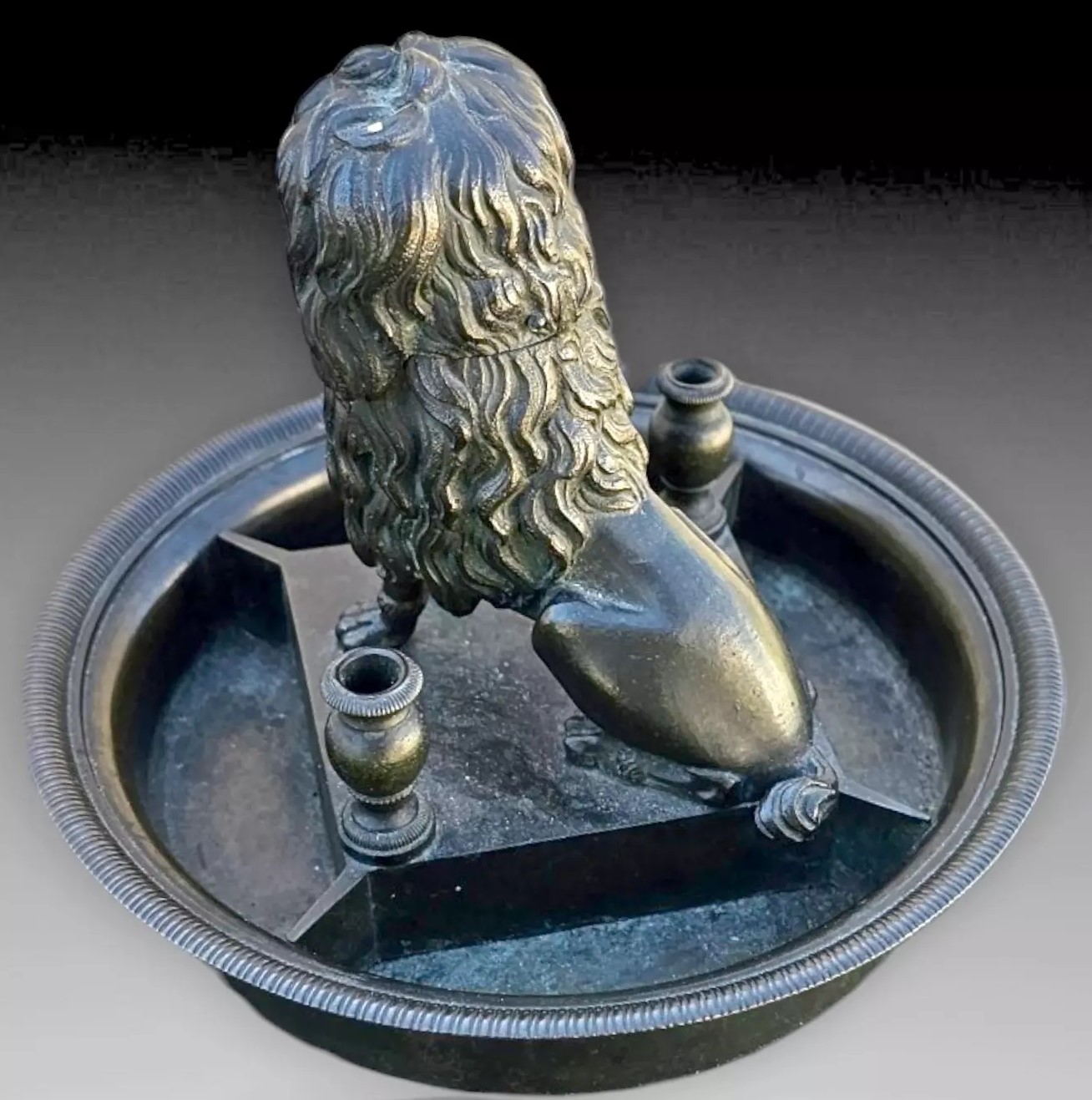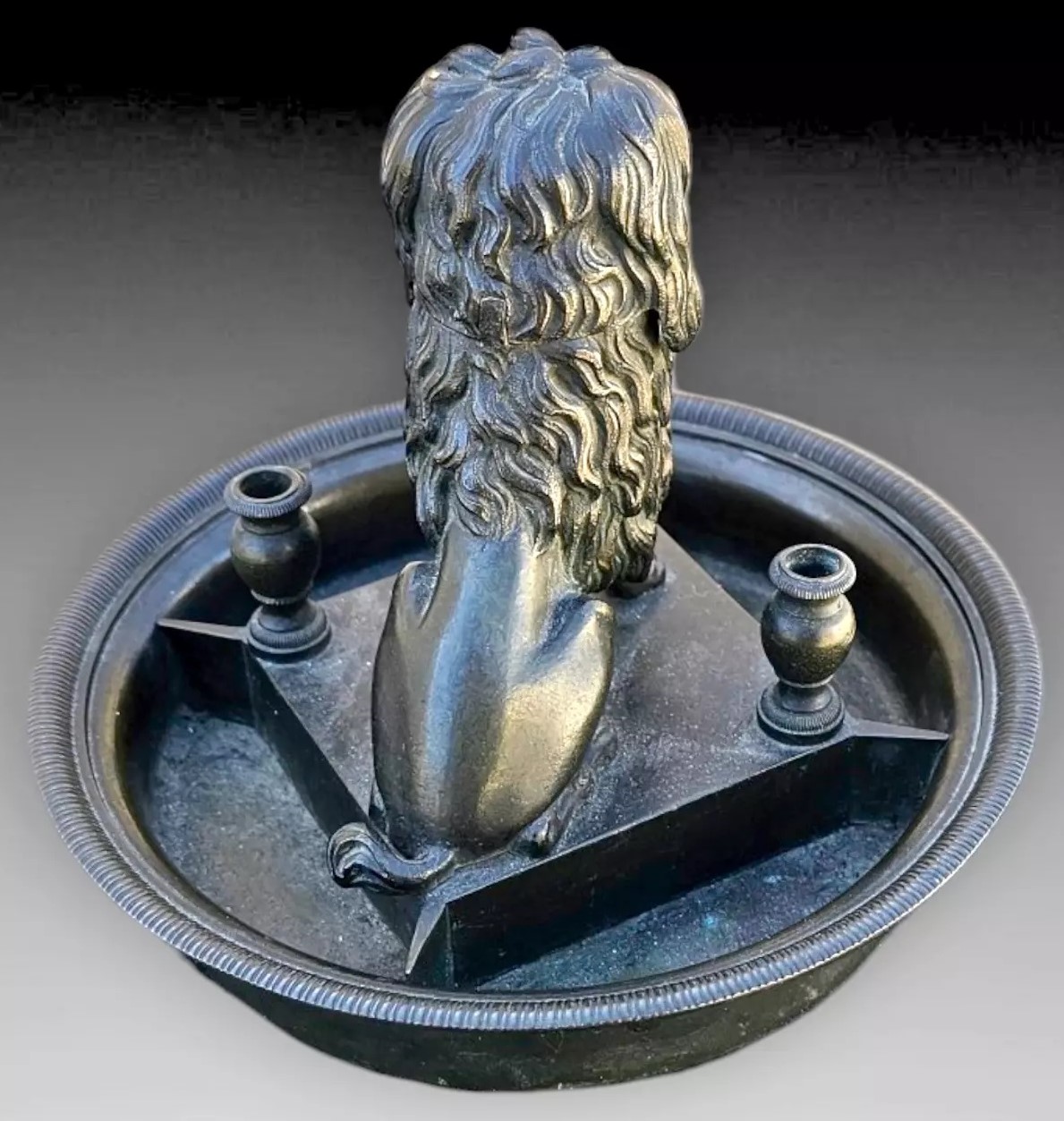 This inkwell features a French poodle, with meticulous attention to detail in capturing the dog’s curly fur and expressive face. The poodle’s head serves as a hinged lid, which, when opened, reveals another hinged cover. This secondary cover provides access to the porcelain insert where ink is stored. The inkwell is set on a circular base, which includes two pen holders.
