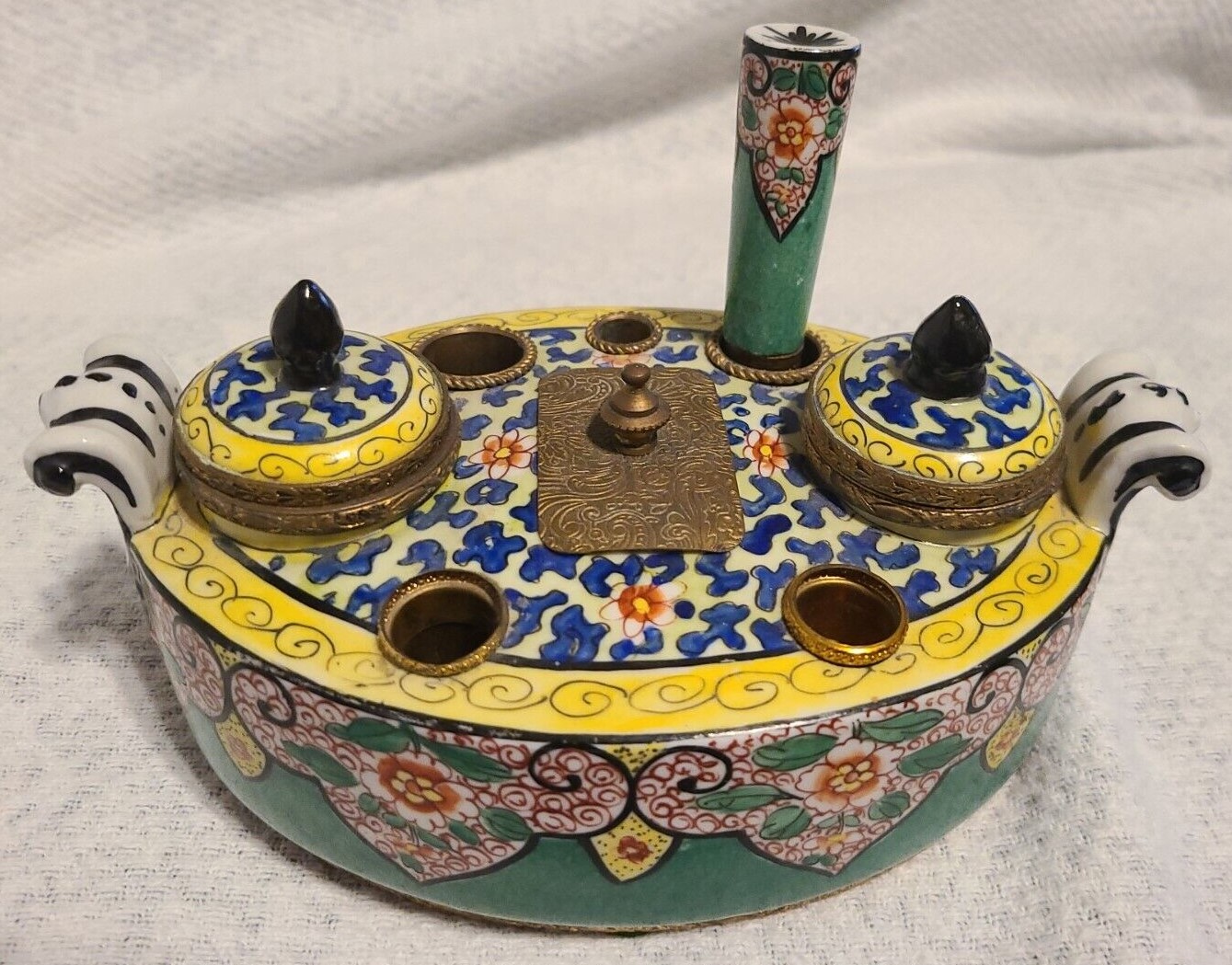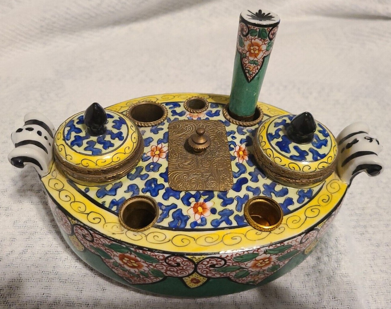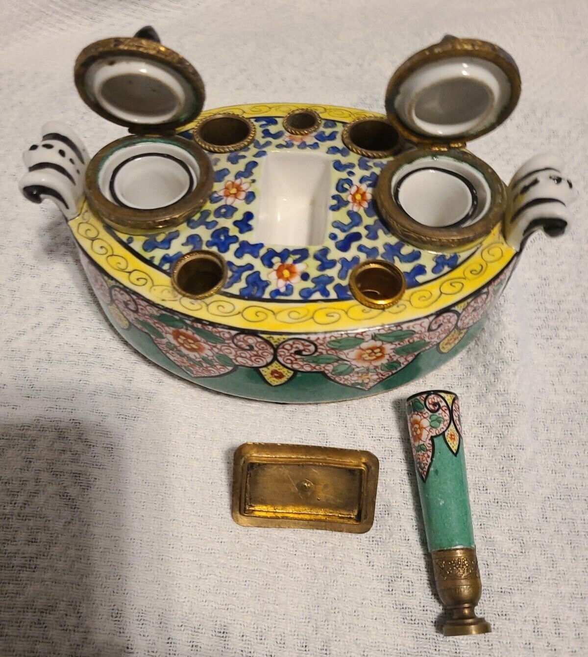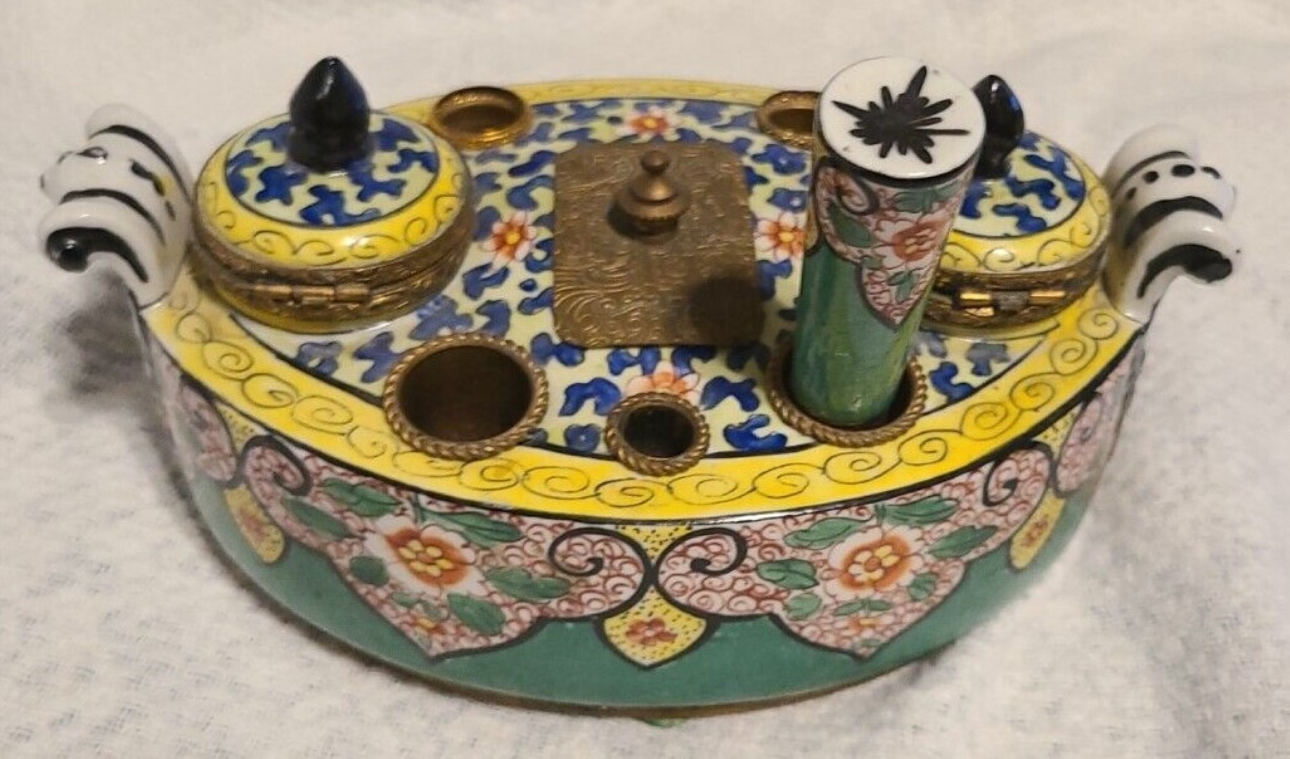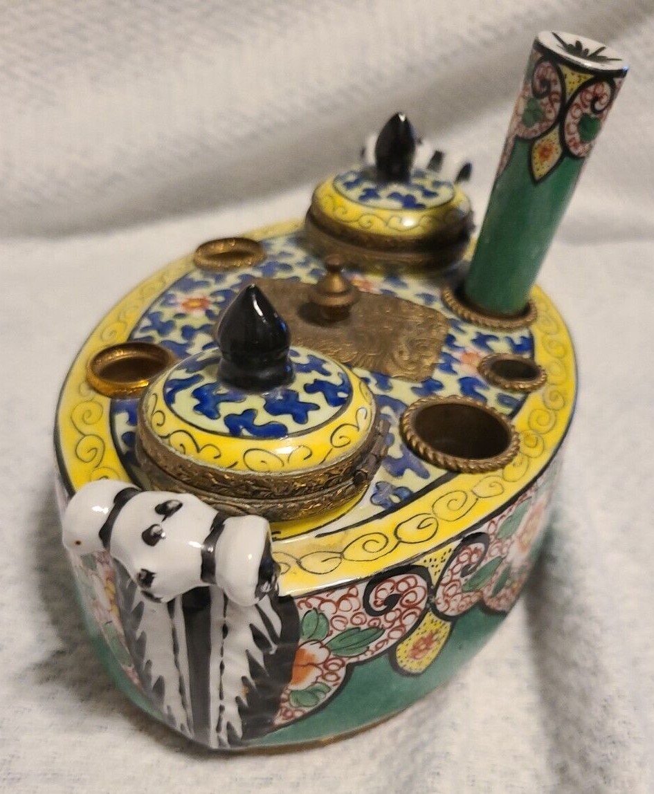 A French porcelain inkstand with ornate gilt brass mounts contains: two inkwells with hinged lids, two seal holes (with one sealer), three quill holes, and a center wafer box with cover. Marked “Made in France”.