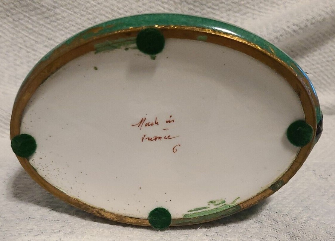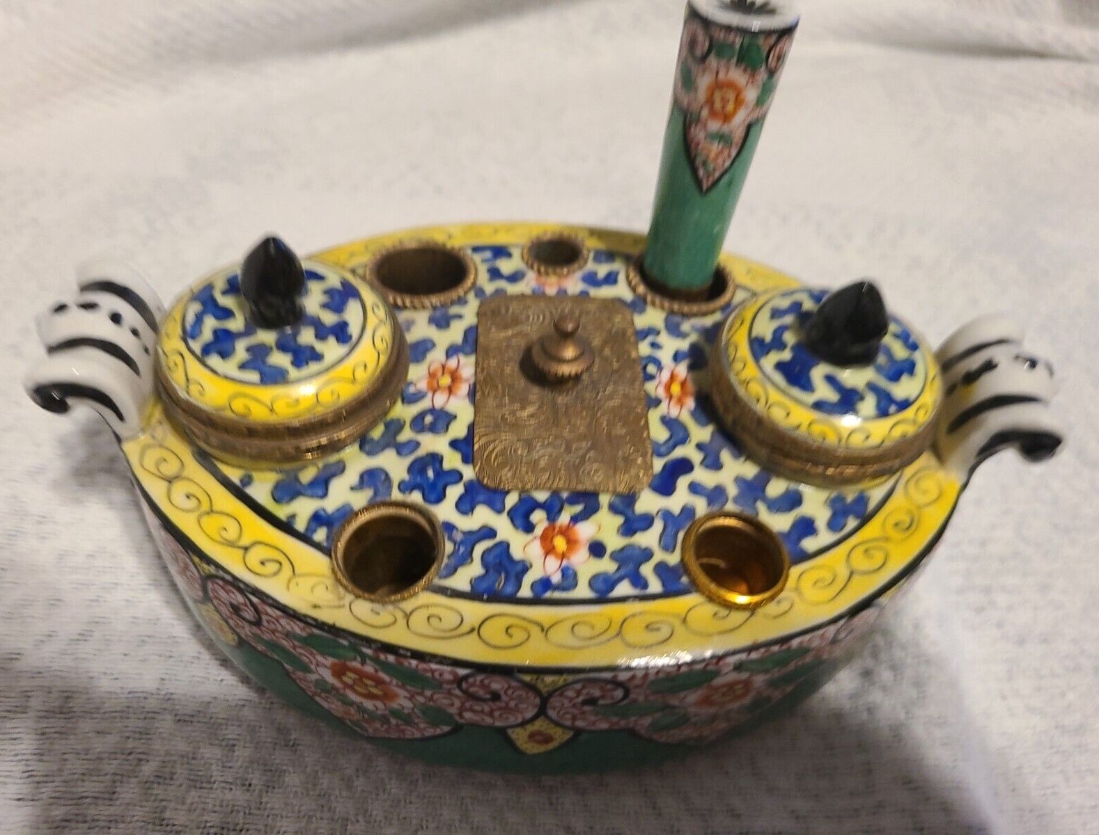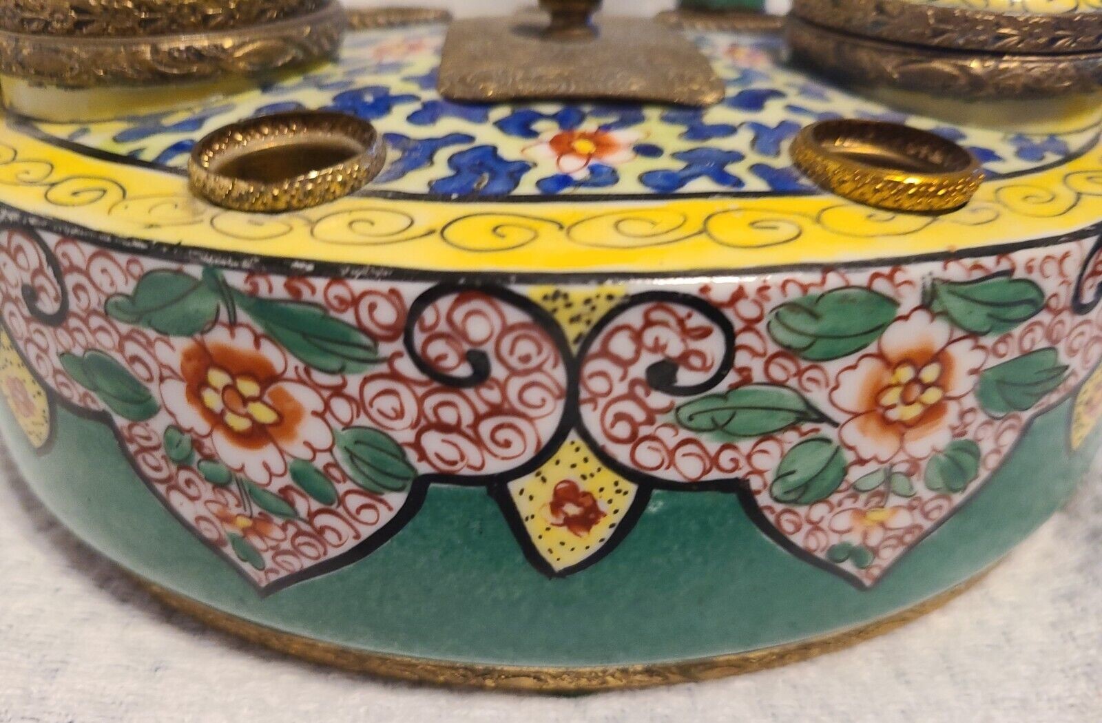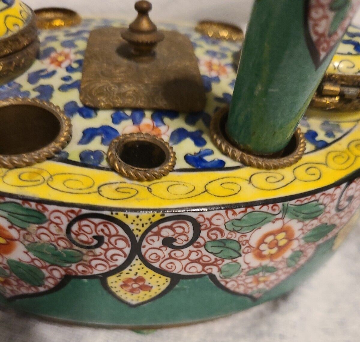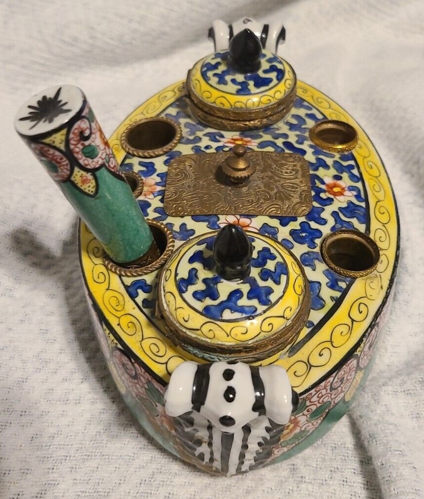 A French porcelain inkstand with ornate gilt brass mounts contains: two inkwells with hinged lids, two seal holes (with one sealer), three quill holes, and a center wafer box with cover. Marked “Made in France”.