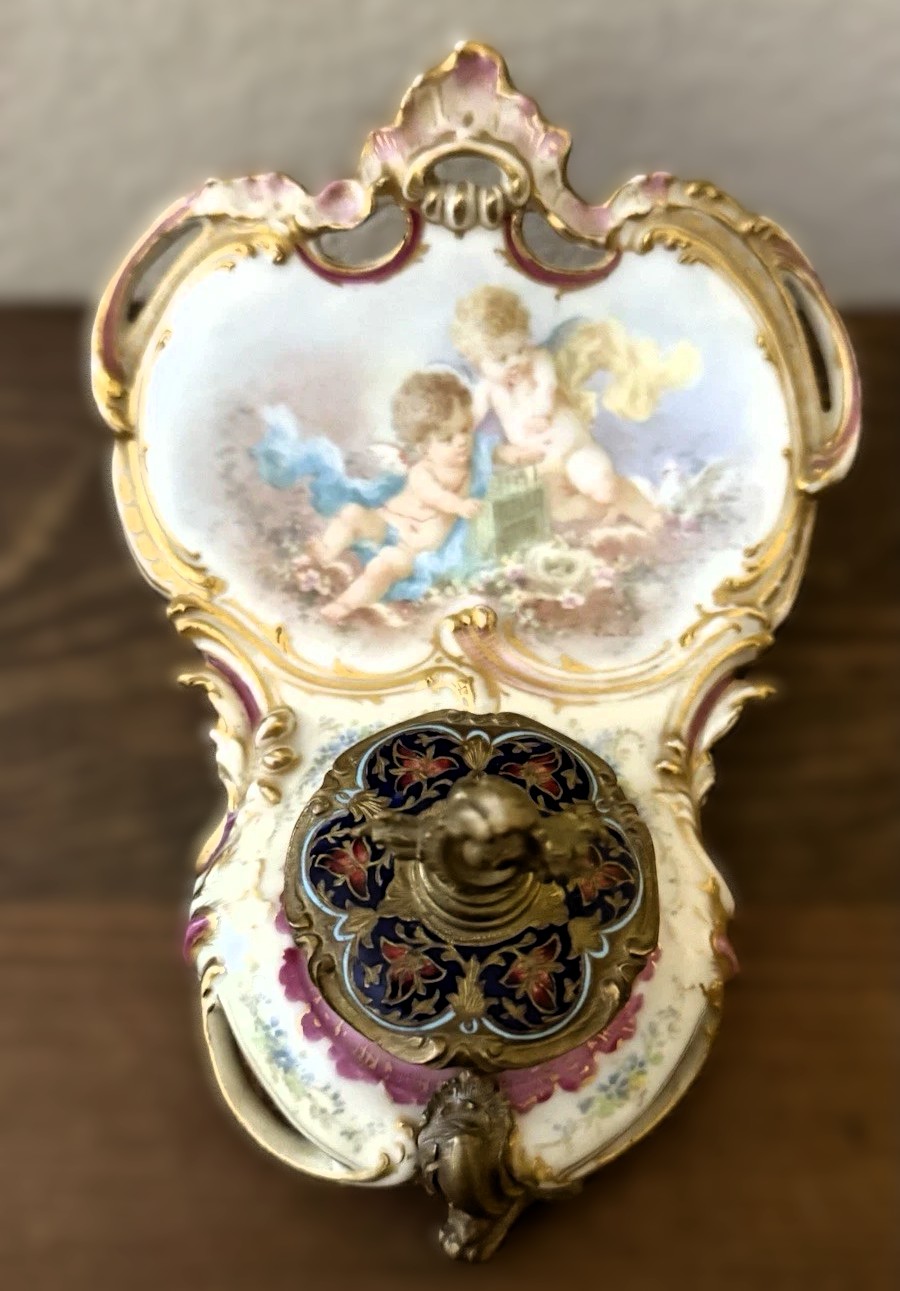 • The Scene: The central backplate features a romantic scene of two cherubs (putti) in a pastoral landscape. One cherub appears to be tending to a small birdcage while the other looks on.
