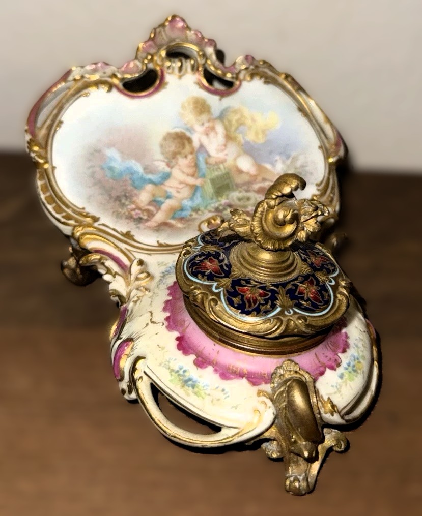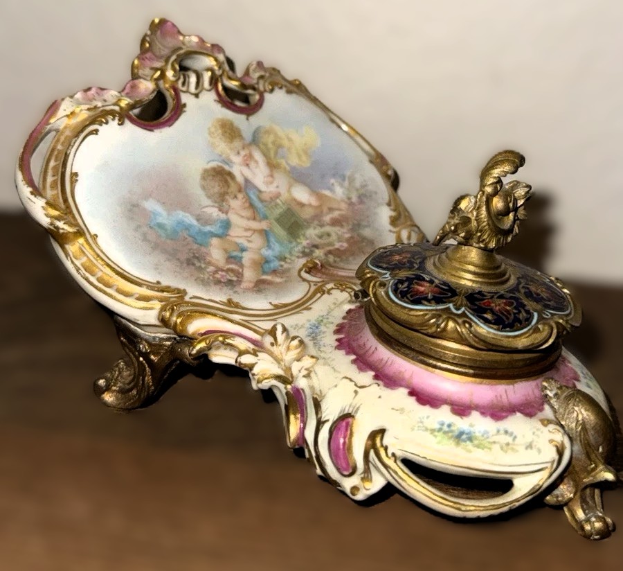 The cherub scene on this inkstand is hand-painted.