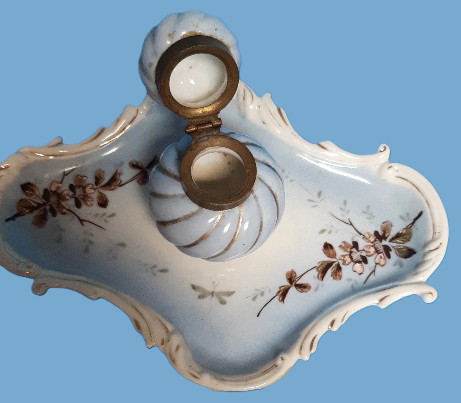 - Inkwell & Lid: The inkwell features a globular body with a matching domed lid, both decorated with a swirled (gadrooned) texture. The porcelain is a pale “baby blue” with hand-painted gilt (gold) accents highlighting the ridges.