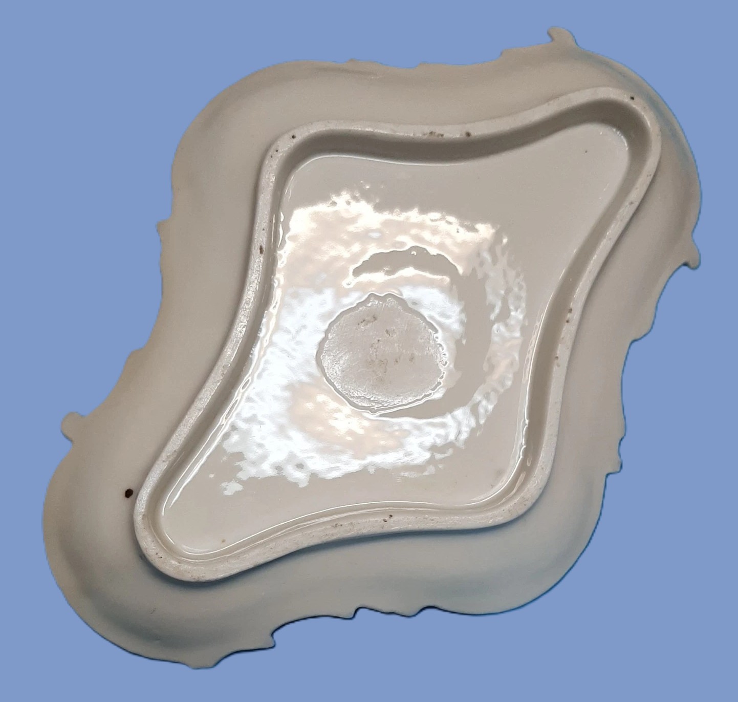 - The Tray: The base is an asymmetrical, scalloped tray with a “rococo” inspired rim. The center is white, fading into a blue ombre at the edges.