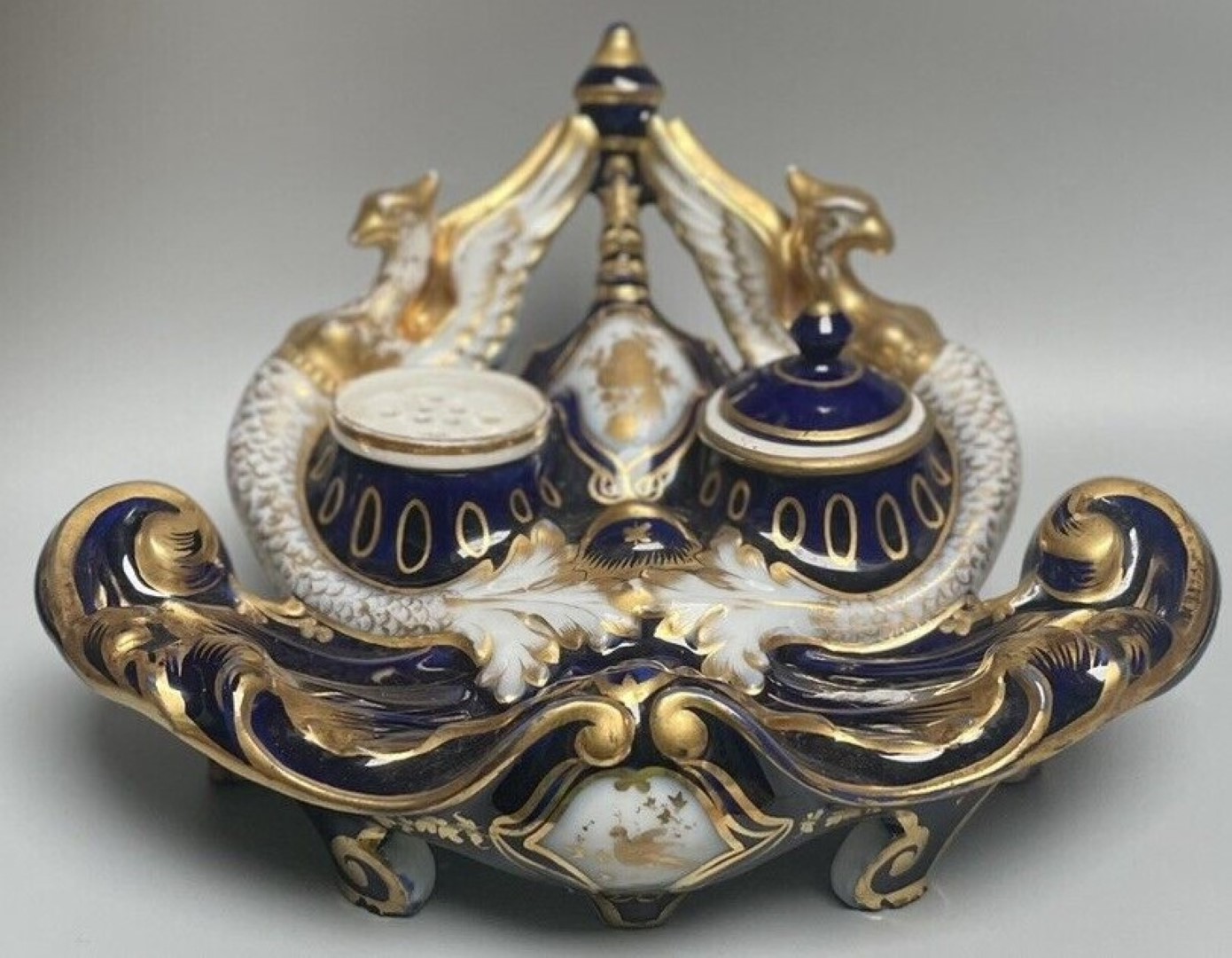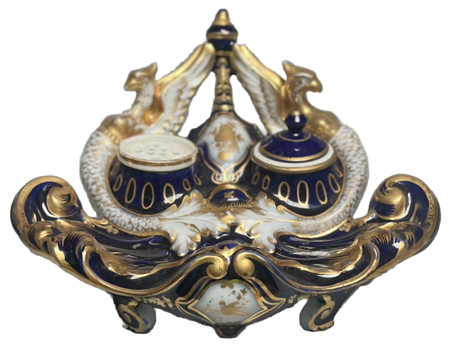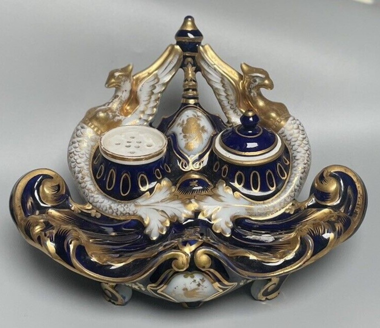 An exotic Art Nouveau inkstand with sinuous lines and intricate detailing, richly colored in dark blues and gold. Two mythological creatures with bird-like heads and serpent tails emerge around the lidded inkwell and sander.