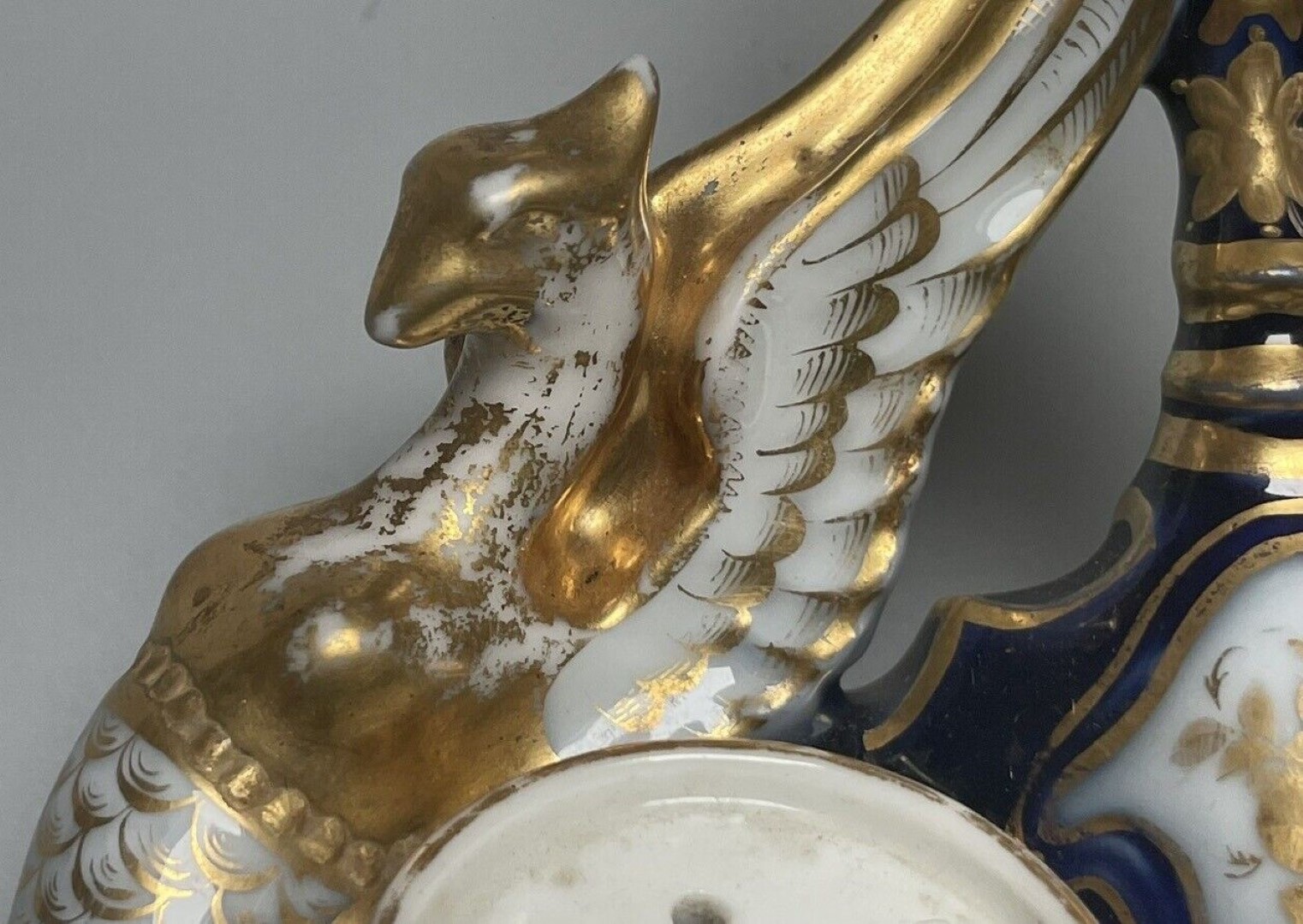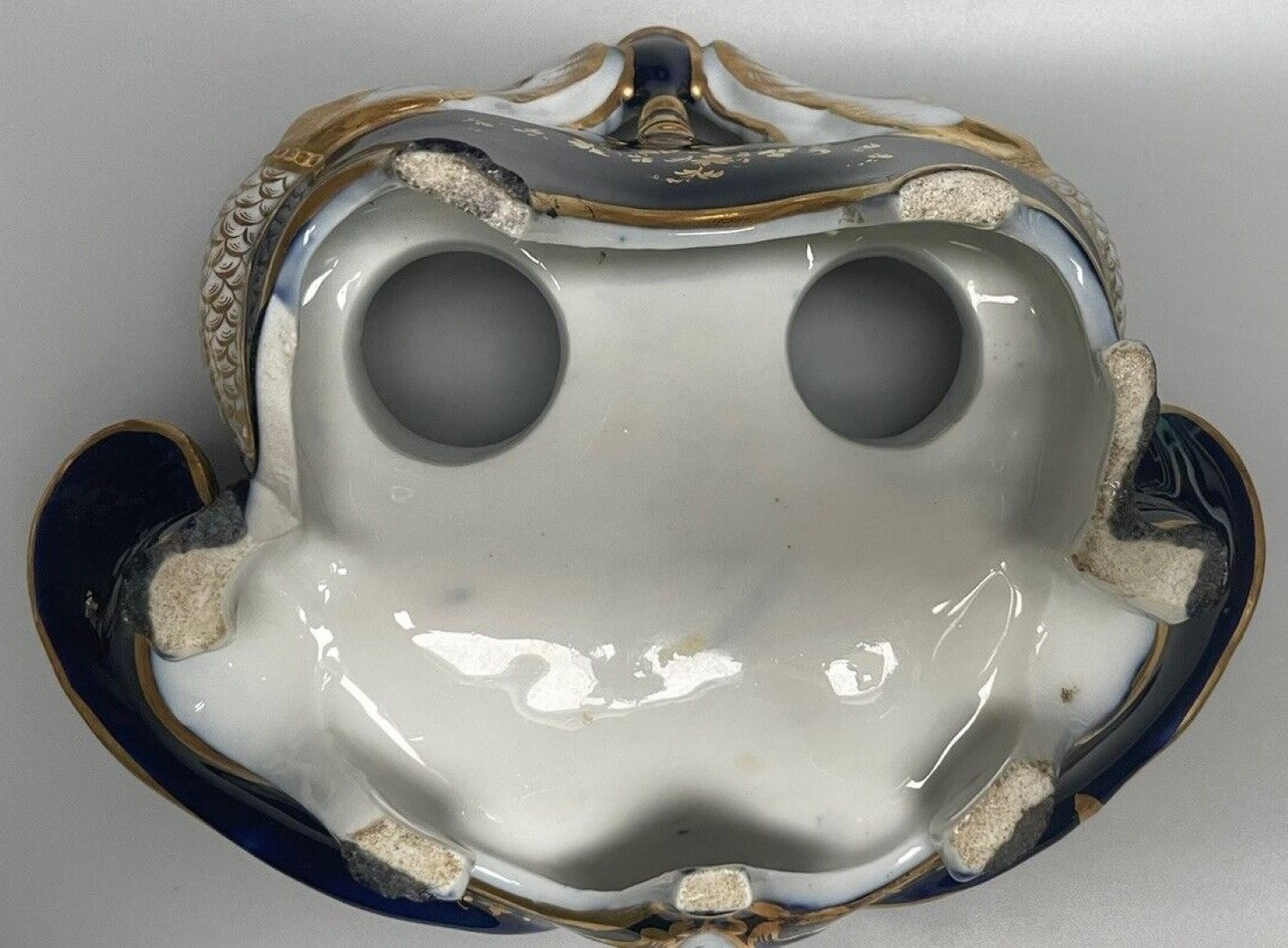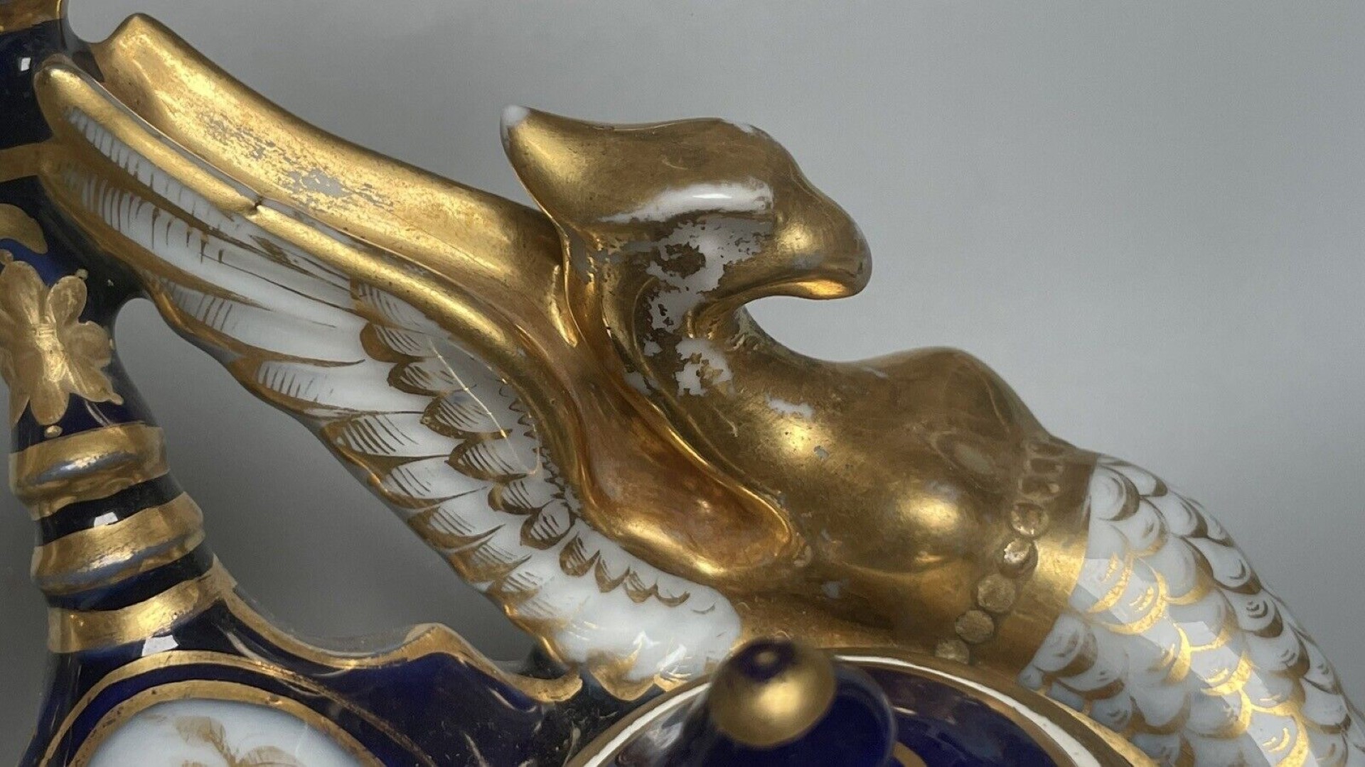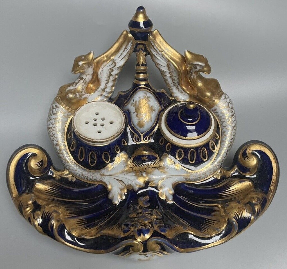 An exotic Art Nouveau inkstand with sinuous lines and intricate detailing, richly colored in dark blues and gold. Two mythological creatures with bird-like heads and serpent tails emerge around the lidded inkwell and sander.