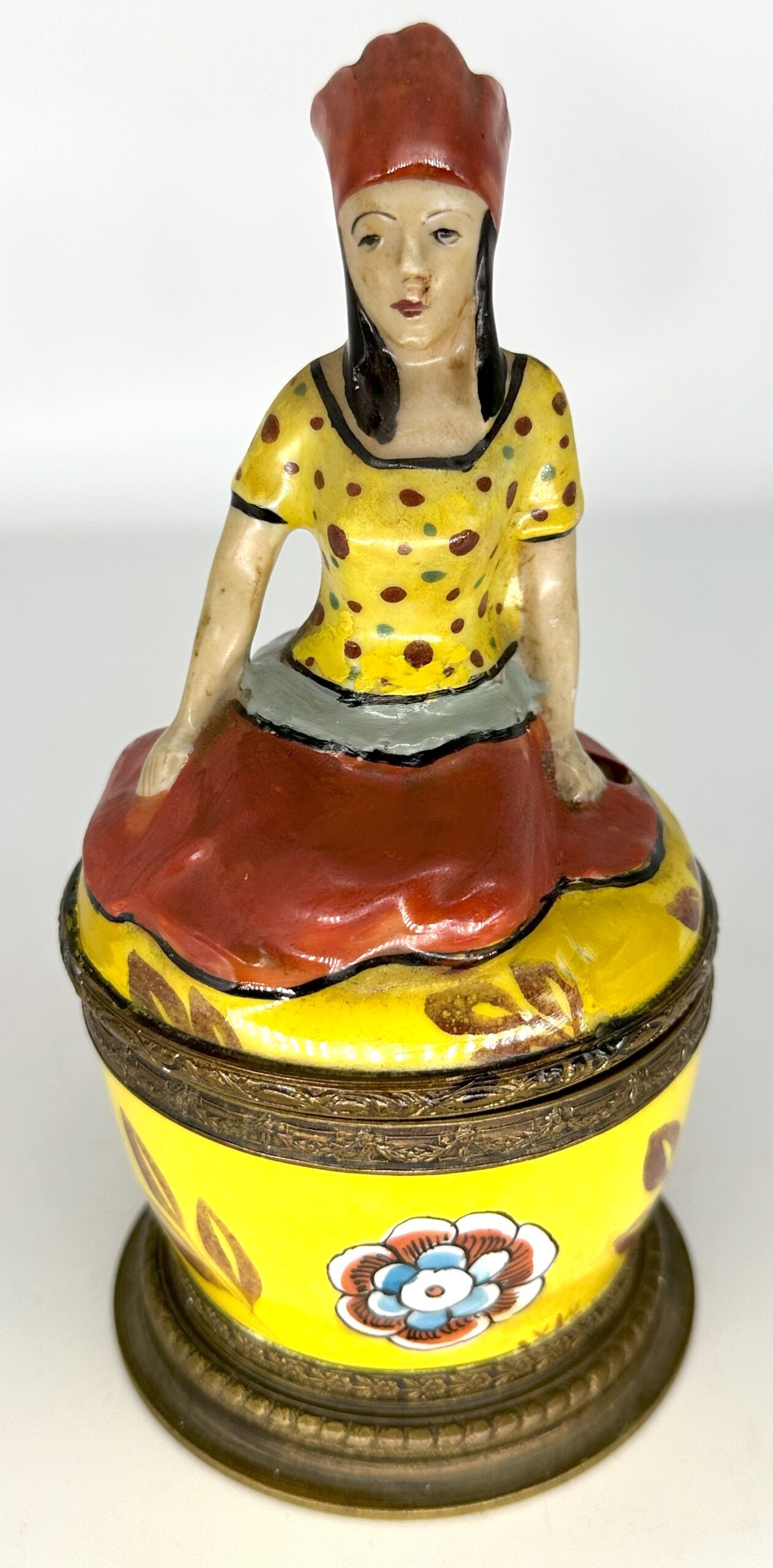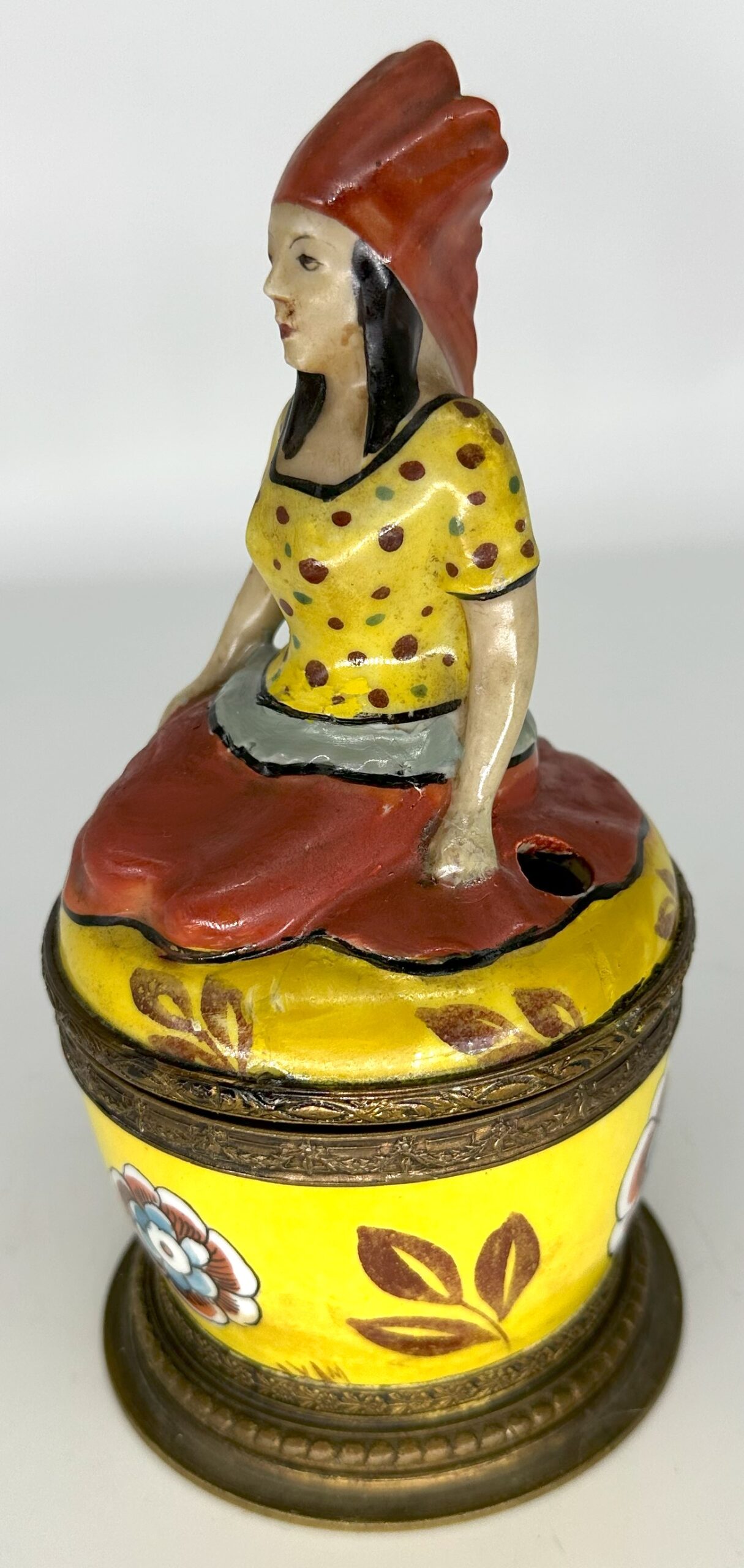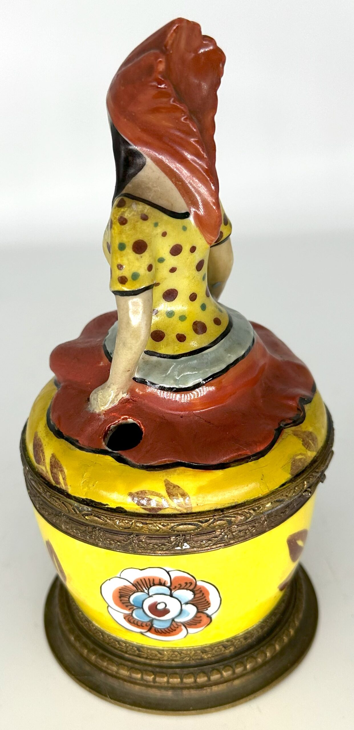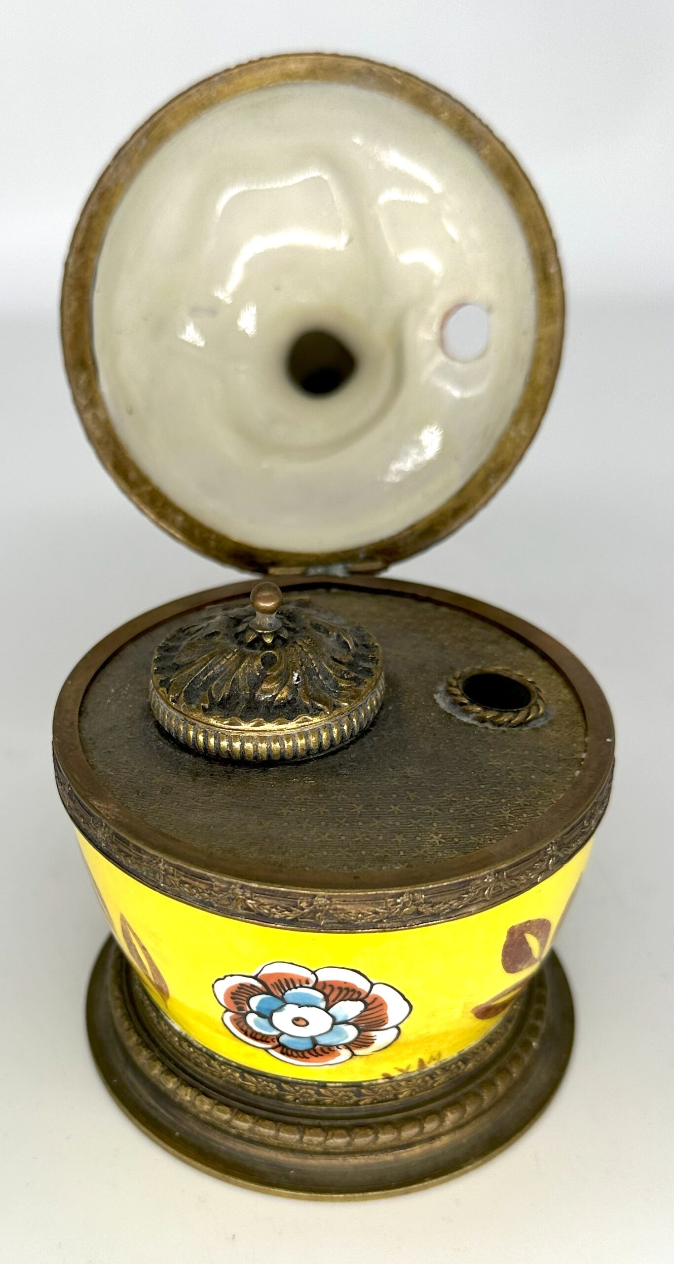 I’m not sure if the woman atop this inkwell is a princess, but she looks regal sitting atop this porcelain inkstand. Marked “Made in France”, the inkstand has bronze mounts with bead trim. The top is hinged, opening to the inkwell (with hinged lid) and a pen hole.