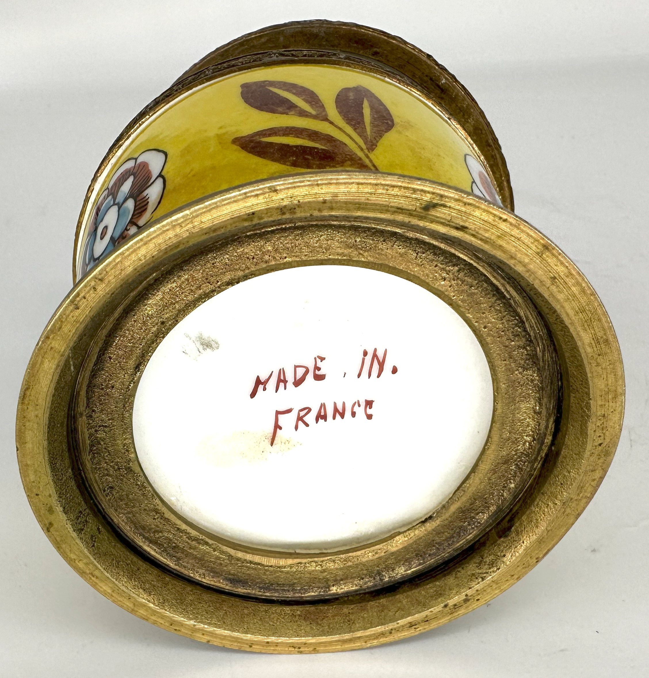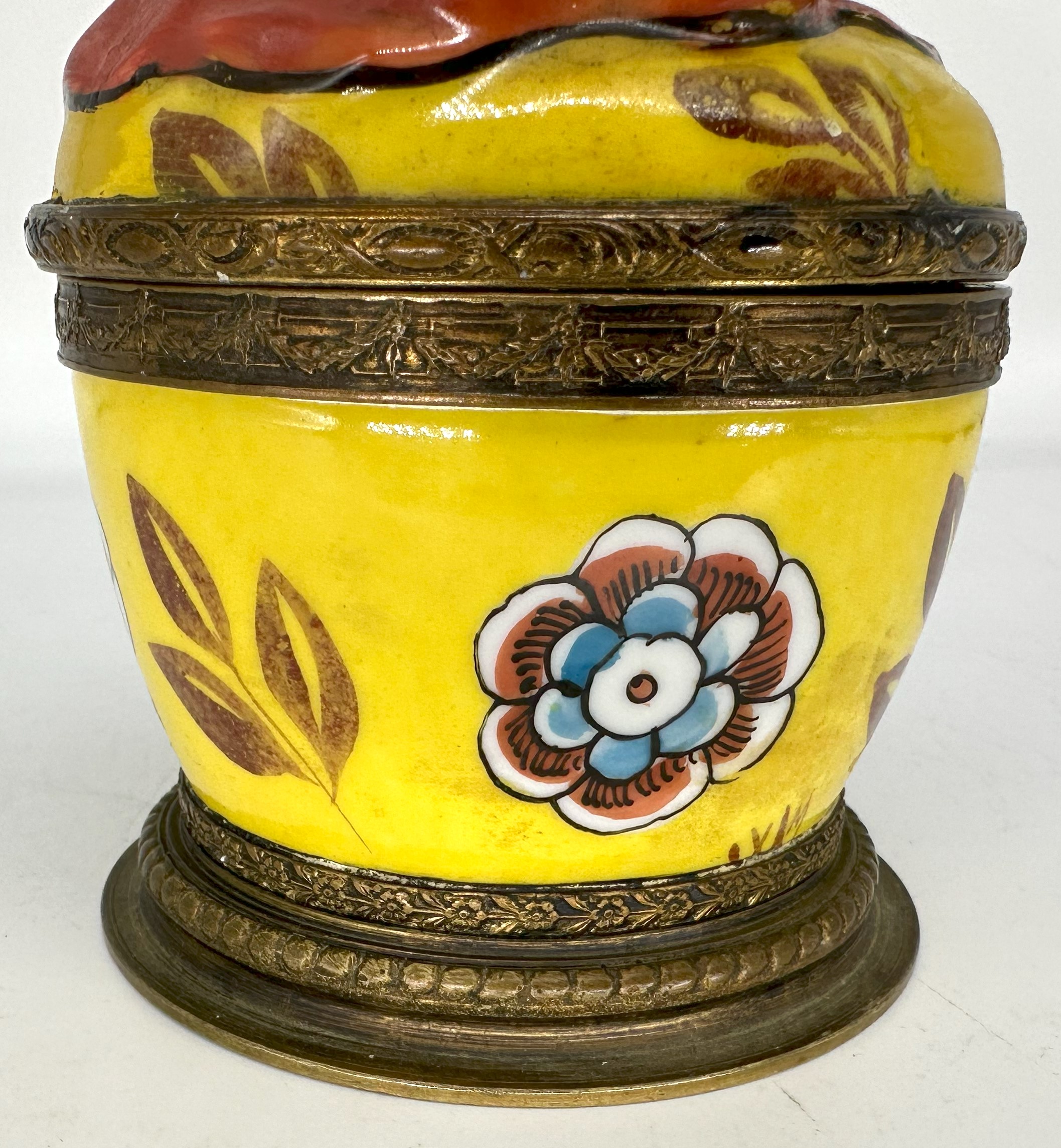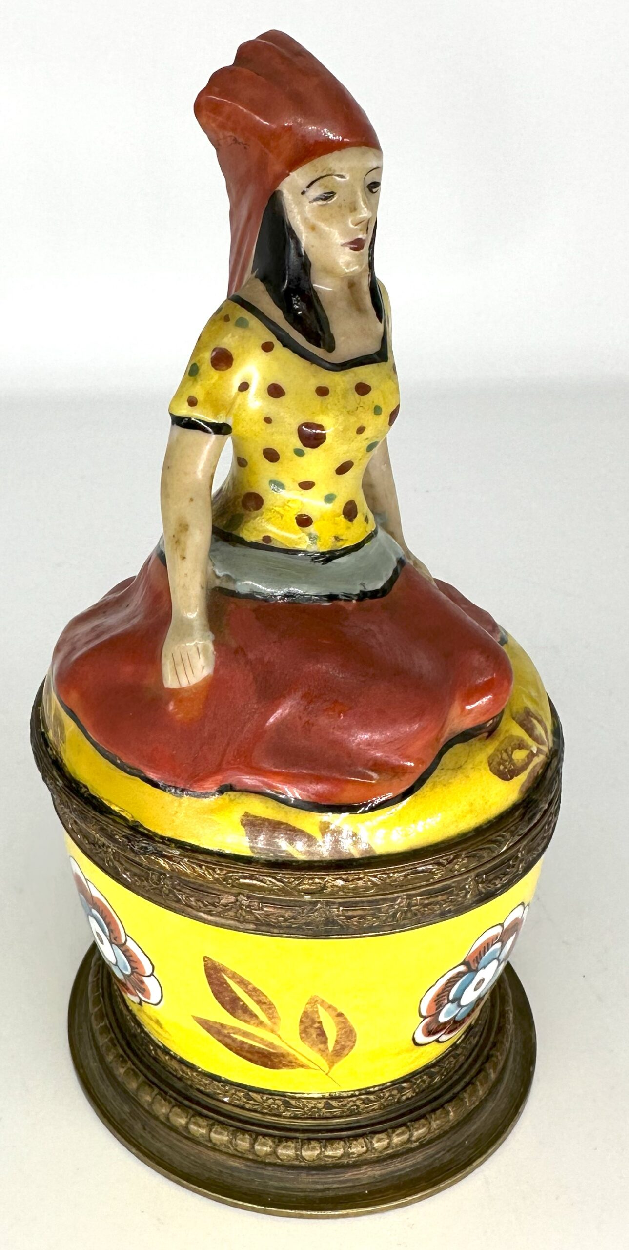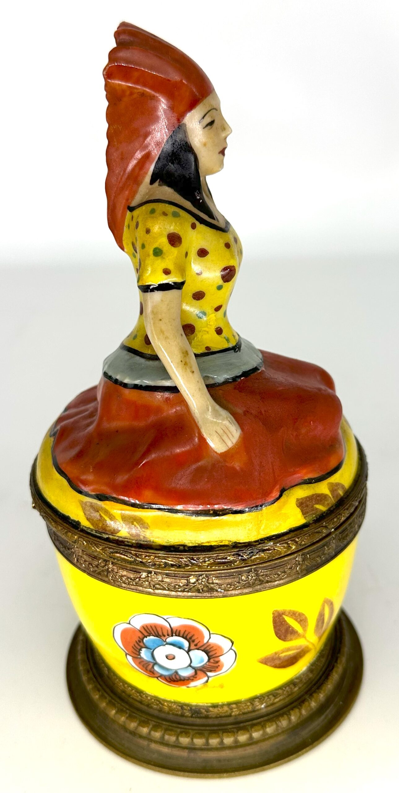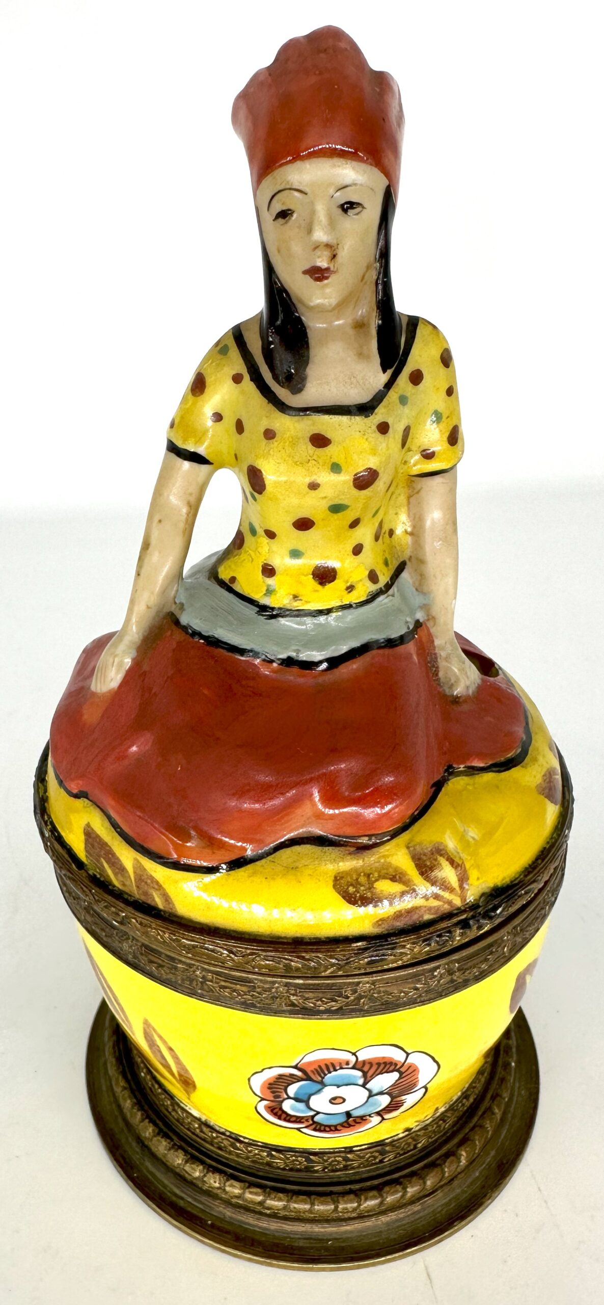 I’m not sure if the woman atop this inkwell is a princess, but she looks regal sitting atop this porcelain inkstand. Marked “Made in France”, the inkstand has bronze mounts with bead trim. The top is hinged, opening to the inkwell (with hinged lid) and a pen hole.