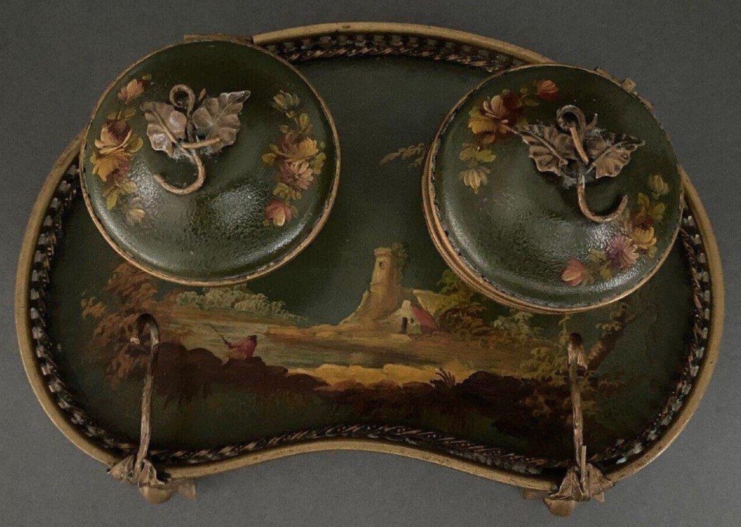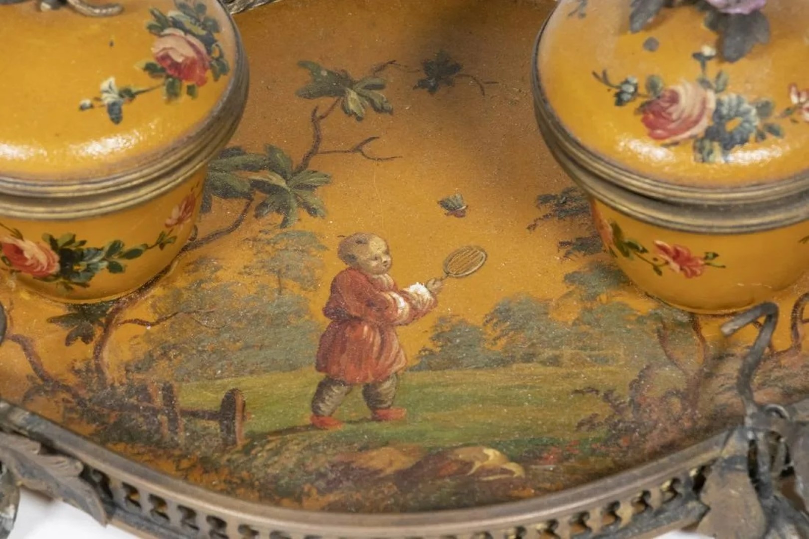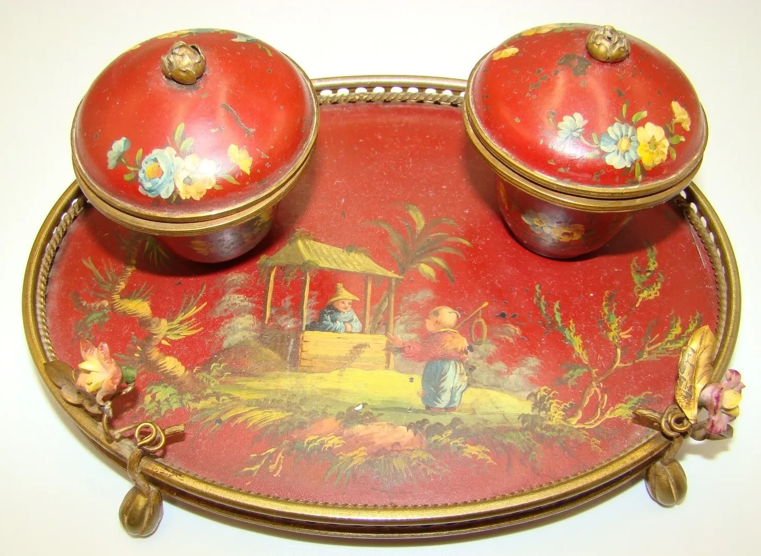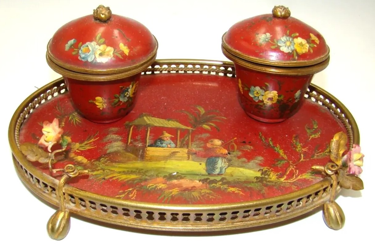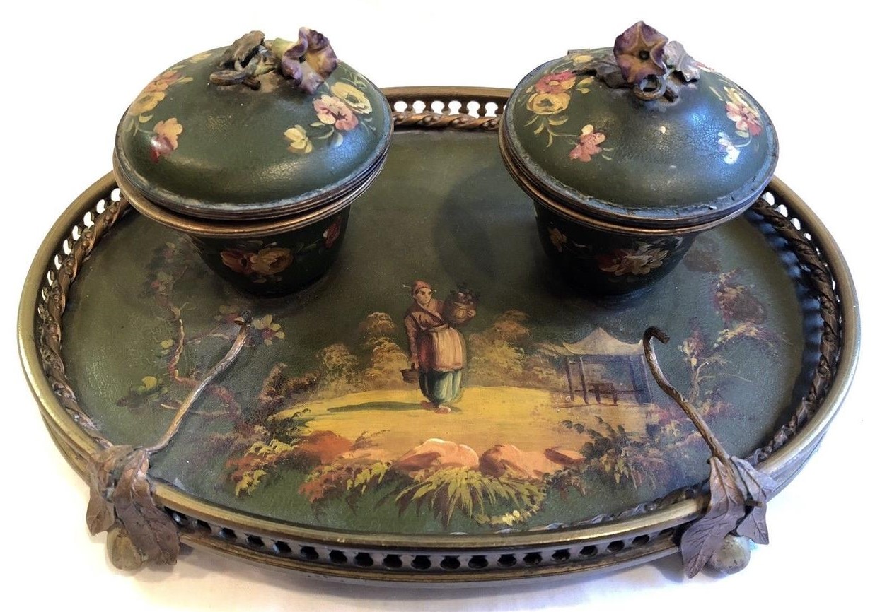 A toleware inkstand with a hand painted scene in the central tray. One depicts an Asian figure with an umbrella. The second is painted with an Asian figure playing badminton. The third is painted with a cartouche representing a cottage and a tower on the banks of a river. The fourth features an Asian figure holding a basket of flowers. The fifth pictures two Asian men.