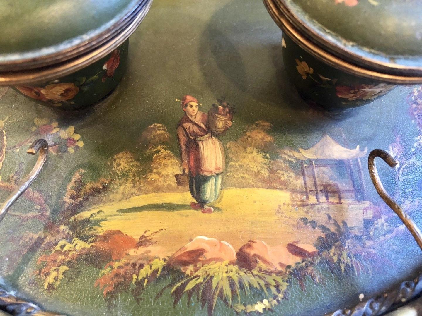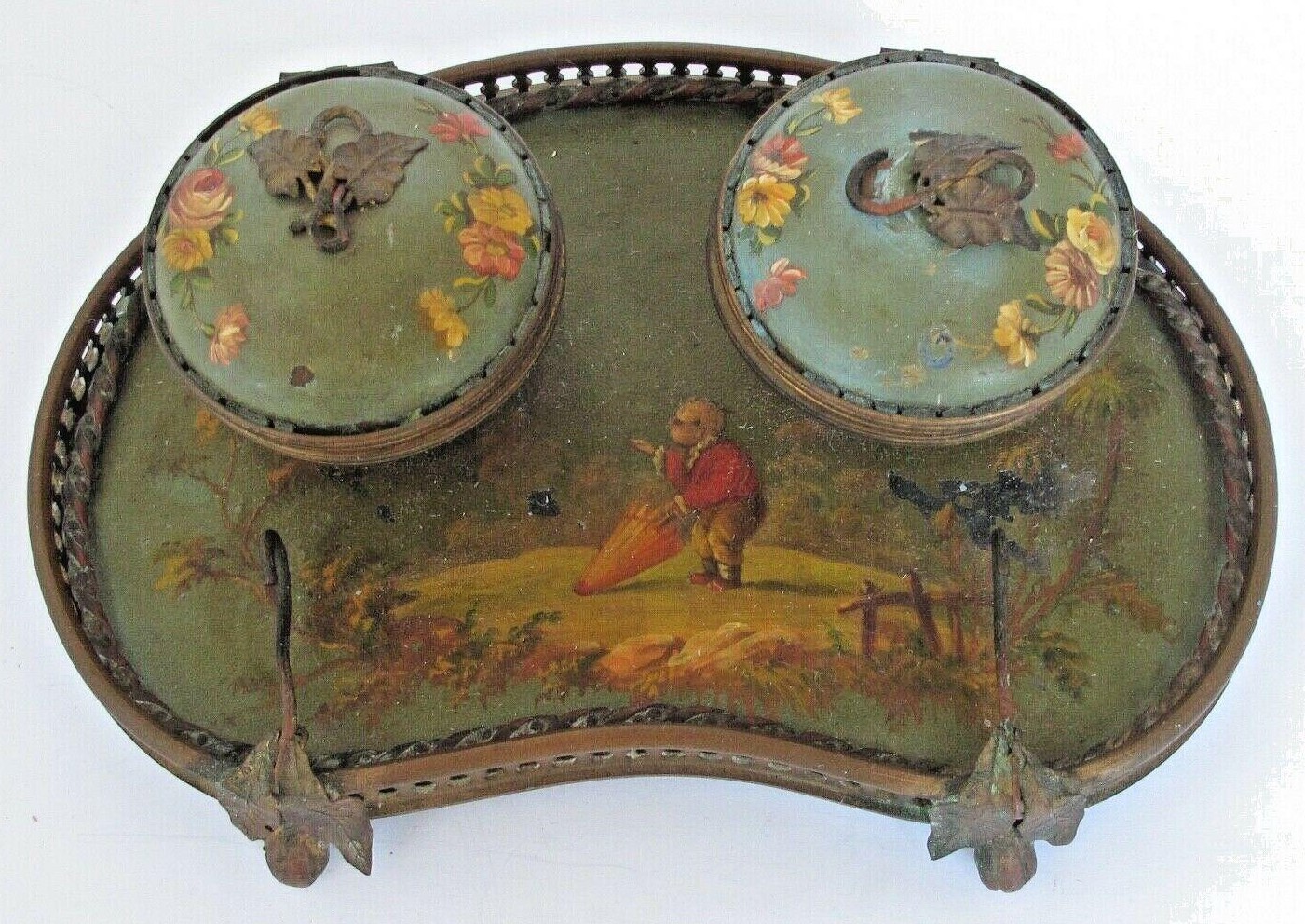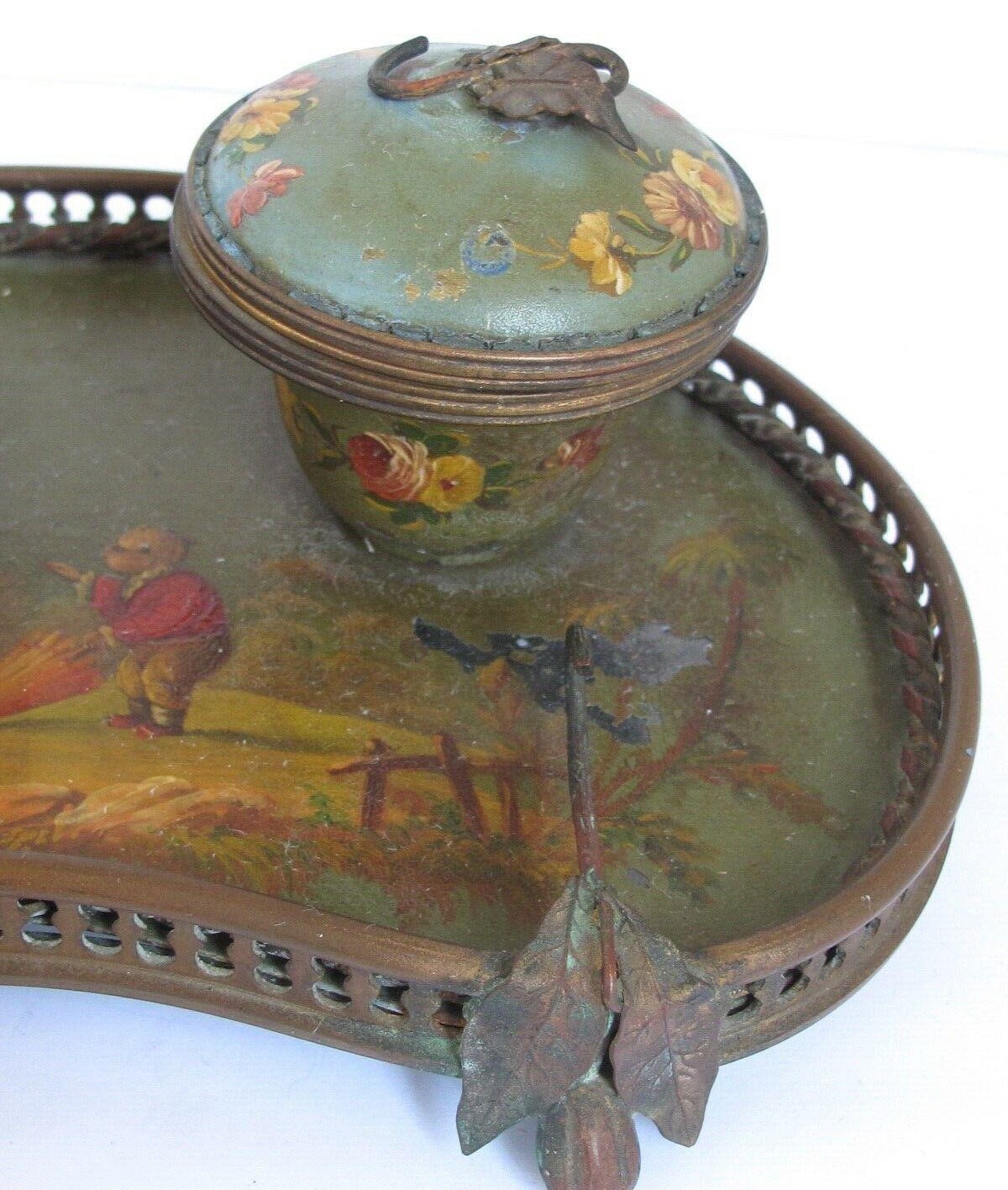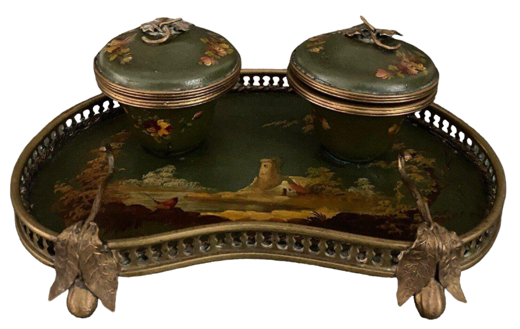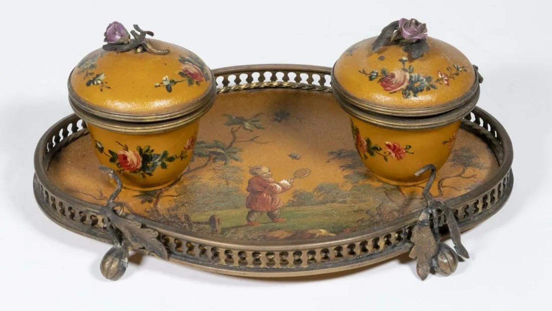 A toleware inkstand with a hand painted scene in the central tray. One depicts an Asian figure with an umbrella. The second is painted with an Asian figure playing badminton. The third is painted with a cartouche representing a cottage and a tower on the banks of a river. The fourth features an Asian figure holding a basket of flowers. The fifth pictures two Asian men.