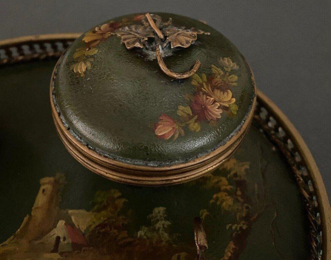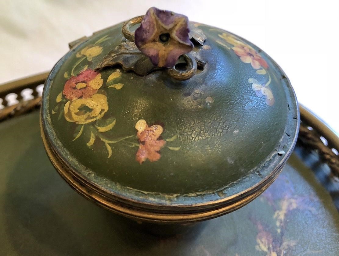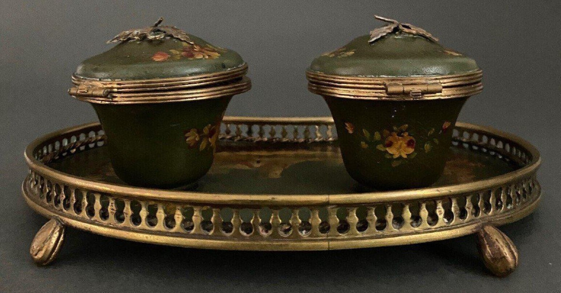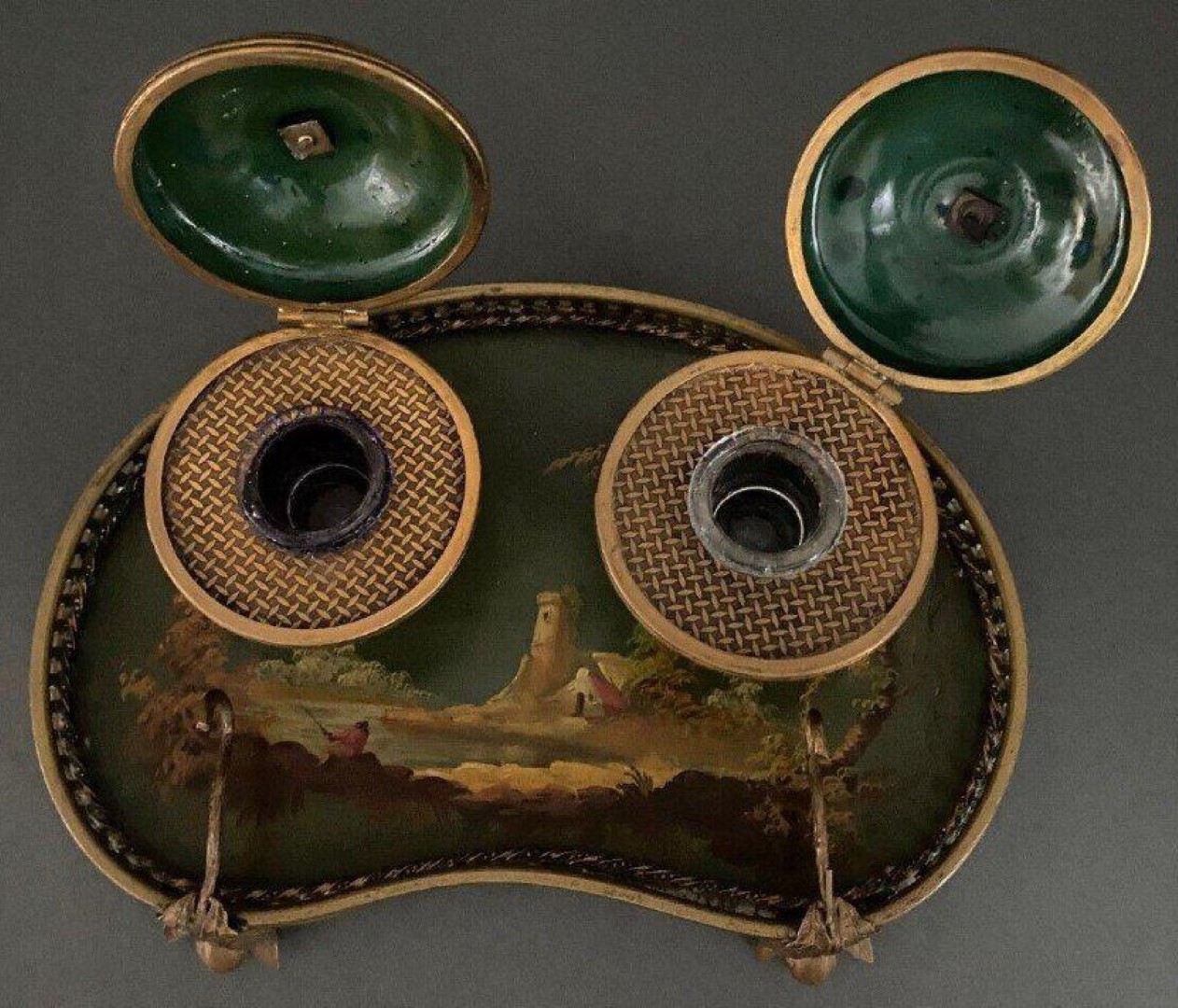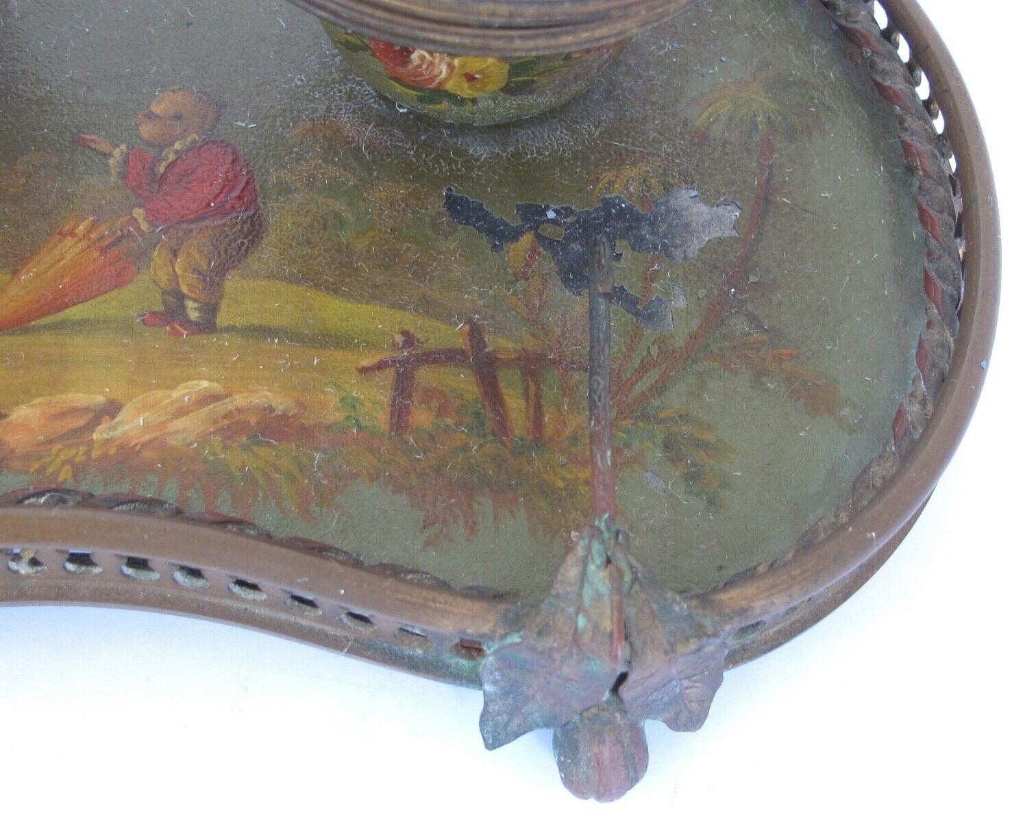A toleware inkstand with a hand painted scene in the central tray. One depicts an Asian figure with an umbrella. The second is painted with an Asian figure playing badminton. The third is painted with a cartouche representing a cottage and a tower on the banks of a river. The fourth features an Asian figure holding a basket of flowers. The fifth pictures two Asian men.