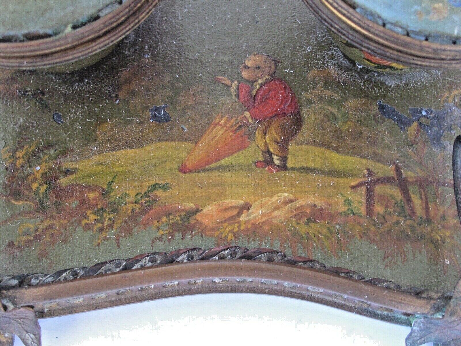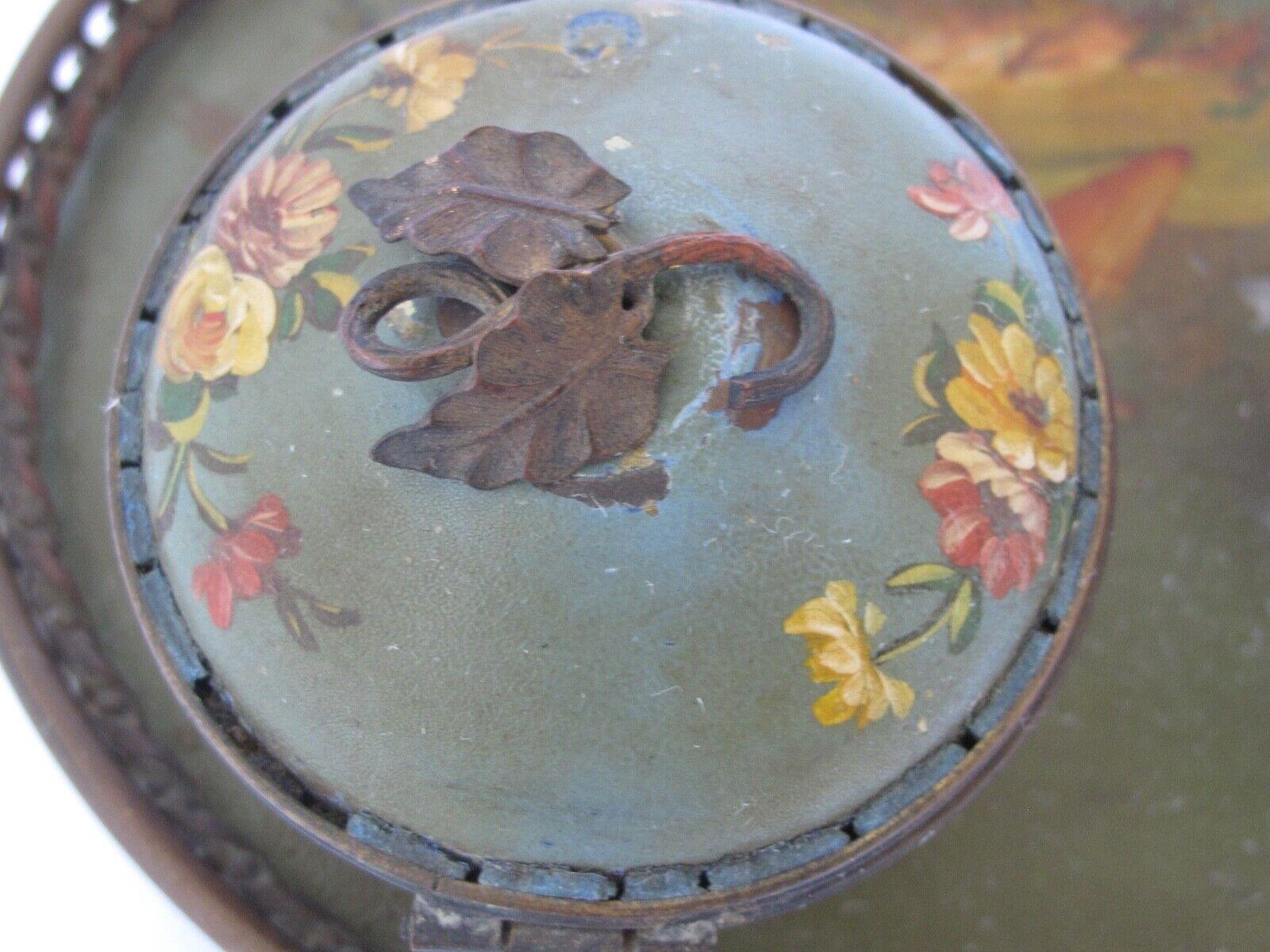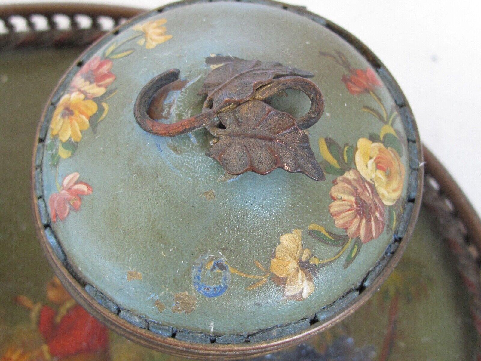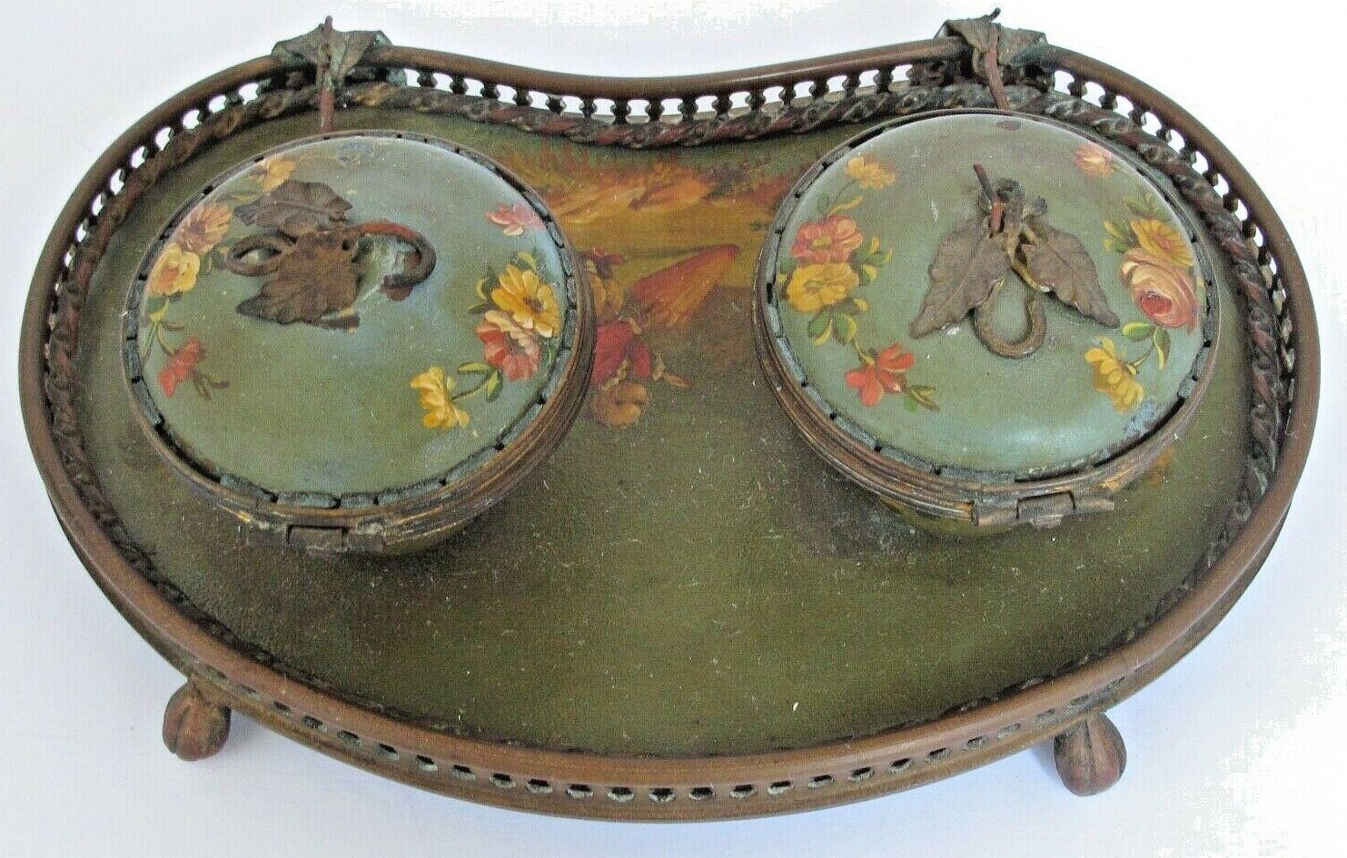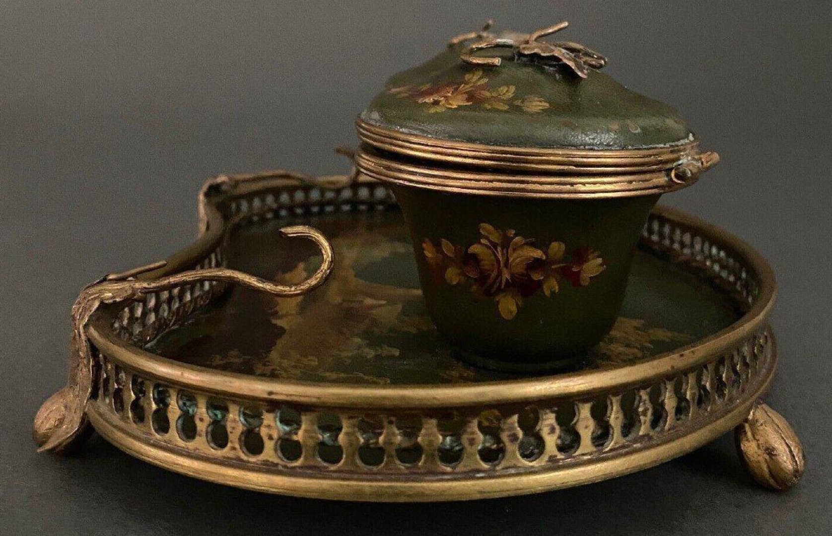 A toleware inkstand with a hand painted scene in the central tray. One depicts an Asian figure with an umbrella. The second is painted with an Asian figure playing badminton. The third is painted with a cartouche representing a cottage and a tower on the banks of a river. The fourth features an Asian figure holding a basket of flowers. The fifth pictures two Asian men.