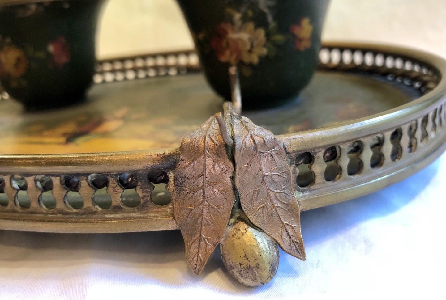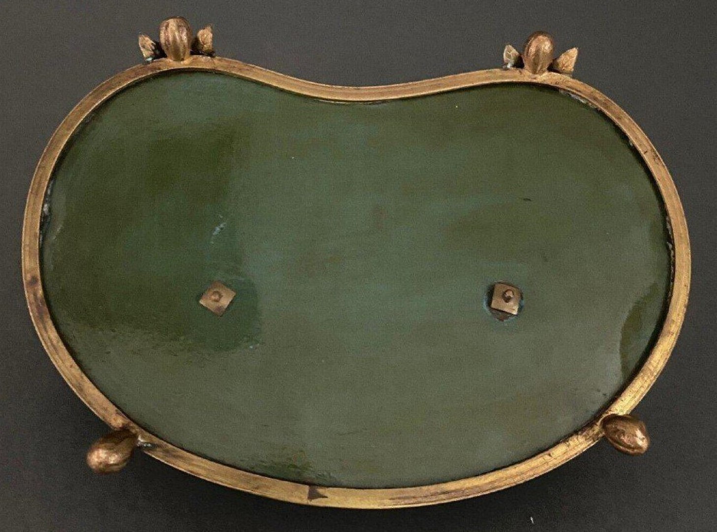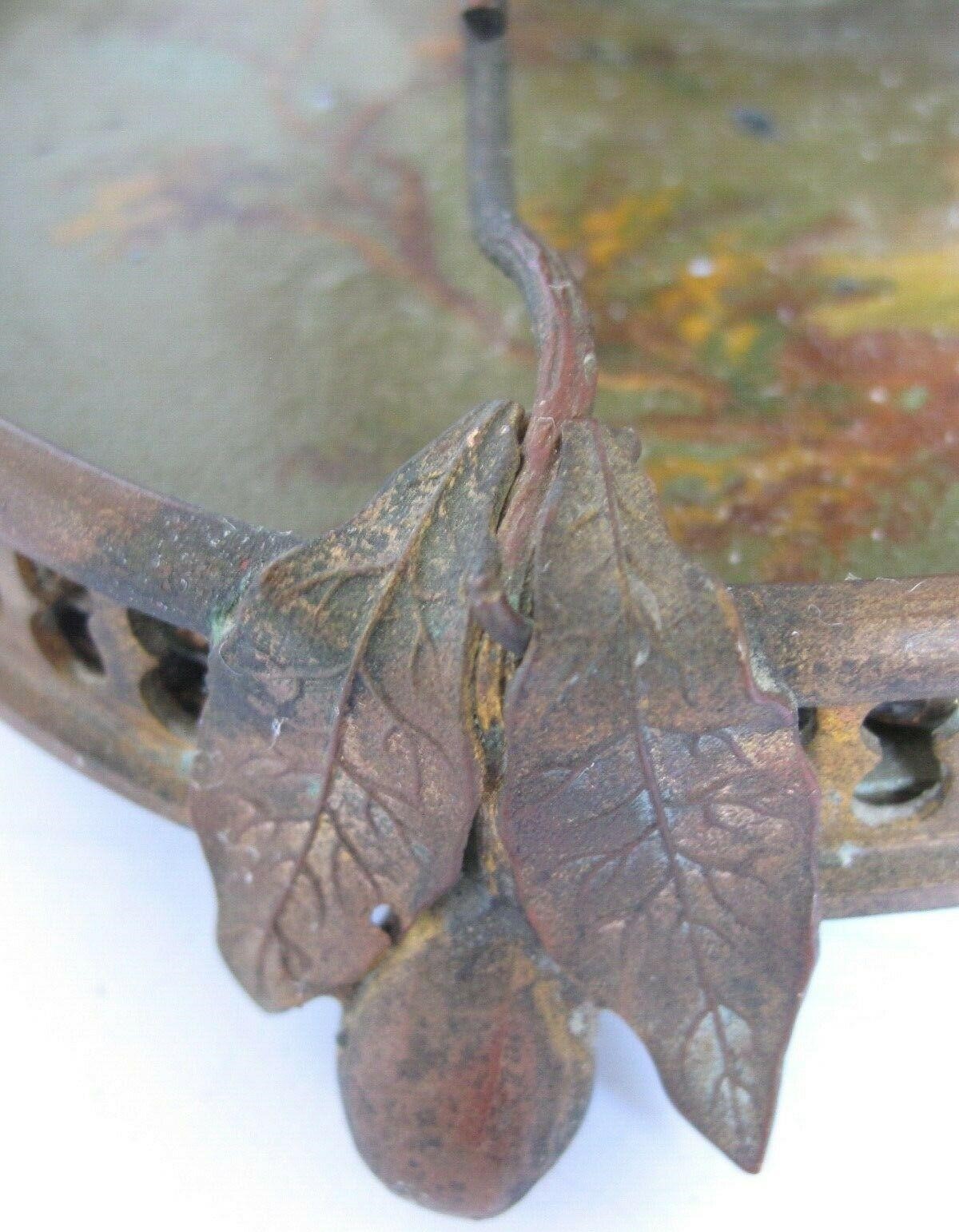 Each inkstand has a bronze galleried edge with attached pen hooks in the form of leaves set on fruit form feet. The inkwells have hinged lids with either leaf or flower finials.