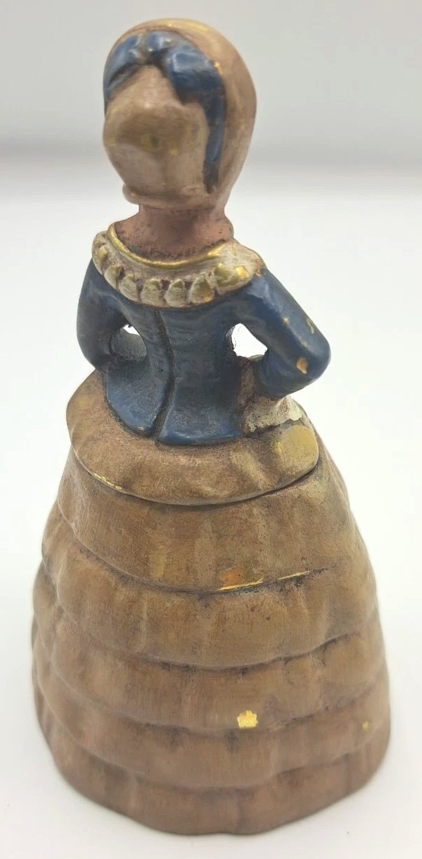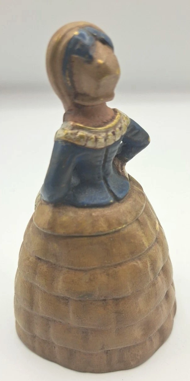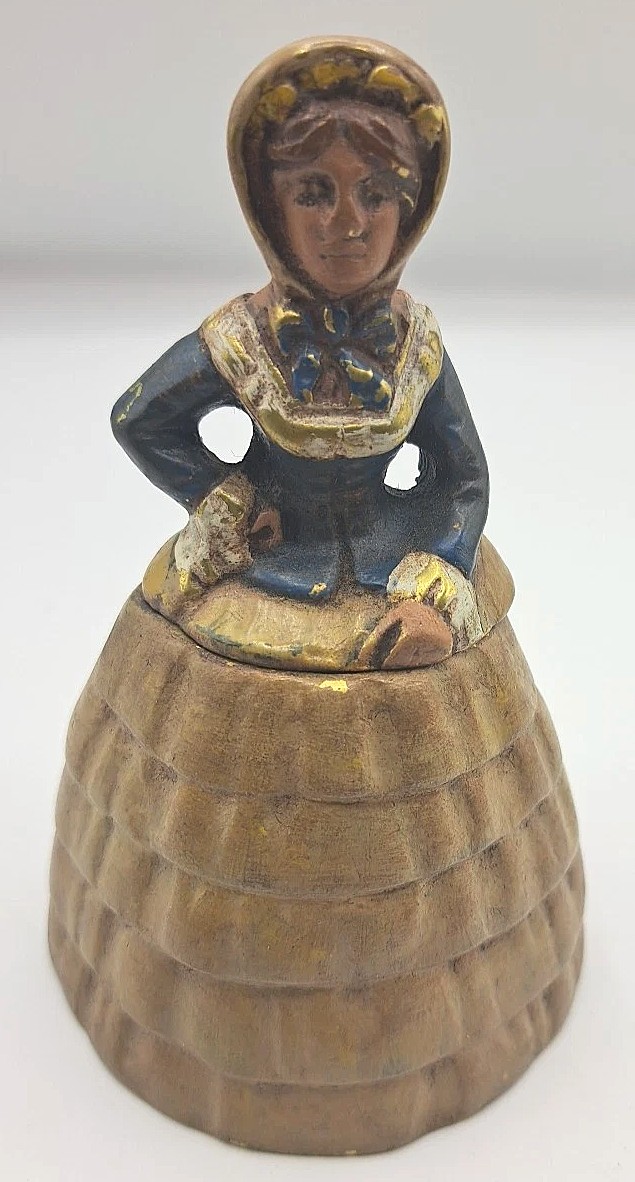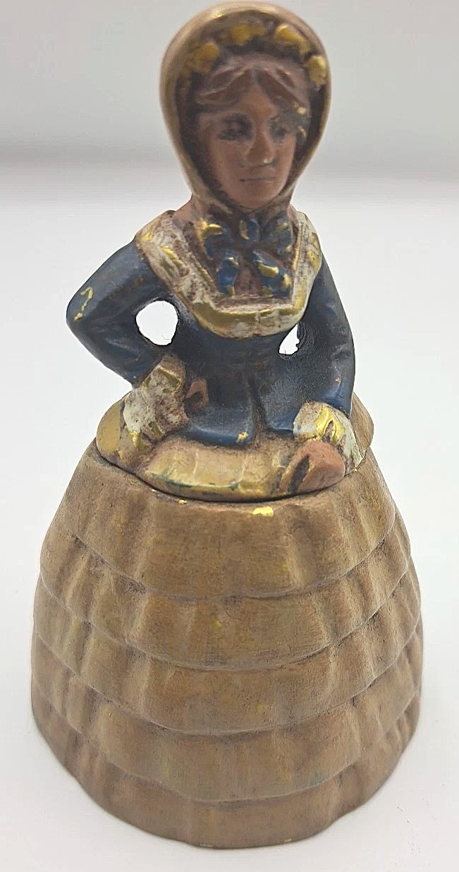 This is a figural inkwell made of cast brass with a painted finish. The piece is designed in the shape of a standing woman whose skirt forms the body of the inkwell. The upper part of her body, from the waist up, is attached to the base by a hinge, allowing it to swivel open to access the inkwell housed in the hollow skirt. Her attire includes a fitted bodice and a bonnet.